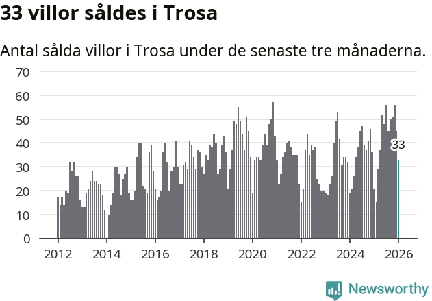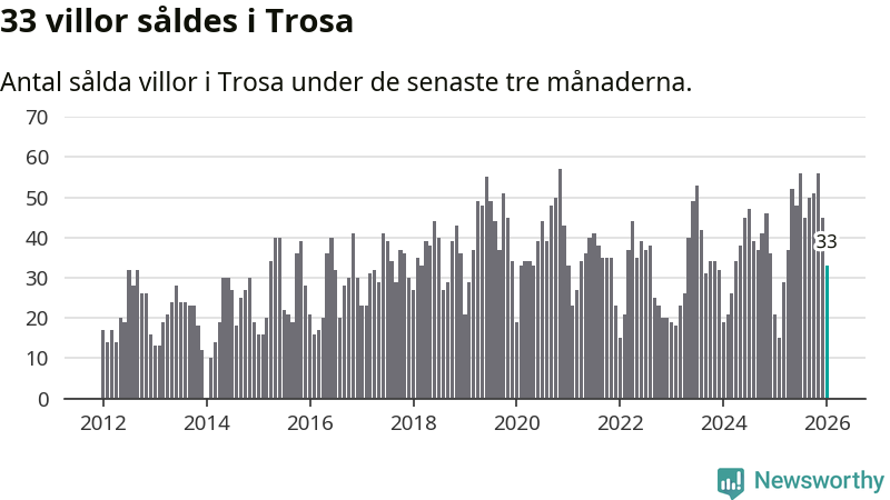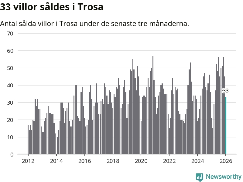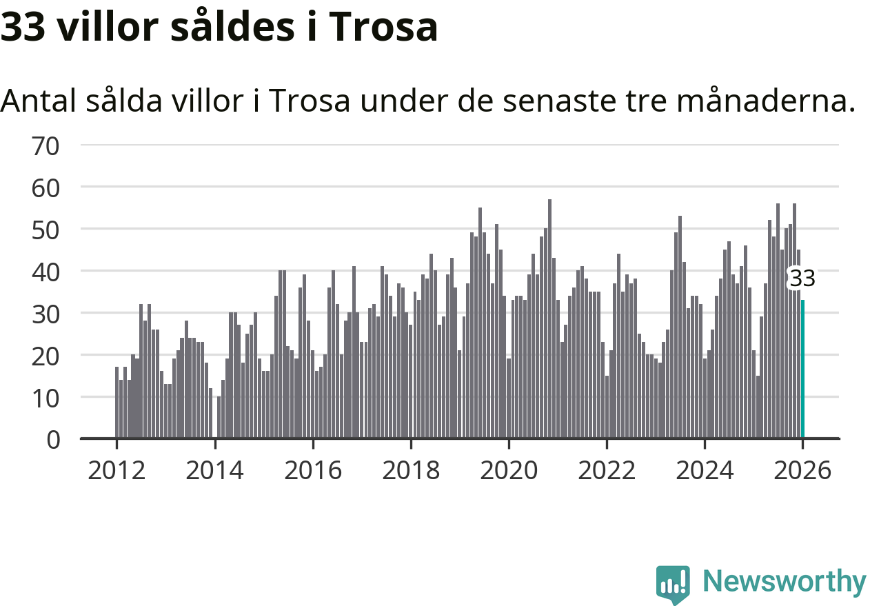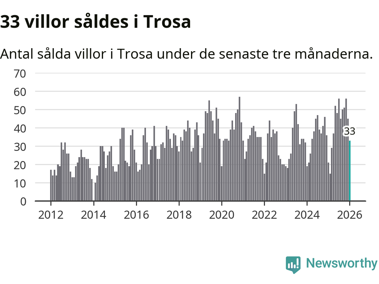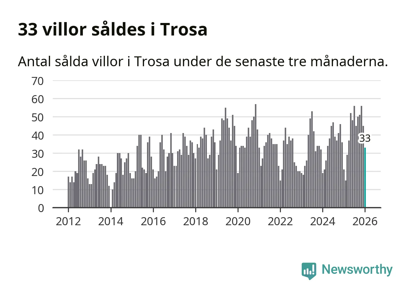 Mellan november och januari gjordes sammanlagt 33 affärer med villor i Trosa kommun. Det kan jämföras med 21 vid motsvarande tid i fjol.