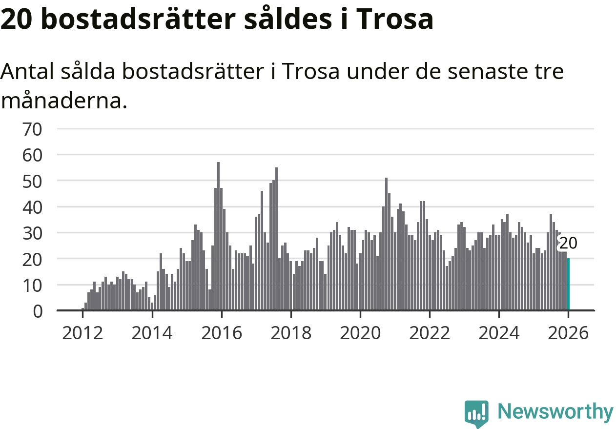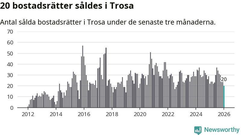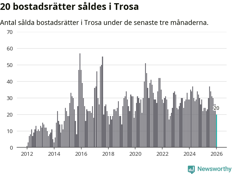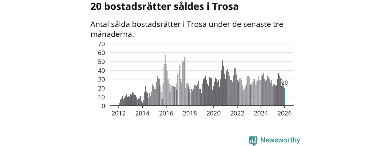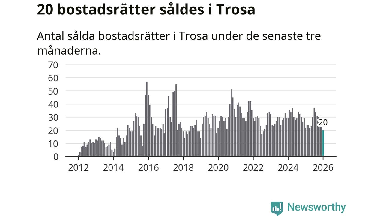 Mellan november och januari såldes 20 bostadsrätter i Trosa kommun. Det är färre än någon tremånadersperiod sedan 2022.
