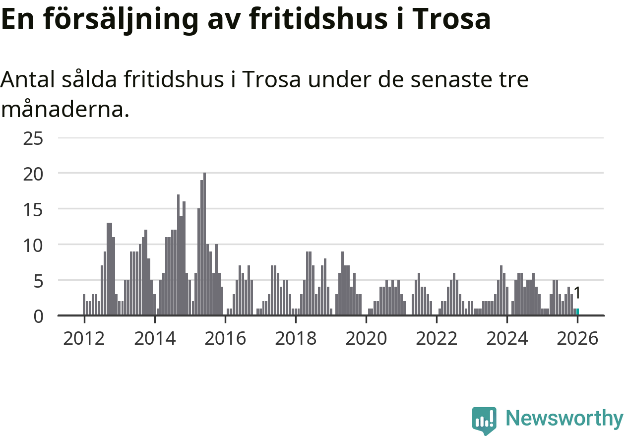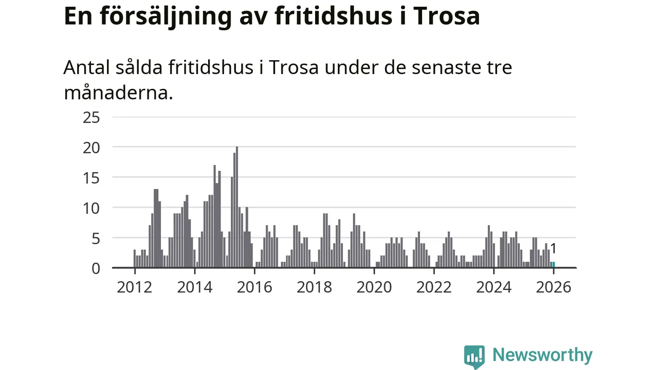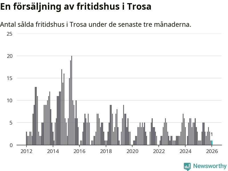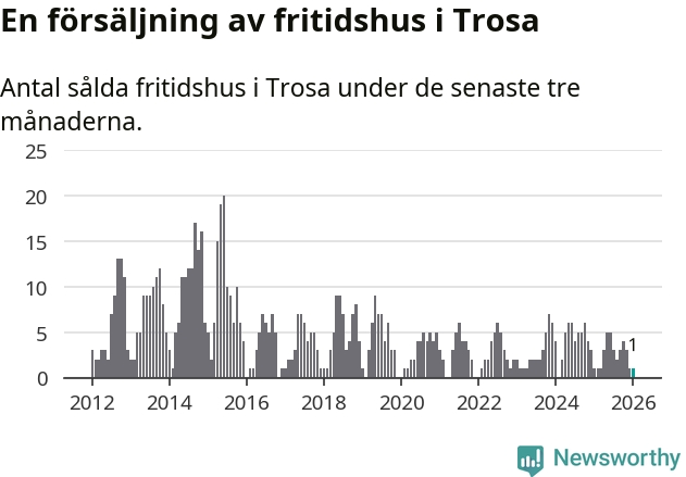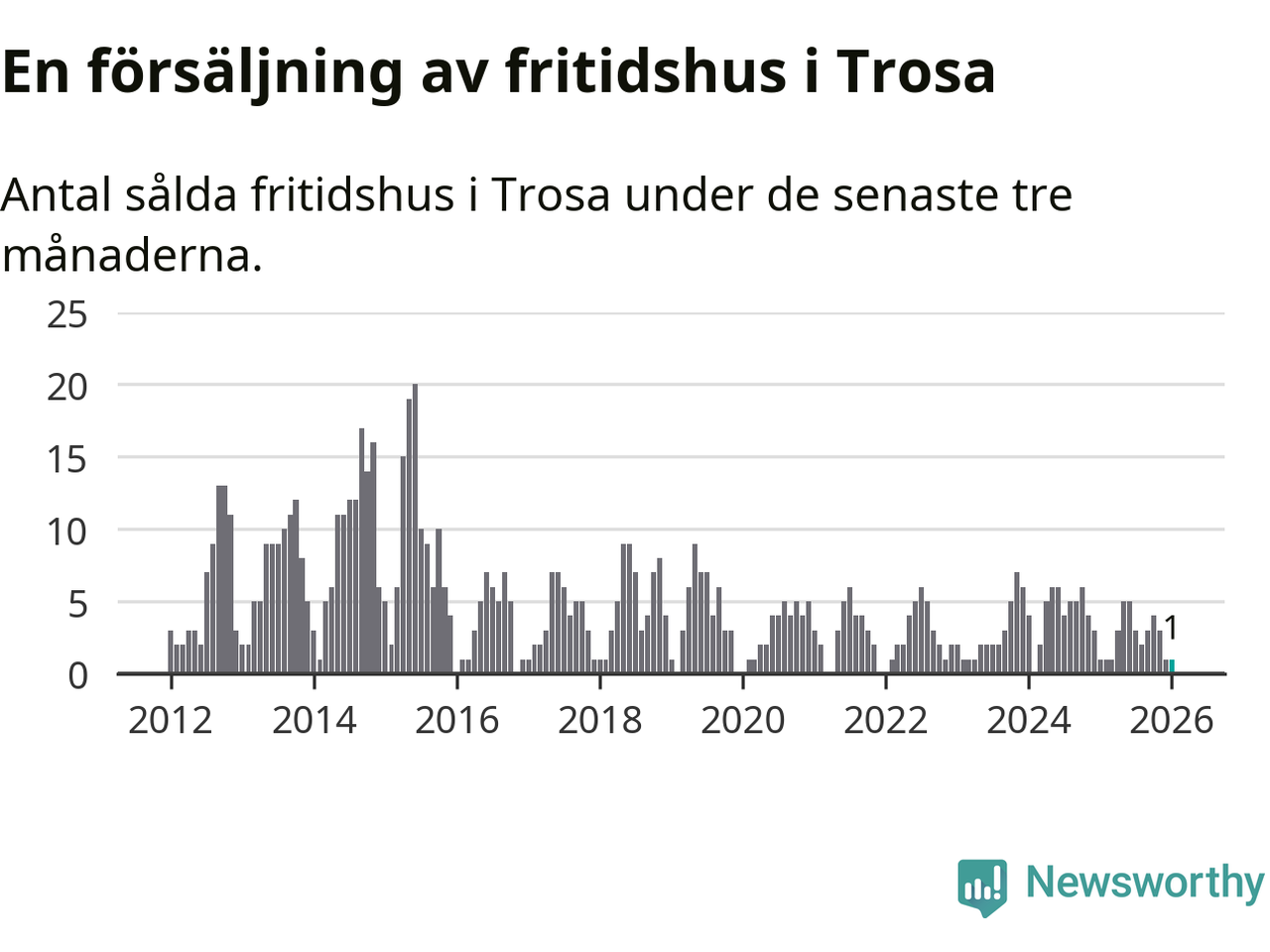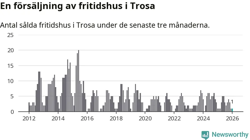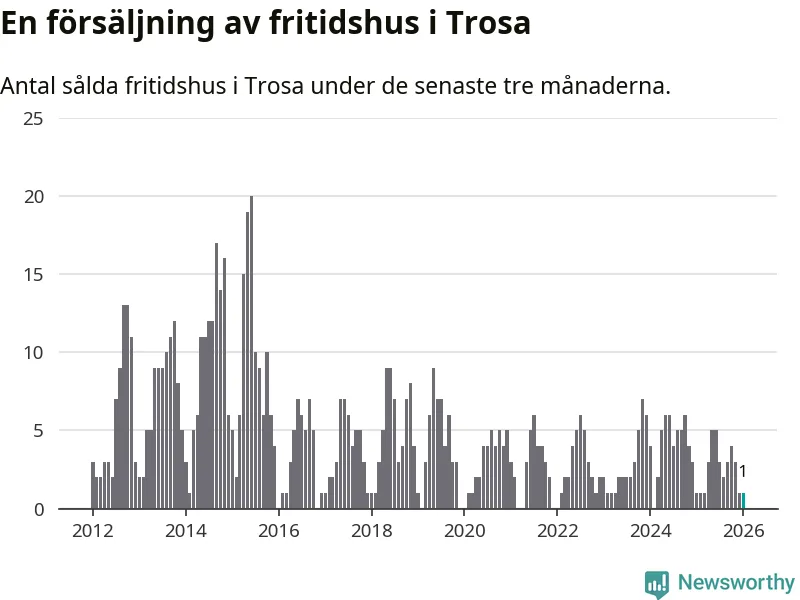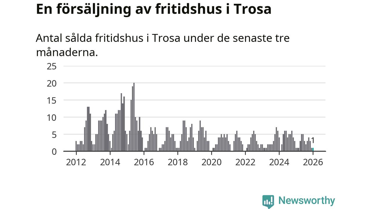 Mellan november och januari gjordes sammanlagt en affär med fritidshus i Trosa kommun. Det är lika många affärer som vid motsvarande tid i fjol.