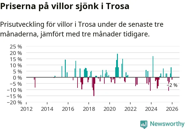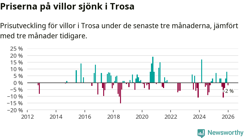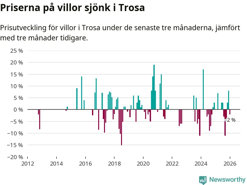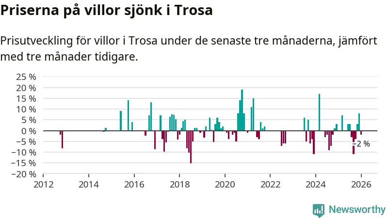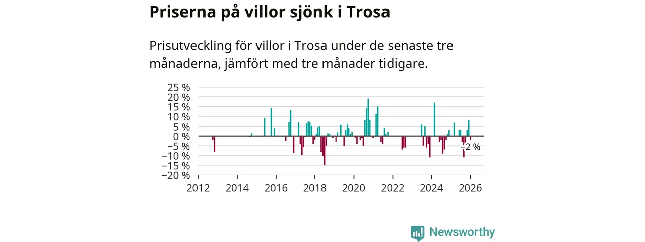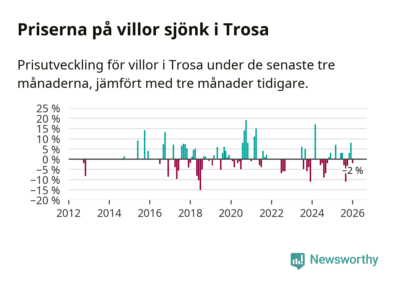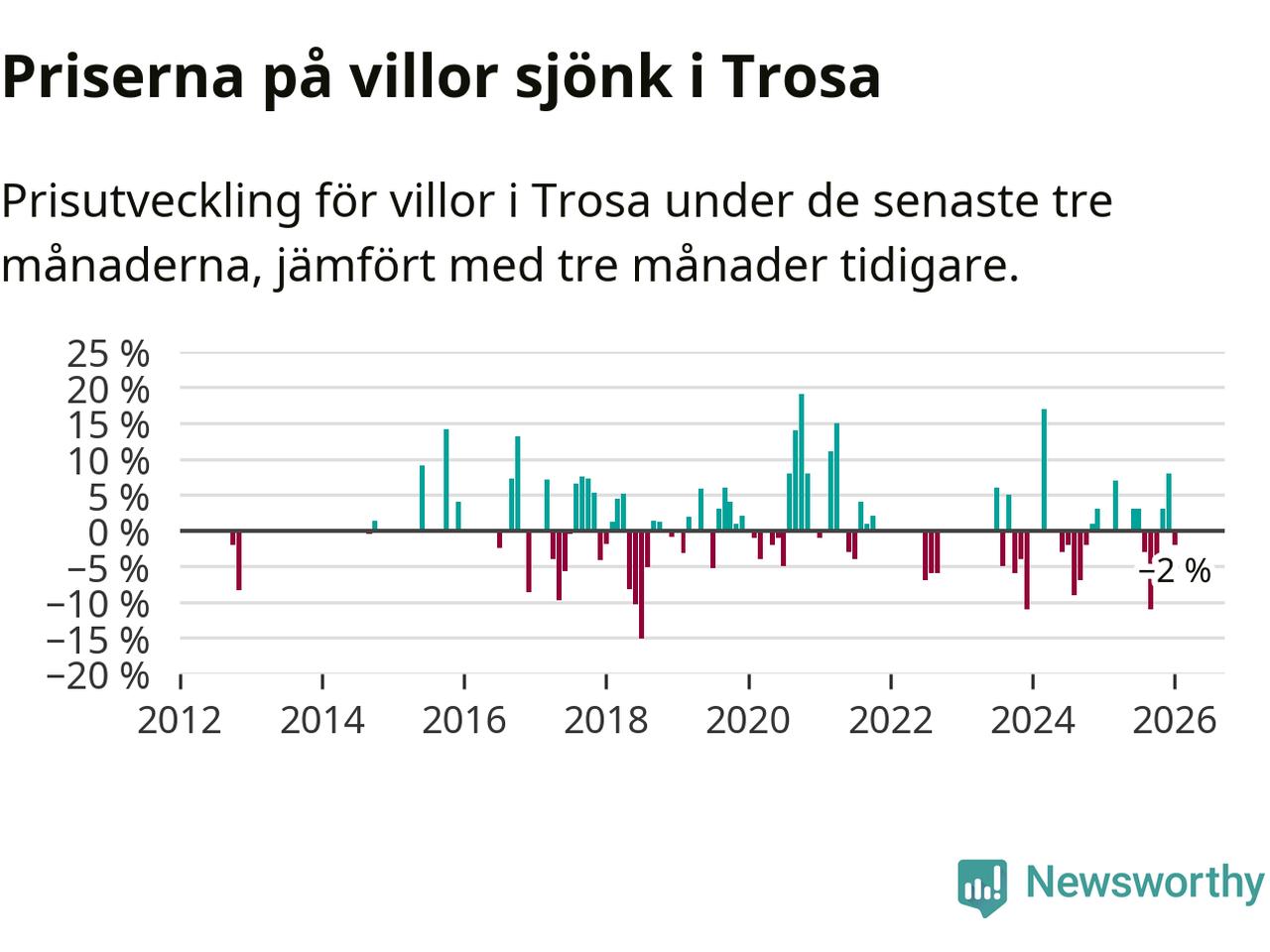 Statistiken visar även på en prisnedgång i Trosa kommun. Medelpriset på försäljningarna av villor i kommunen var 2 procent lägre än för tre månader sedan. I hela Södermanland däremot ökar villapriserna. I hela länet noterades en prisuppgång på 2 procent.