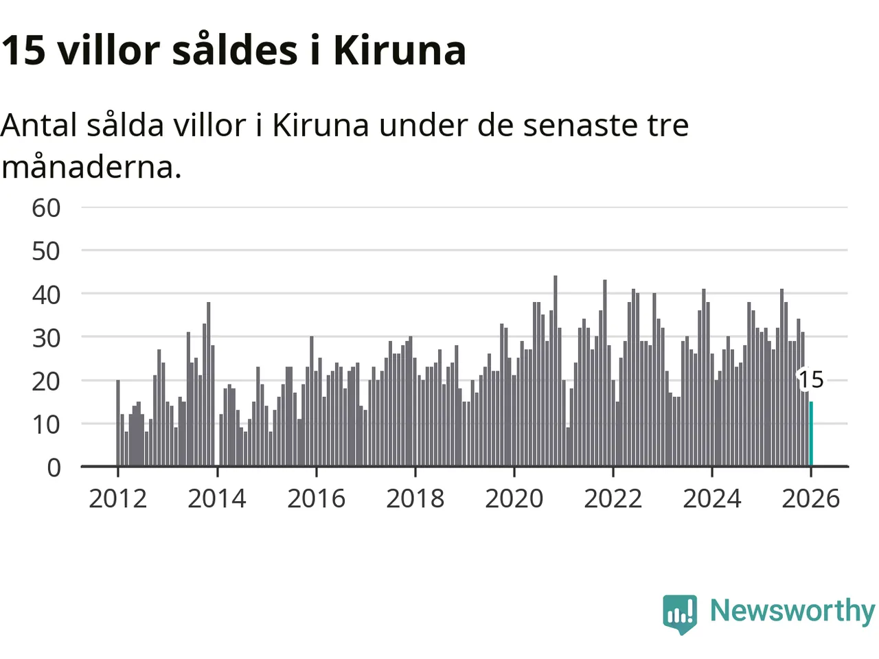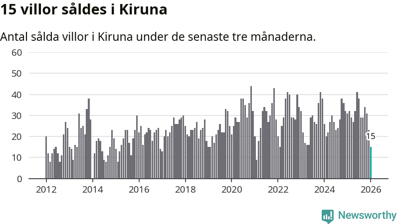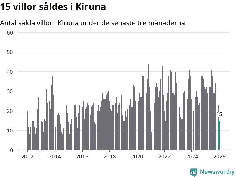 Mellan november och januari gjordes sammanlagt 15 affärer med villor i Kiruna kommun. Det kan jämföras med 31 vid motsvarande tid i fjol.