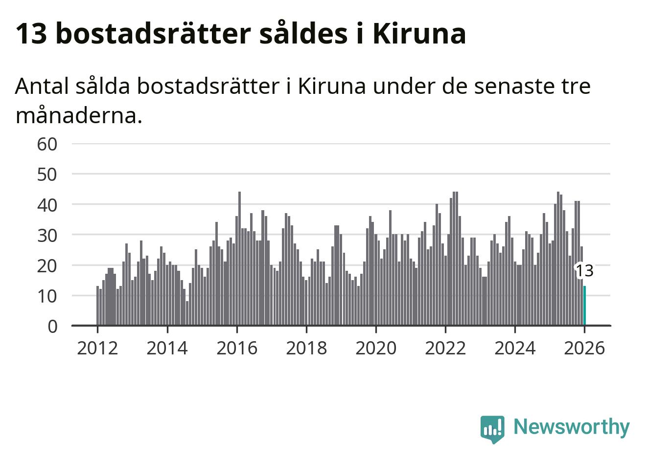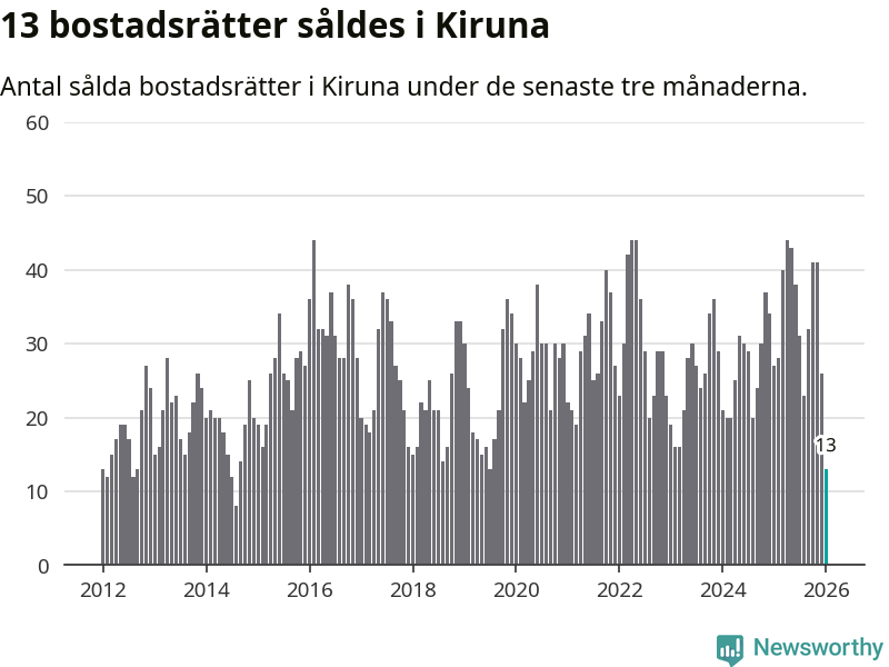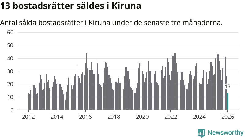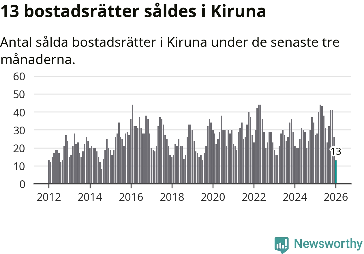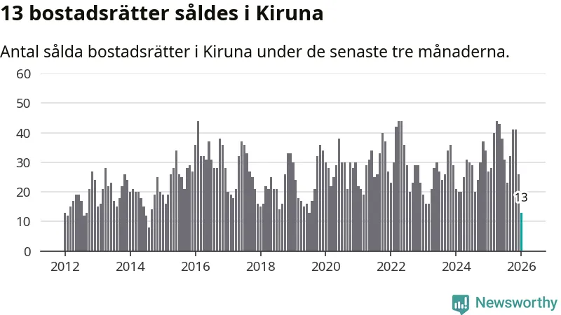 Mellan november och januari gjordes sammanlagt 13 affärer med bostadsrätter i Kiruna kommun. Det kan jämföras med 27 vid motsvarande tid i fjol.