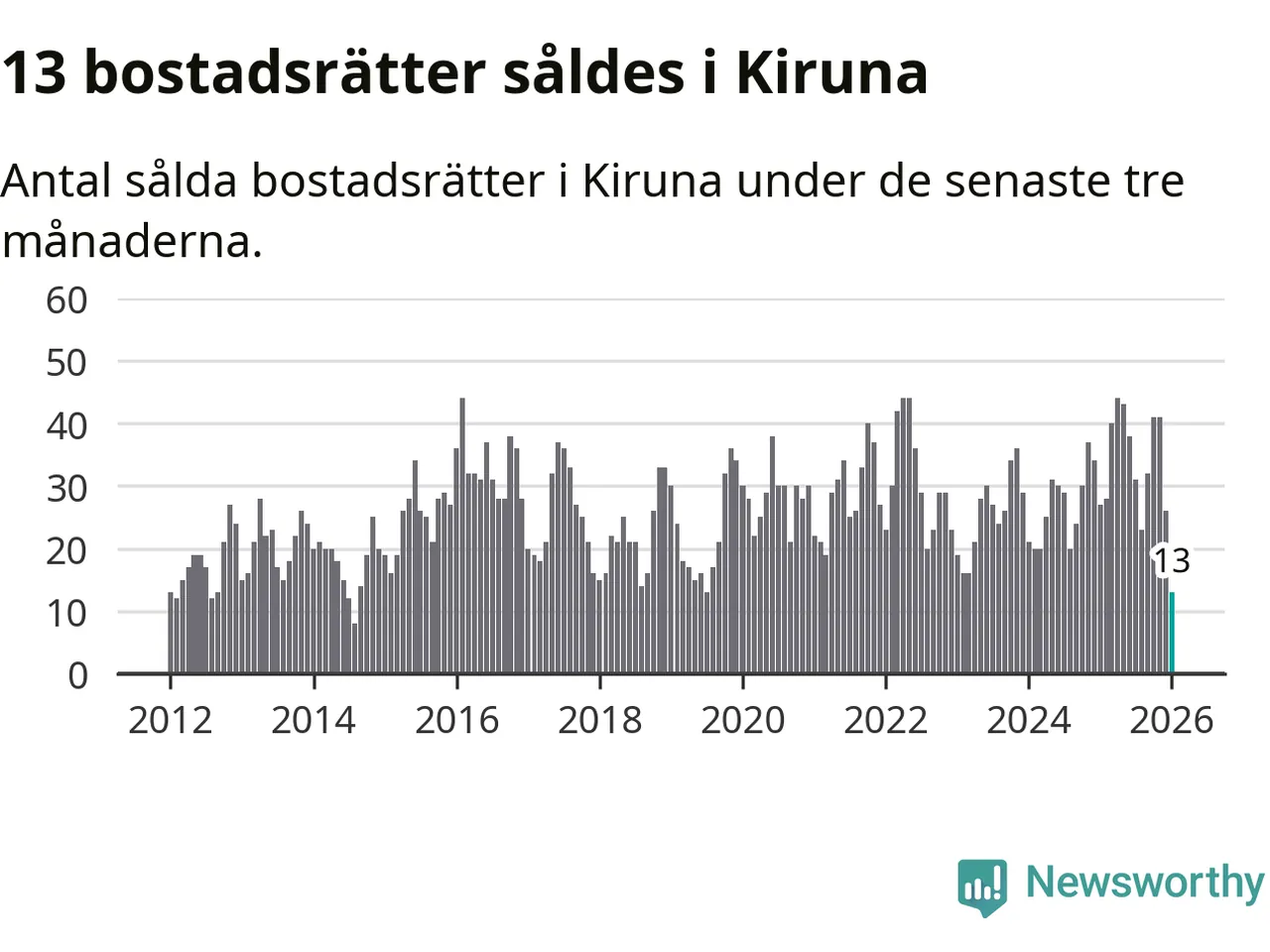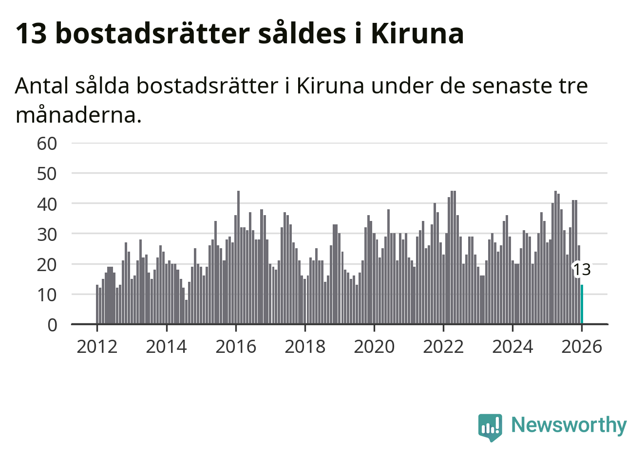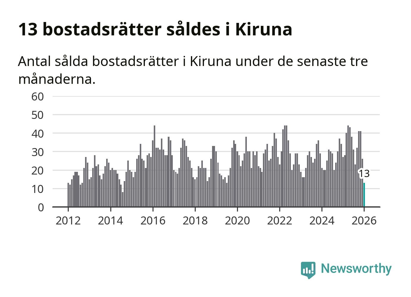 Mellan november och januari gjordes sammanlagt 13 affärer med bostadsrätter i Kiruna kommun. Det kan jämföras med 27 vid motsvarande tid i fjol.