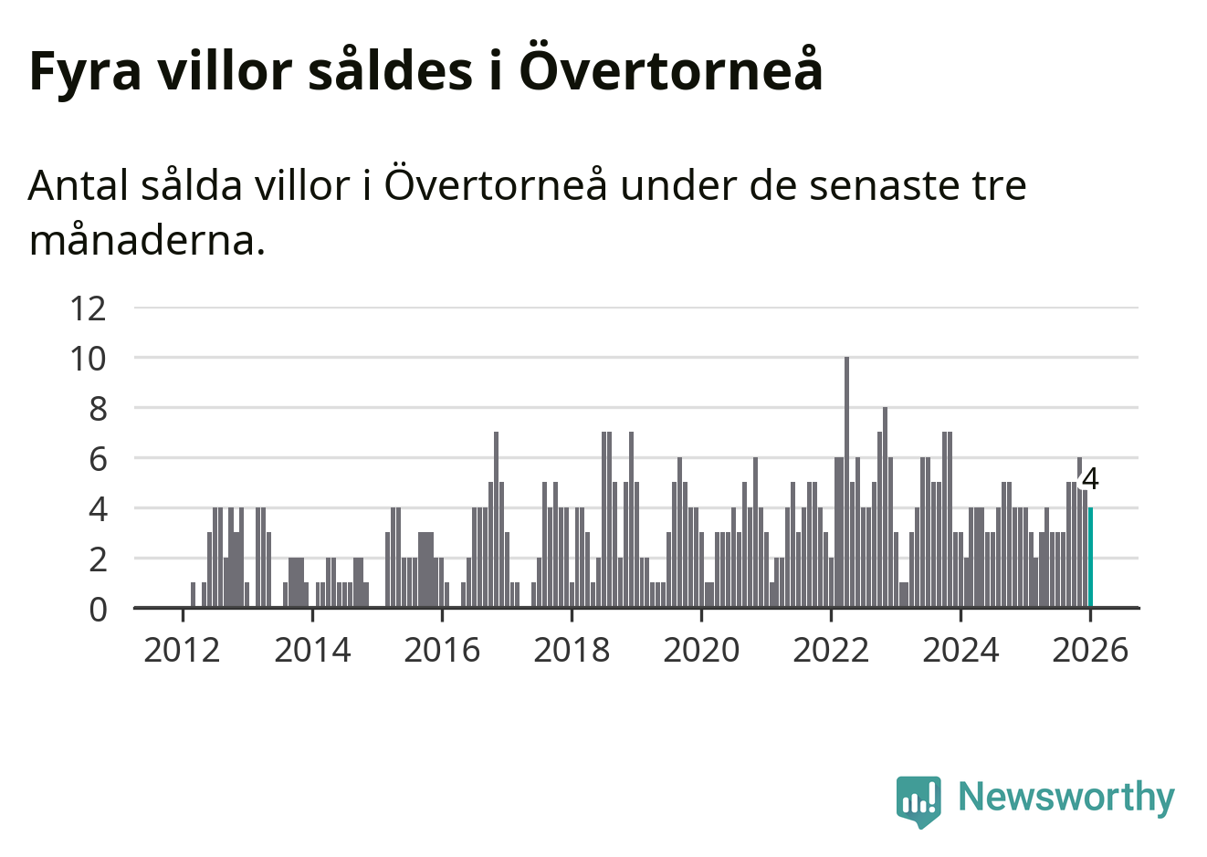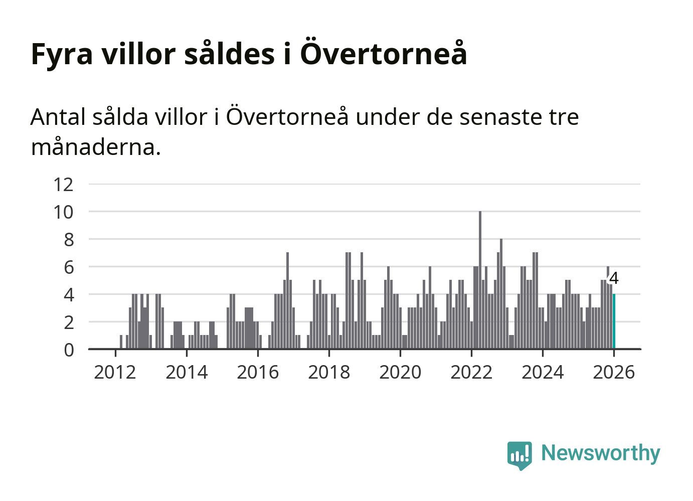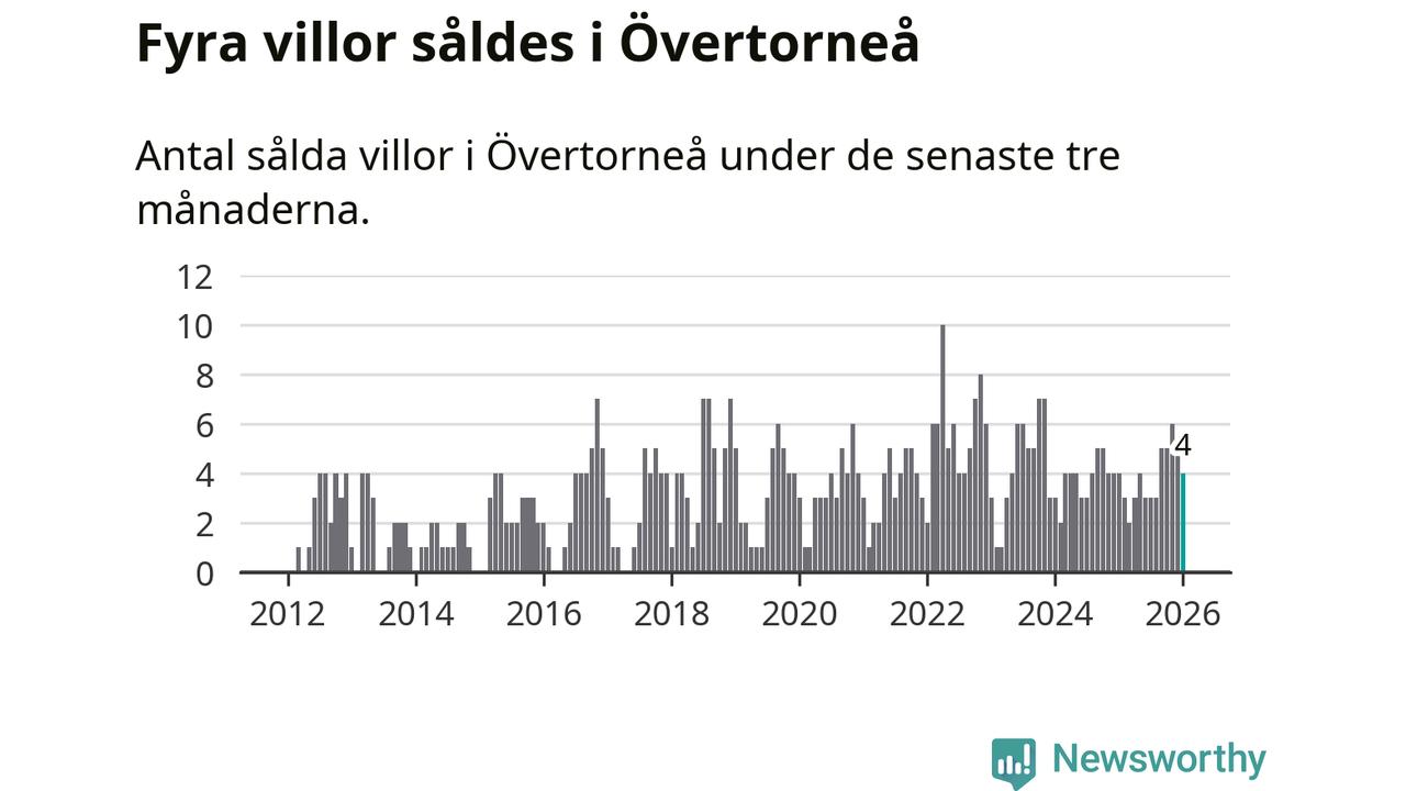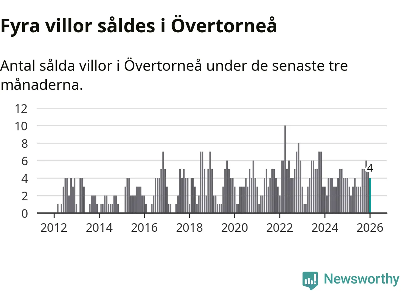 Mellan november och januari gjordes sammanlagt fyra affärer med villor i Övertorneå kommun. Det är lika många affärer som vid motsvarande tid i fjol.