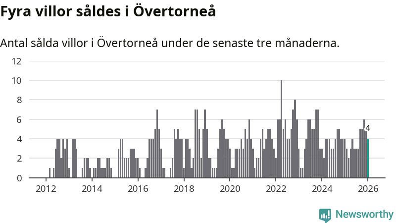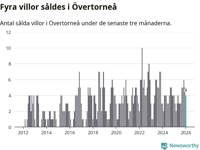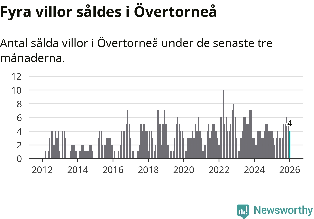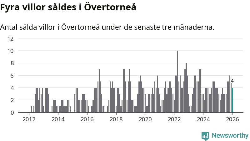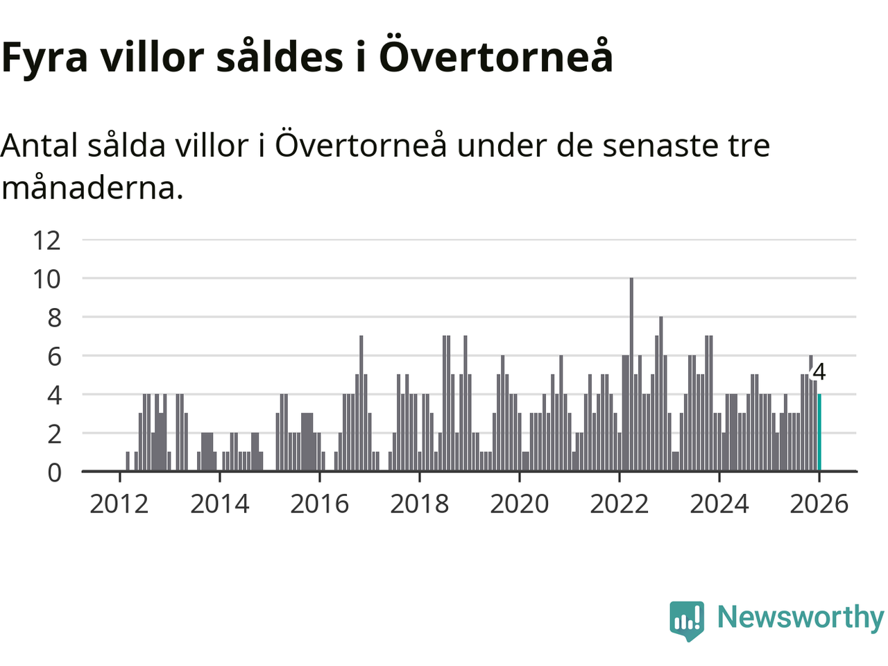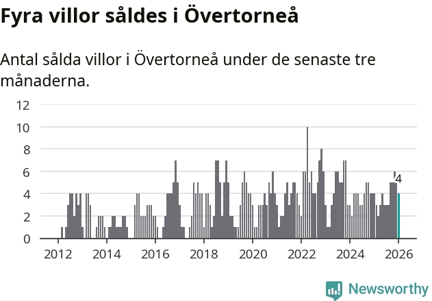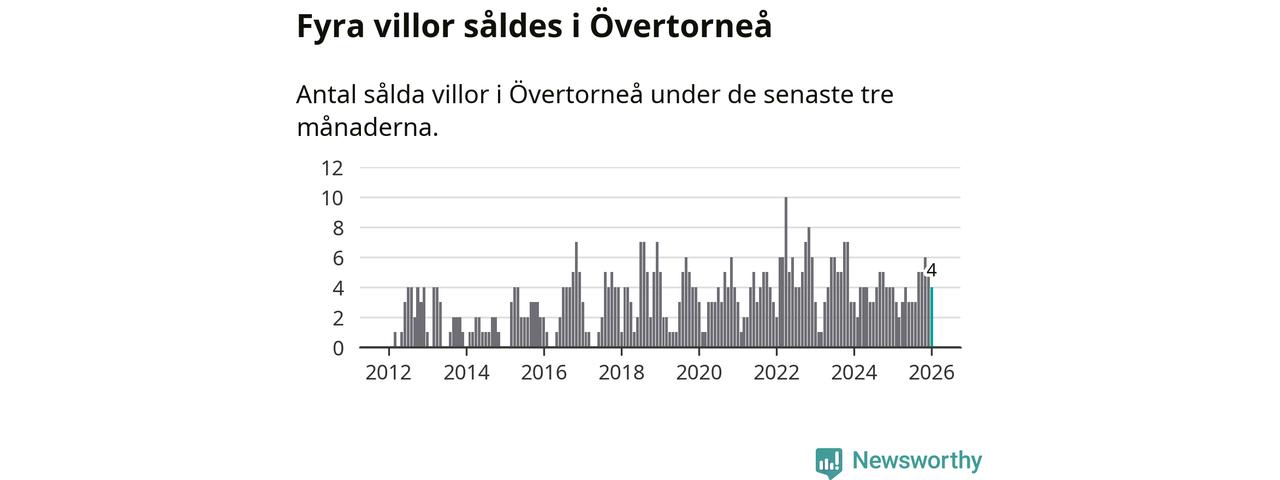 Mellan november och januari gjordes sammanlagt fyra affärer med villor i Övertorneå kommun. Det är lika många affärer som vid motsvarande tid i fjol.