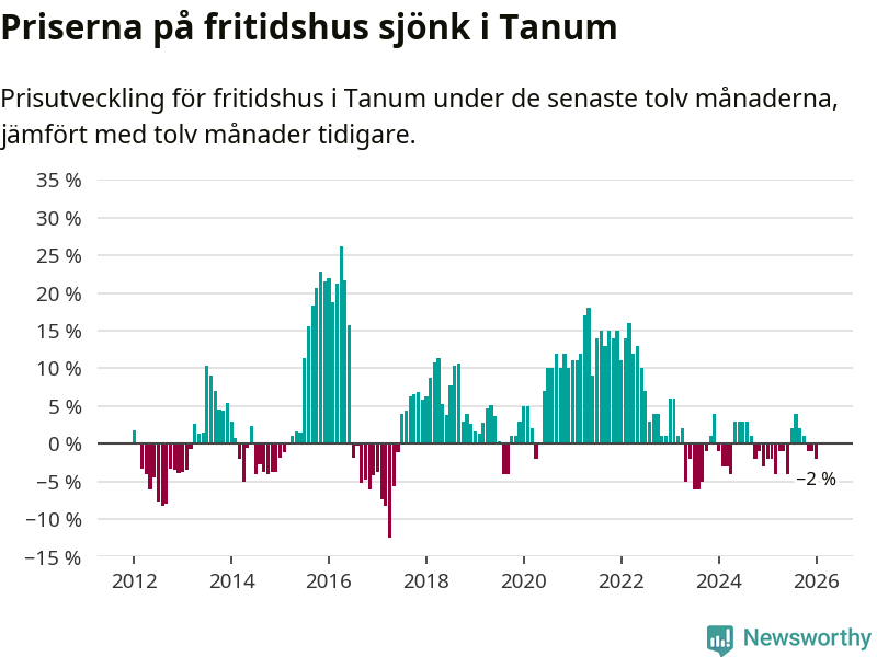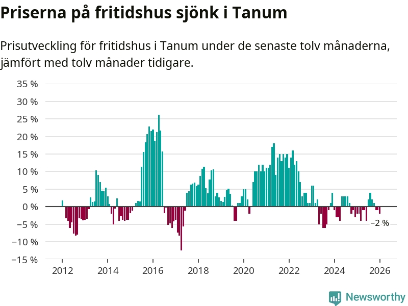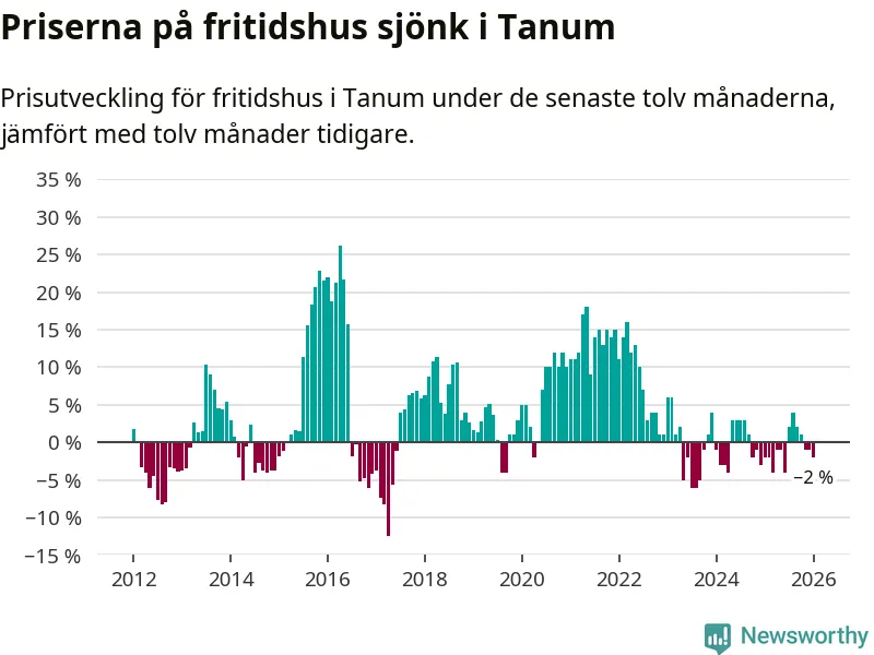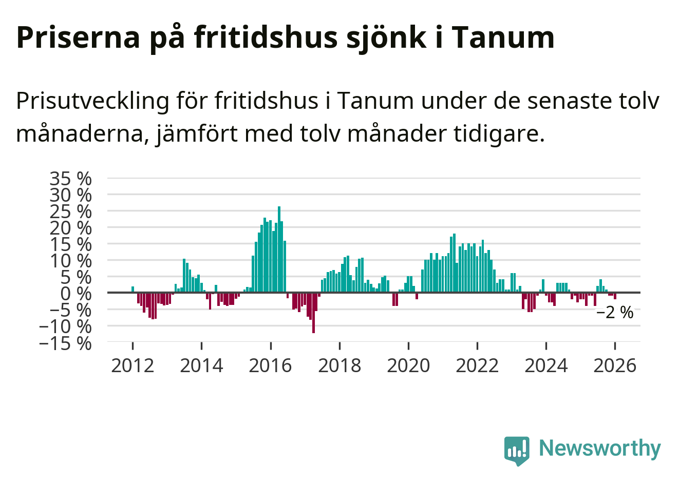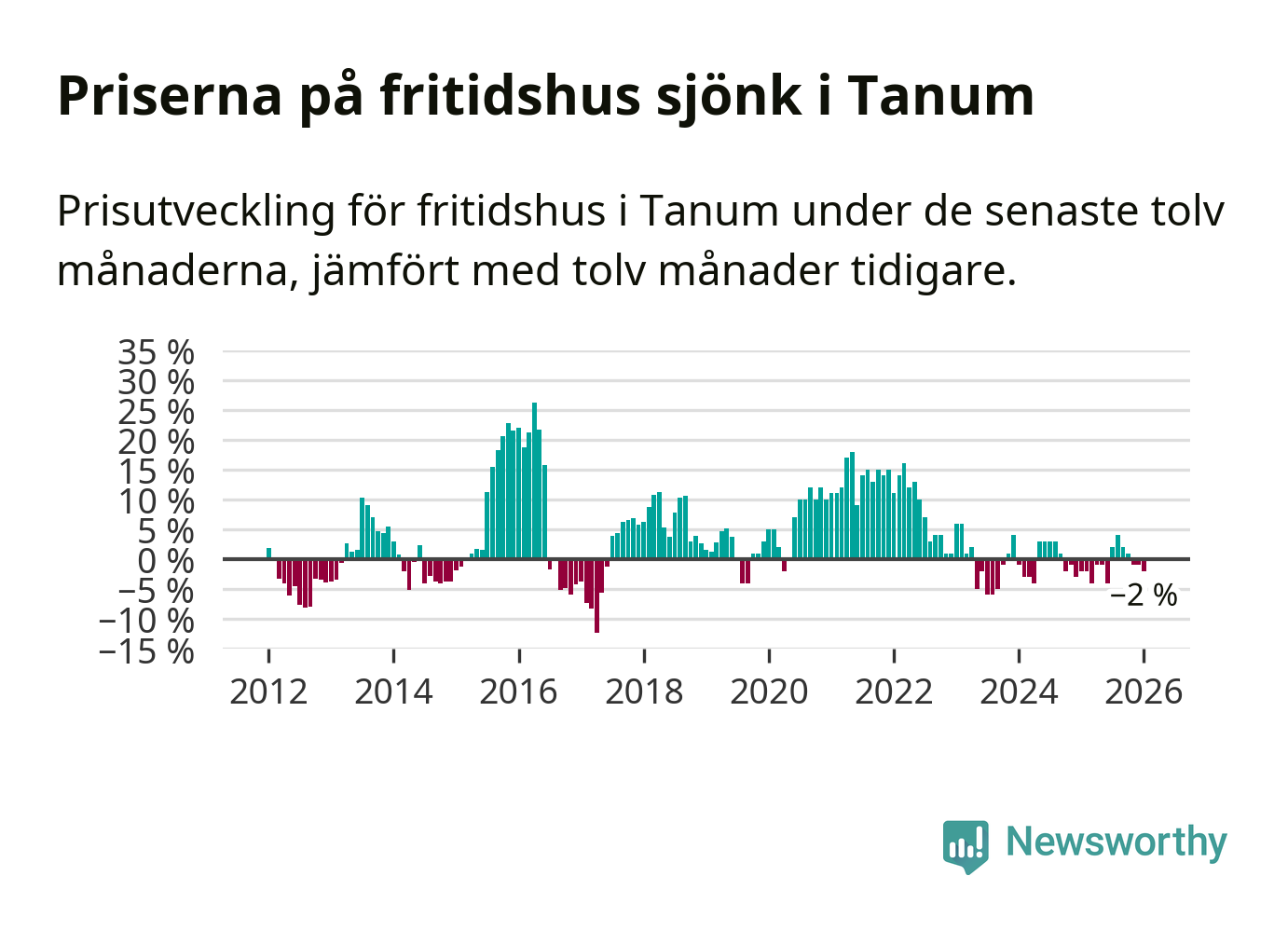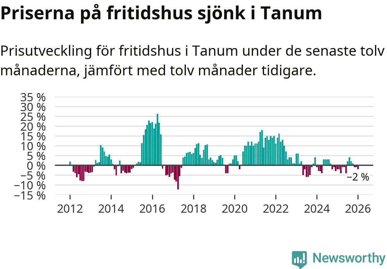 Priserna på fritidshus har gått ner i Tanums kommun. Medelpriset på försäljningarna under de senaste tolv månaderna visar på en nedgång med 2 procent.