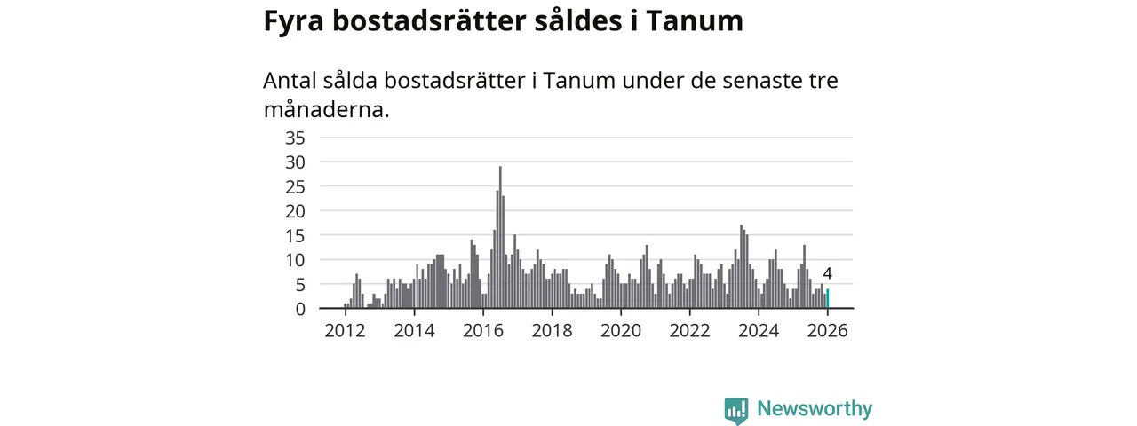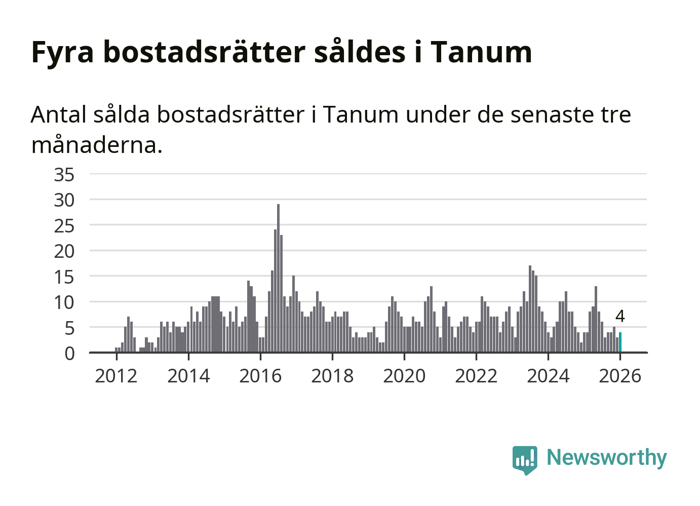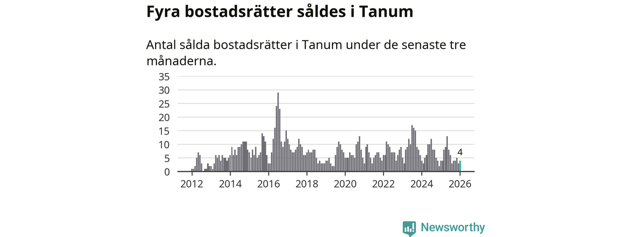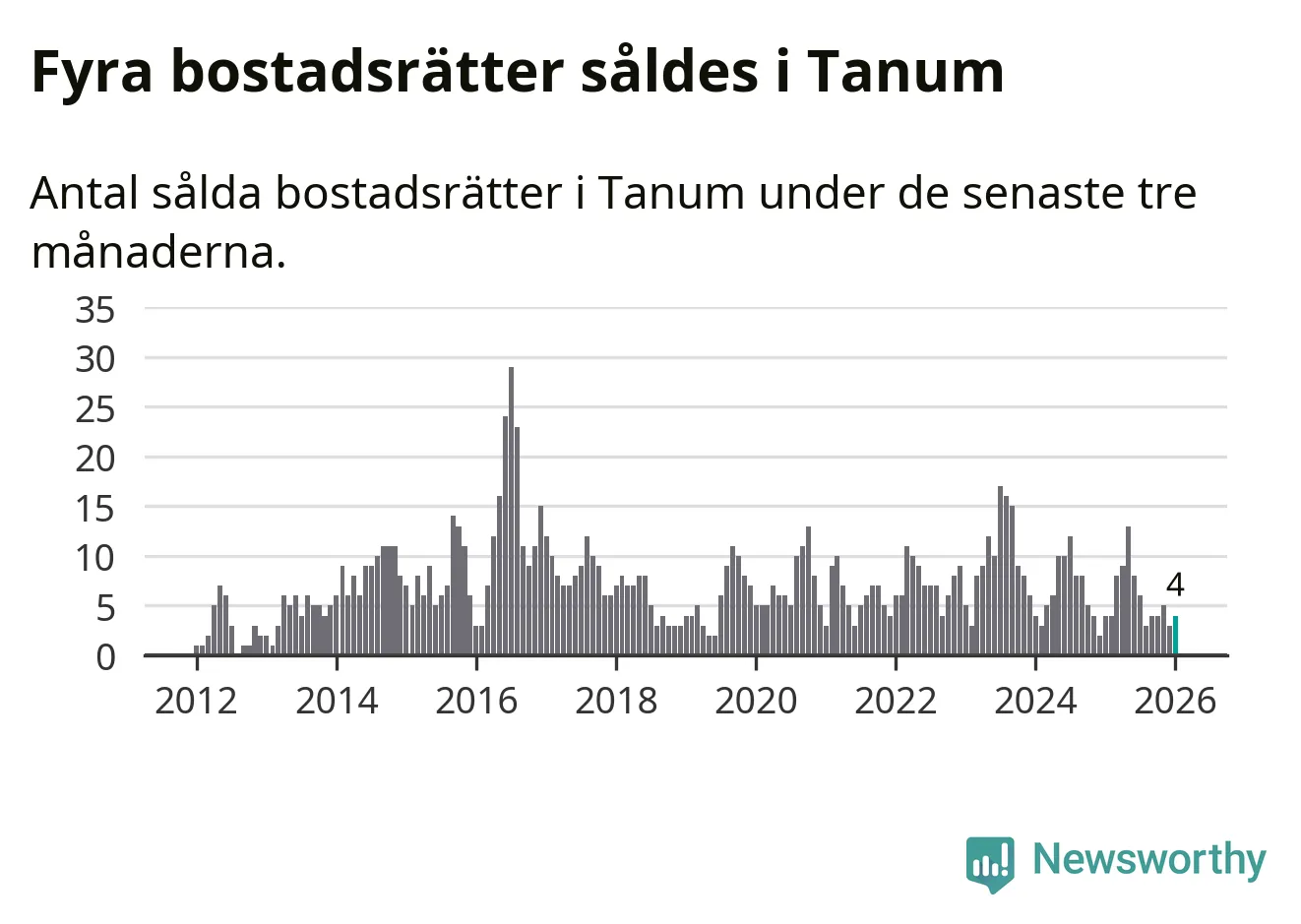 Mellan november och januari gjordes sammanlagt fyra affärer med bostadsrätter i Tanums kommun. Det är lika många affärer som vid motsvarande tid i fjol.