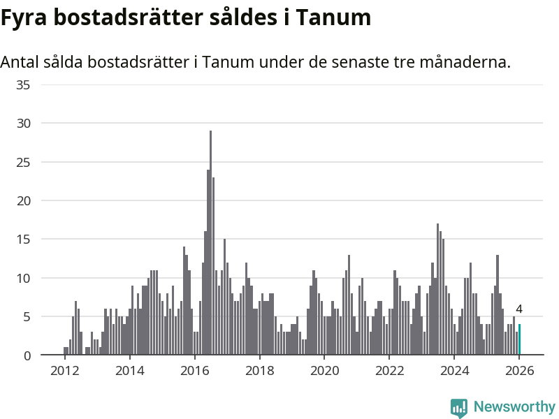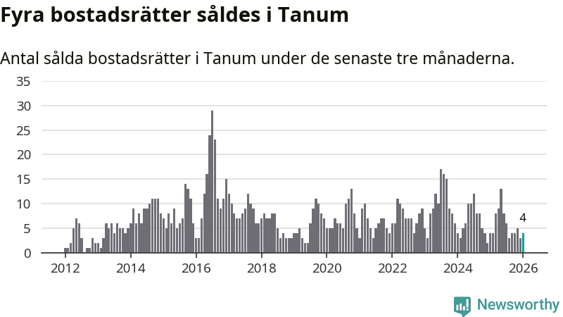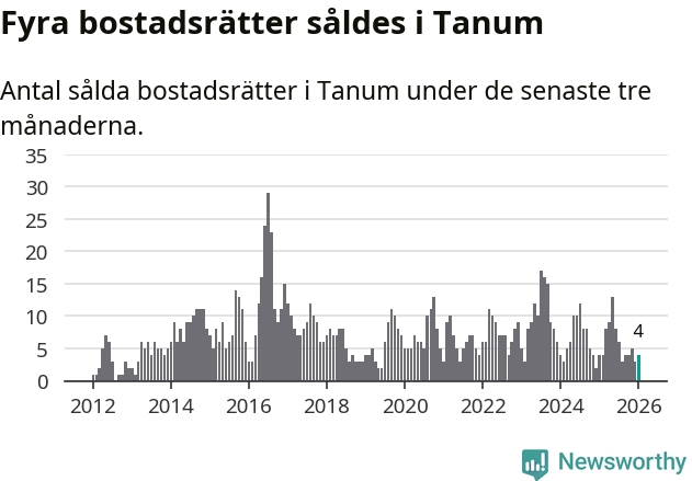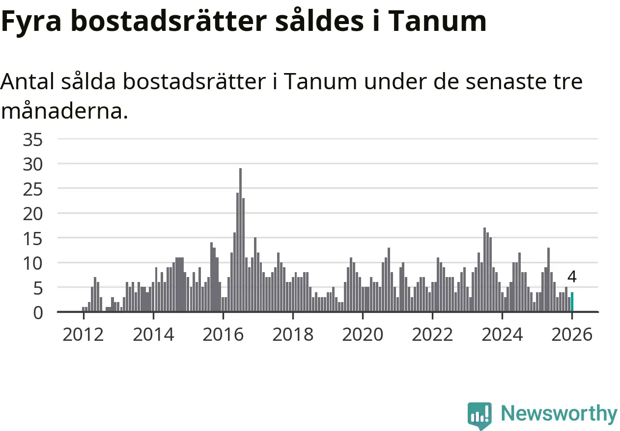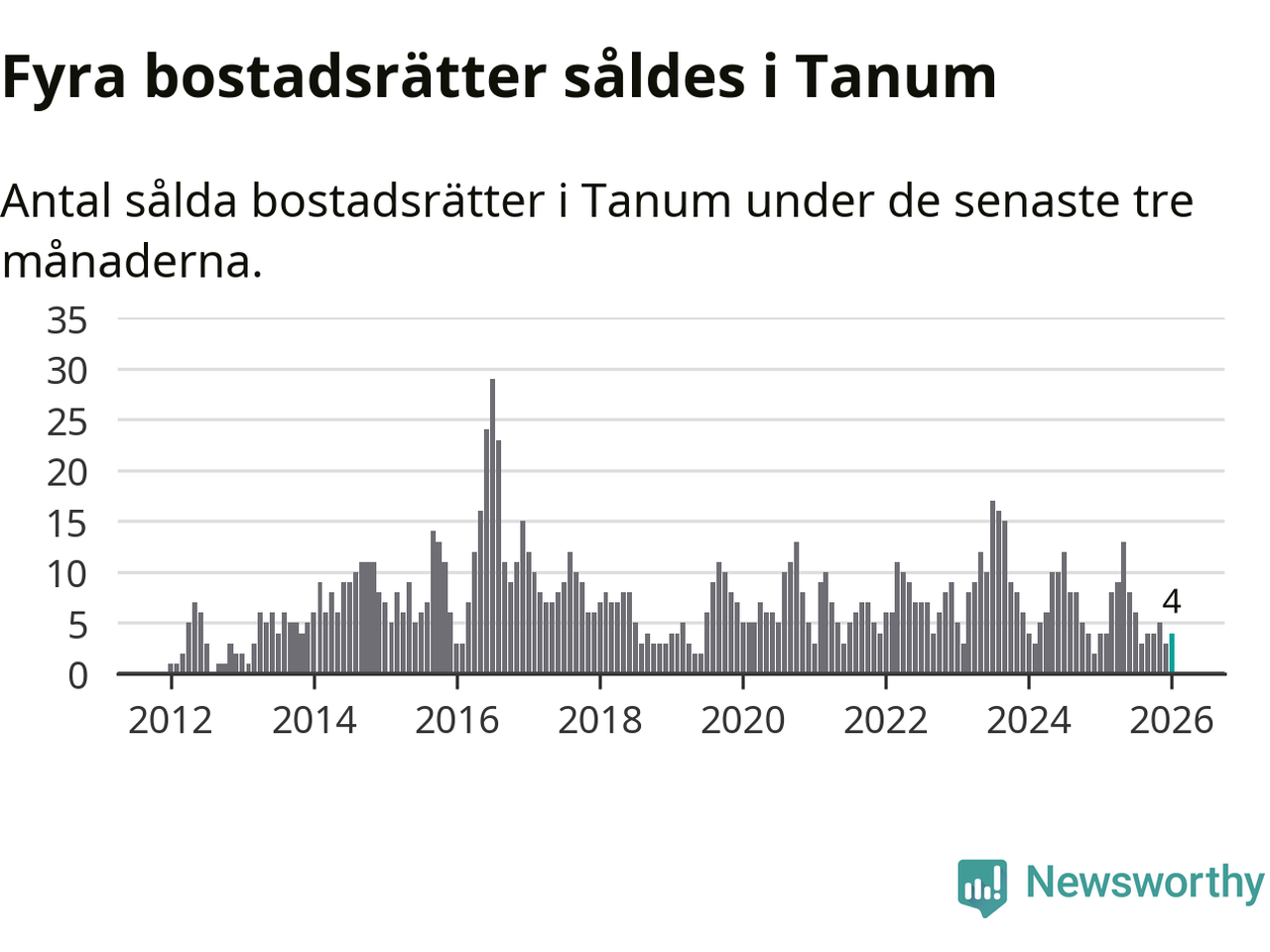 Mellan november och januari gjordes sammanlagt fyra affärer med bostadsrätter i Tanums kommun. Det är lika många affärer som vid motsvarande tid i fjol.