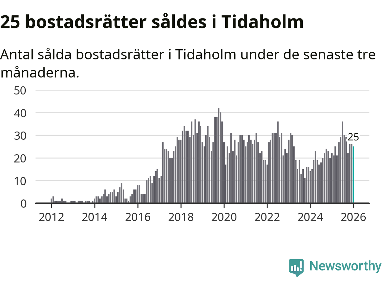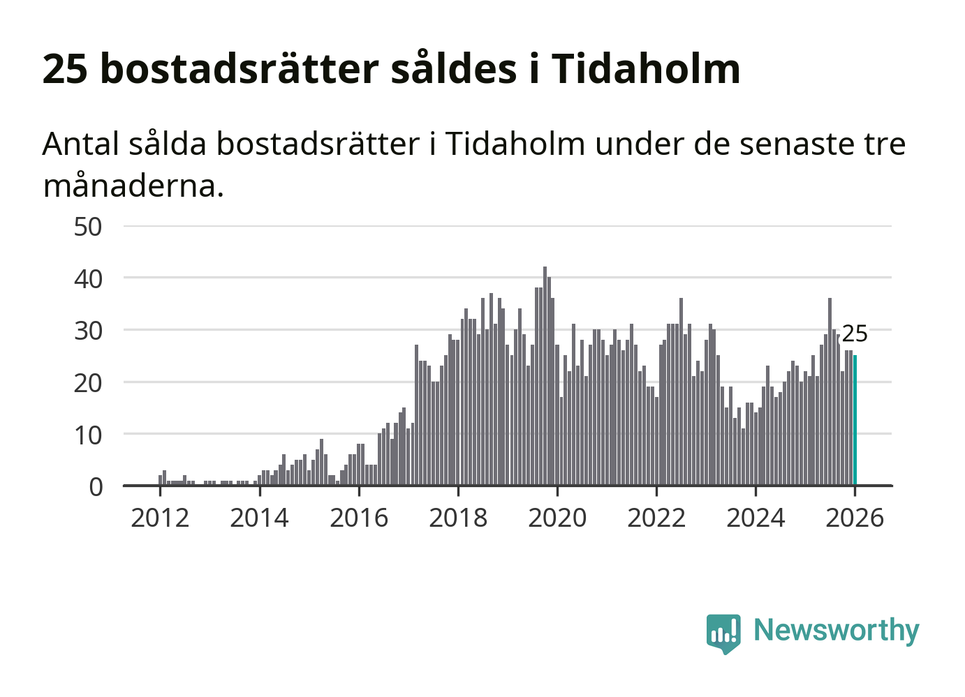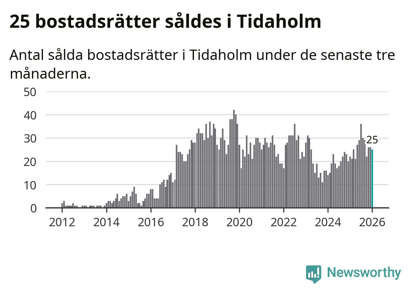 Mellan november och januari gjordes sammanlagt 25 affärer med bostadsrätter i Tidaholms kommun. Det kan jämföras med 22 vid motsvarande tid i fjol.