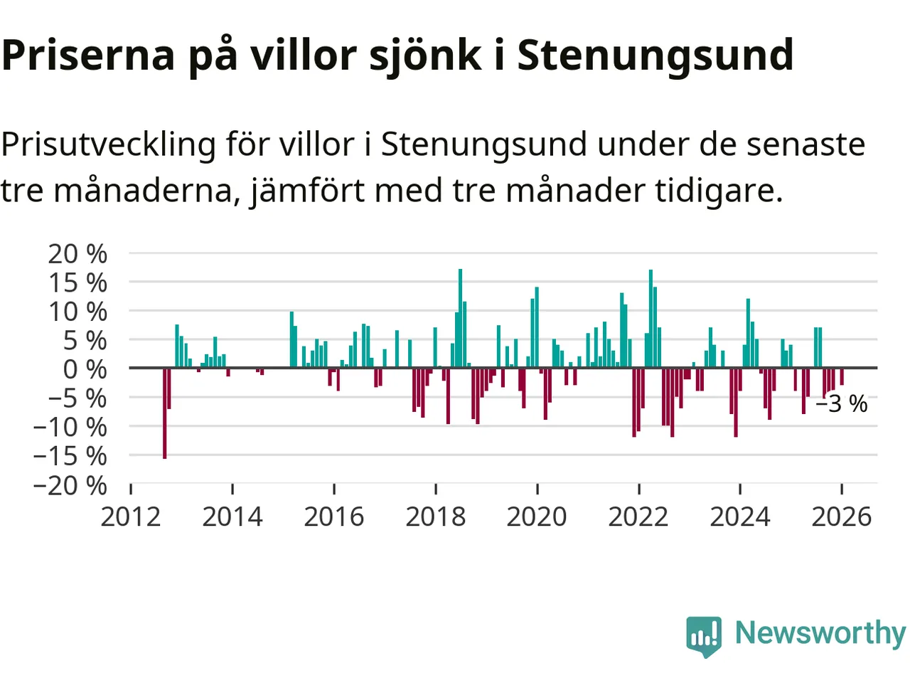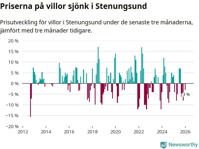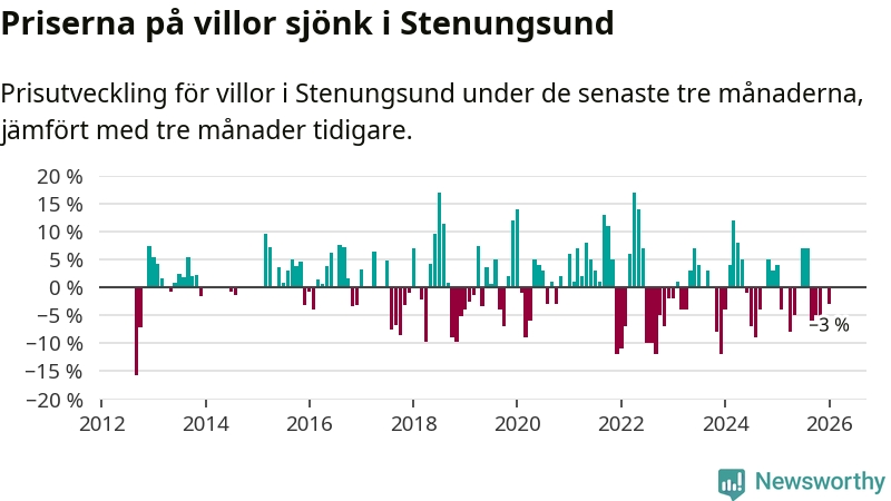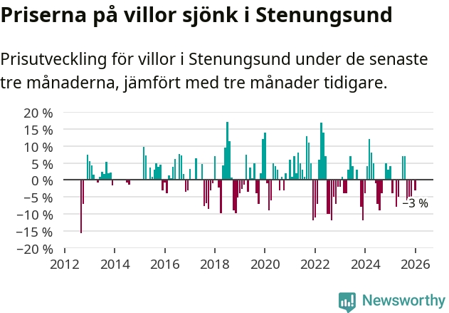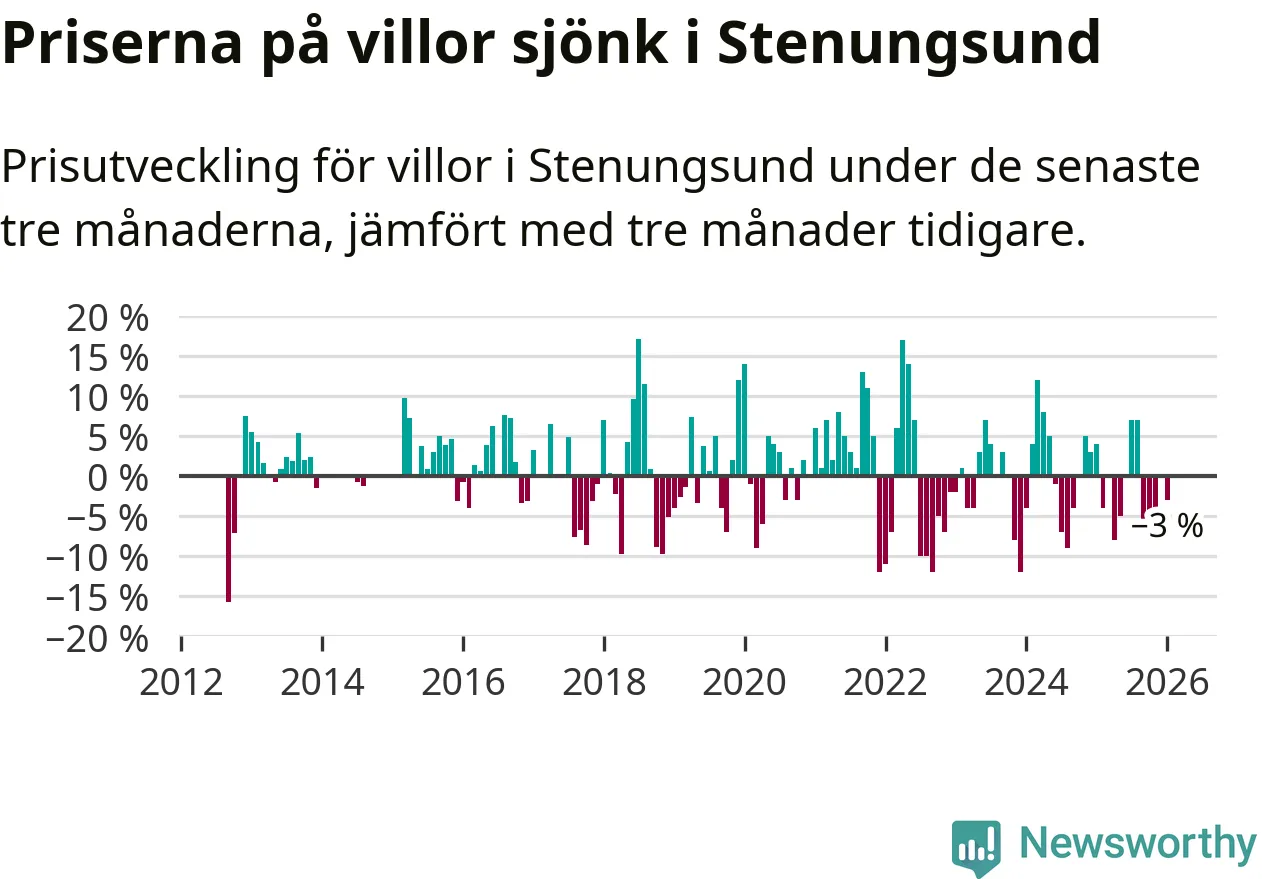 Villapriserna har gått ner i Stenungsunds kommun. Medelpriset på försäljningarna under de senaste tre månaderna visar på en nedgång med 3 procent.