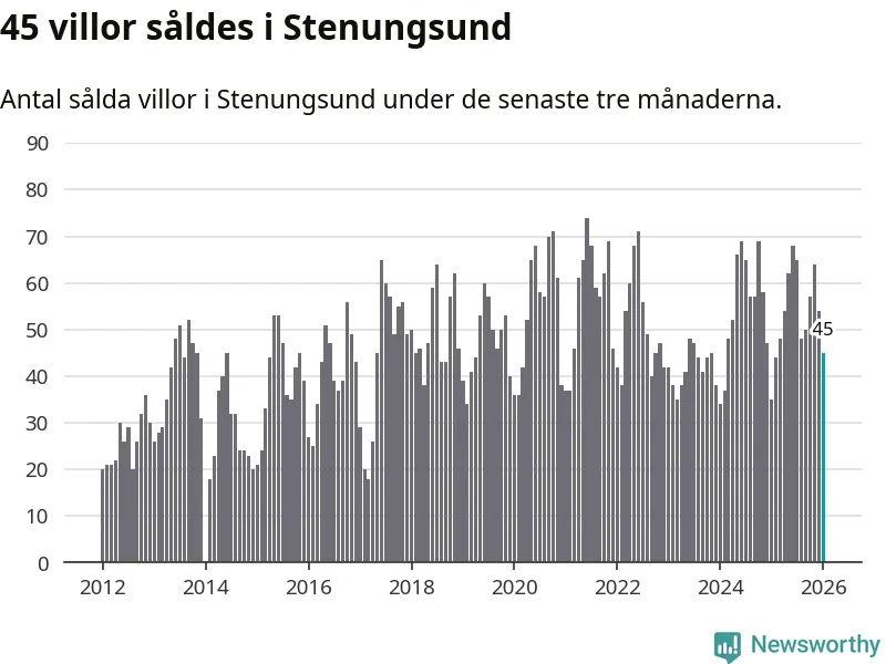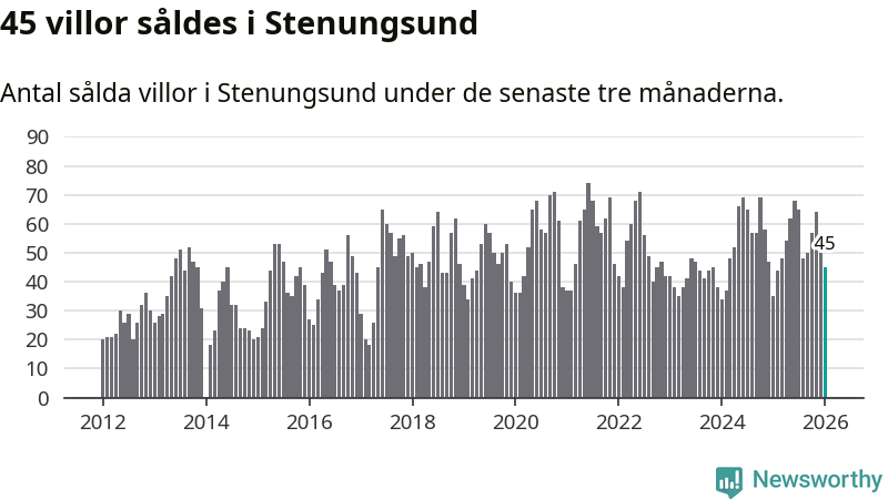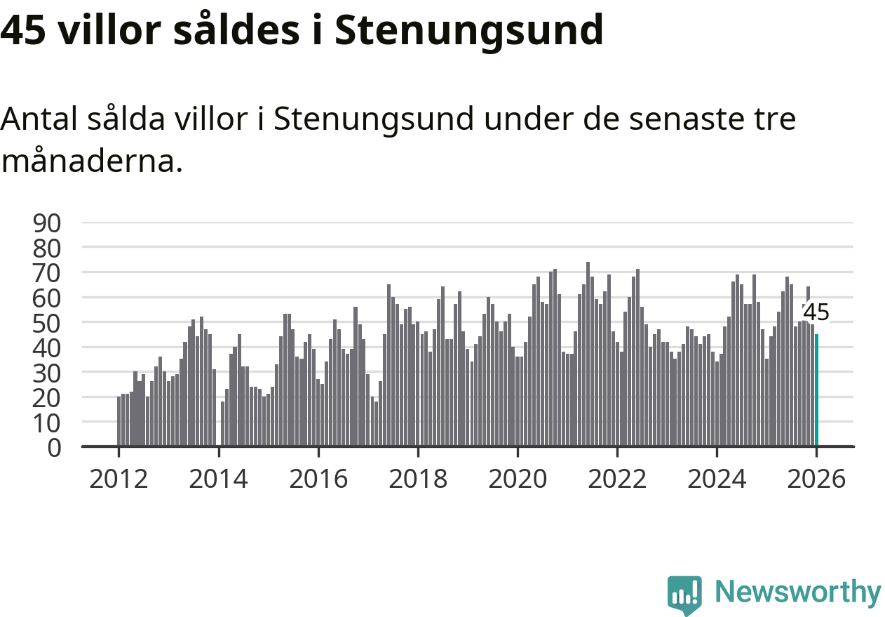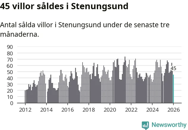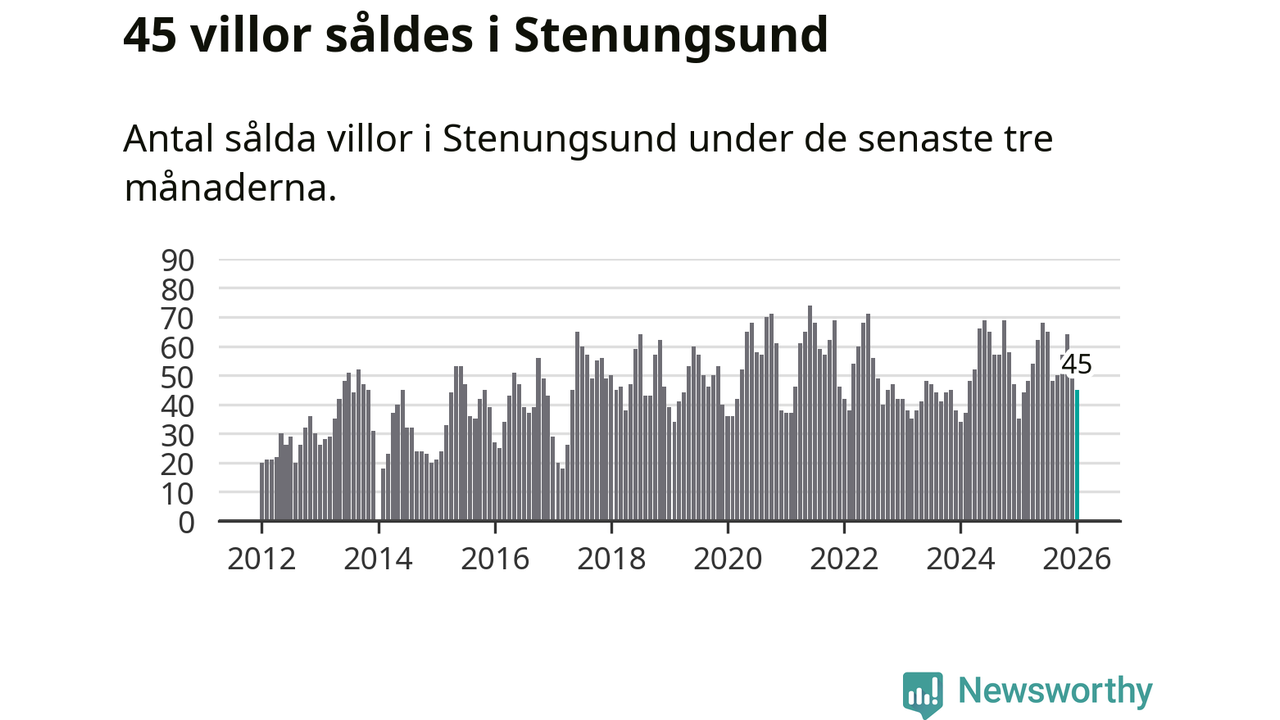 Sammanlagt såldes 45 villor i Stenungsunds kommun mellan november och januari till ett genomsnittligt pris på 5,0 miljoner kronor. I fjol gjordes 35 affärer vid den här tiden på året.