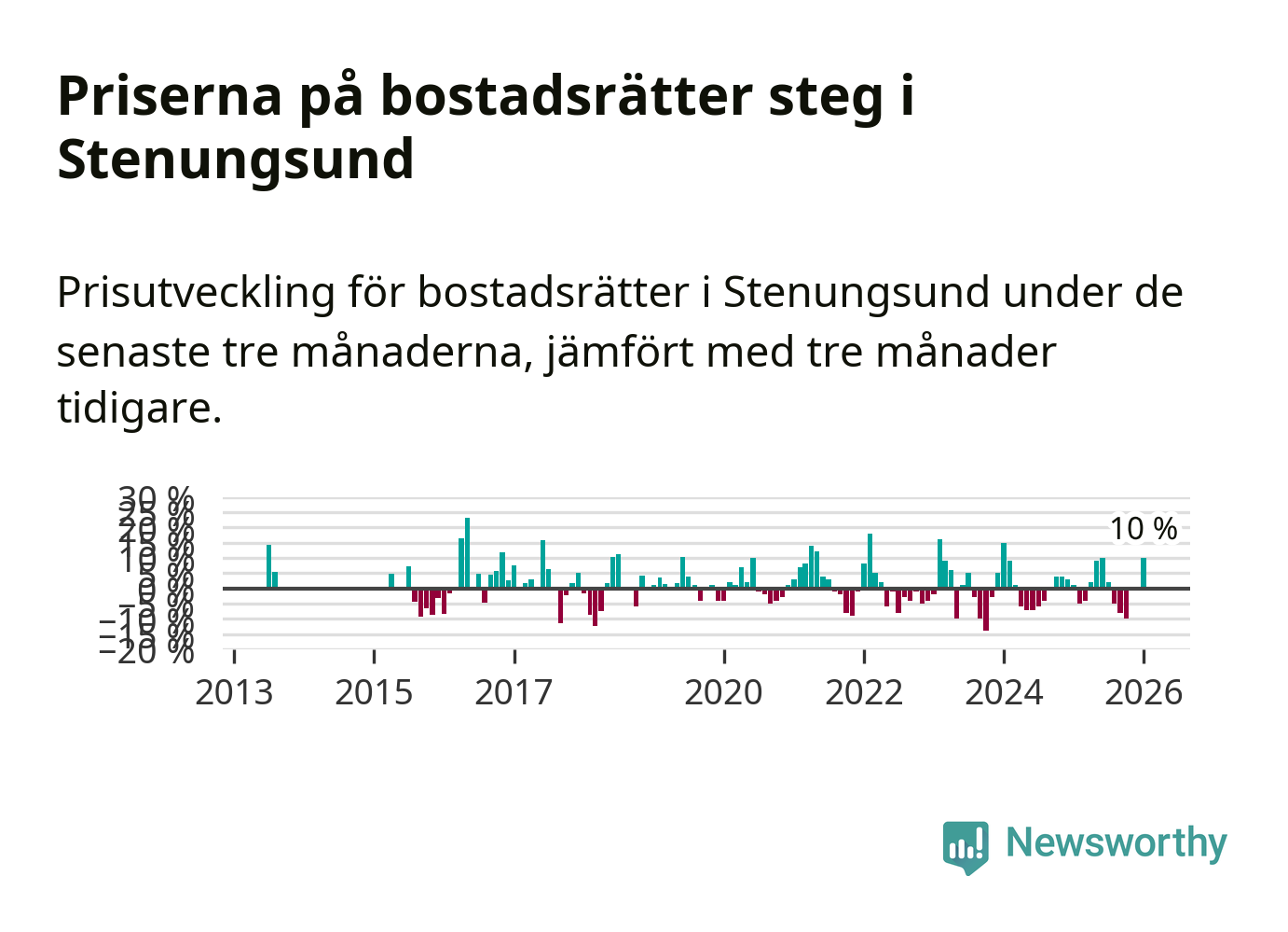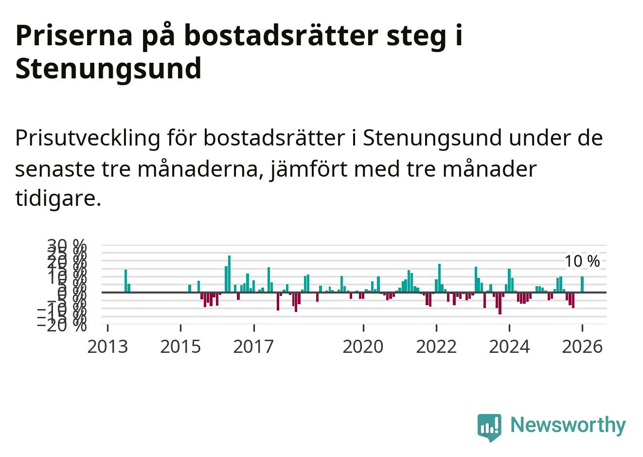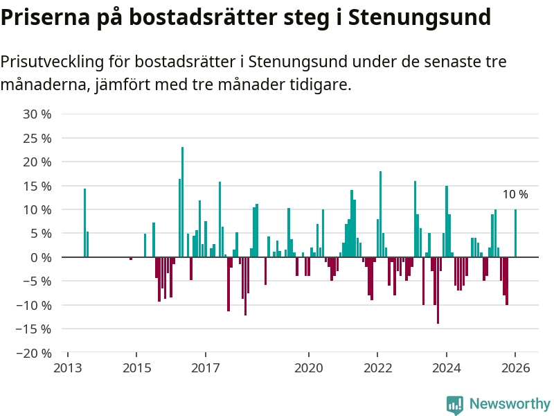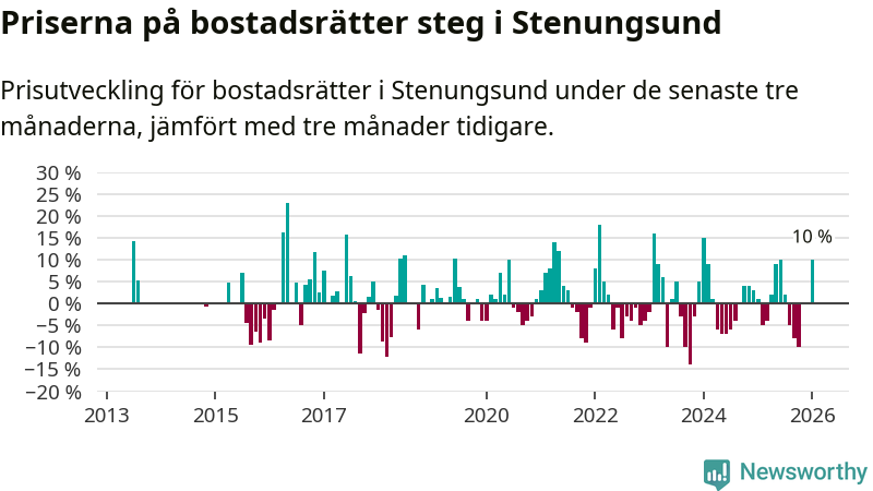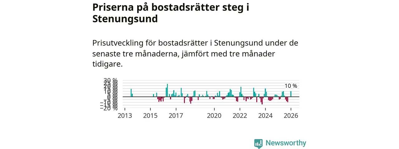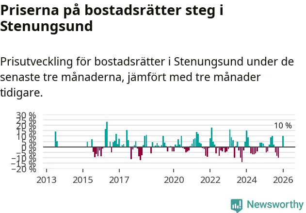 Priserna på bostadsrätter steg mellan november och januari med 10 procent i Stenungsunds kommun. Det är en betydande uppgång jämfört med det gångna året då priserna i snitt stått stilla.
