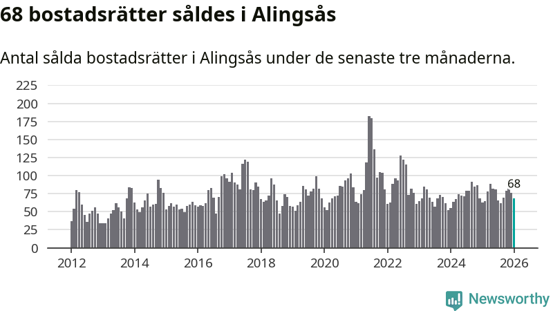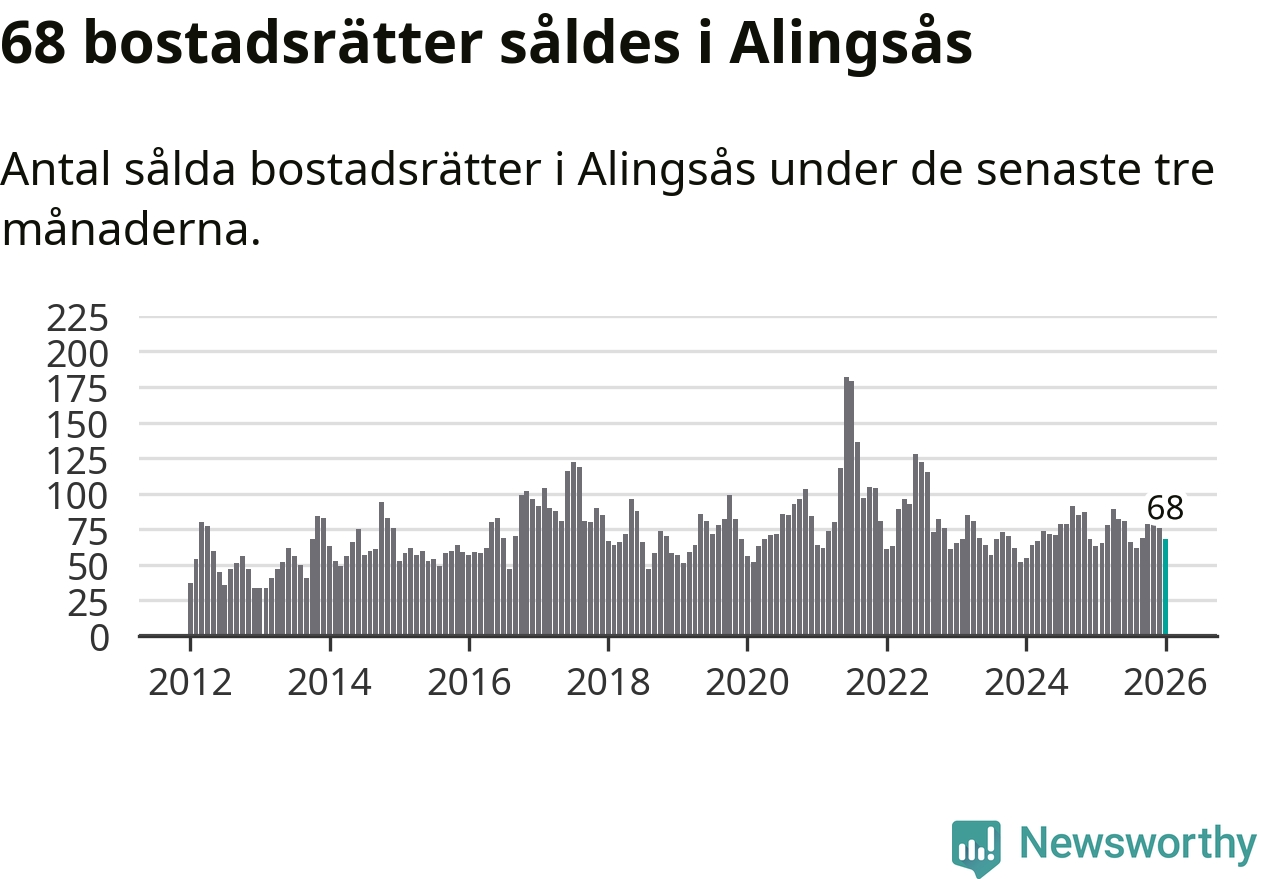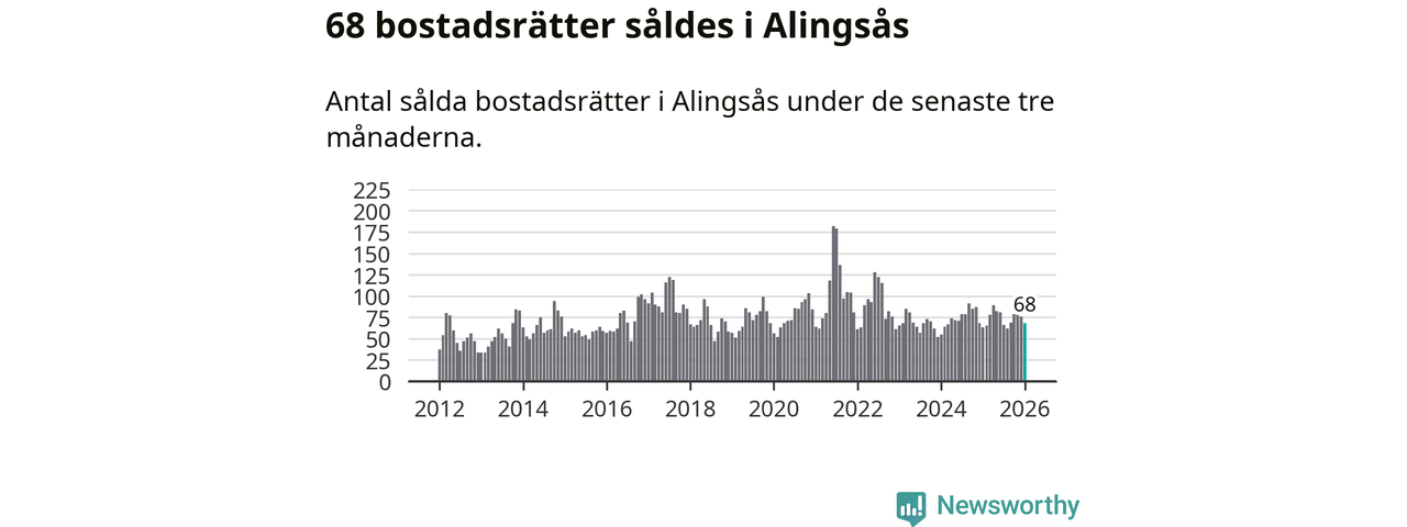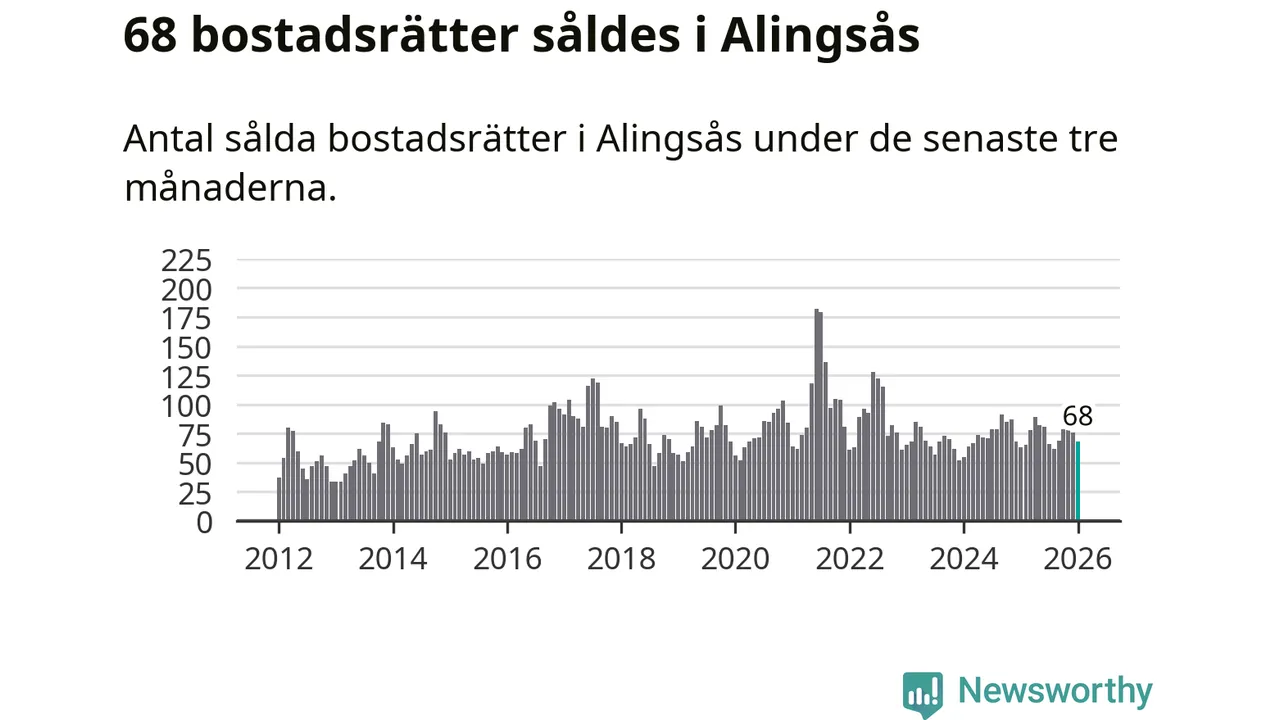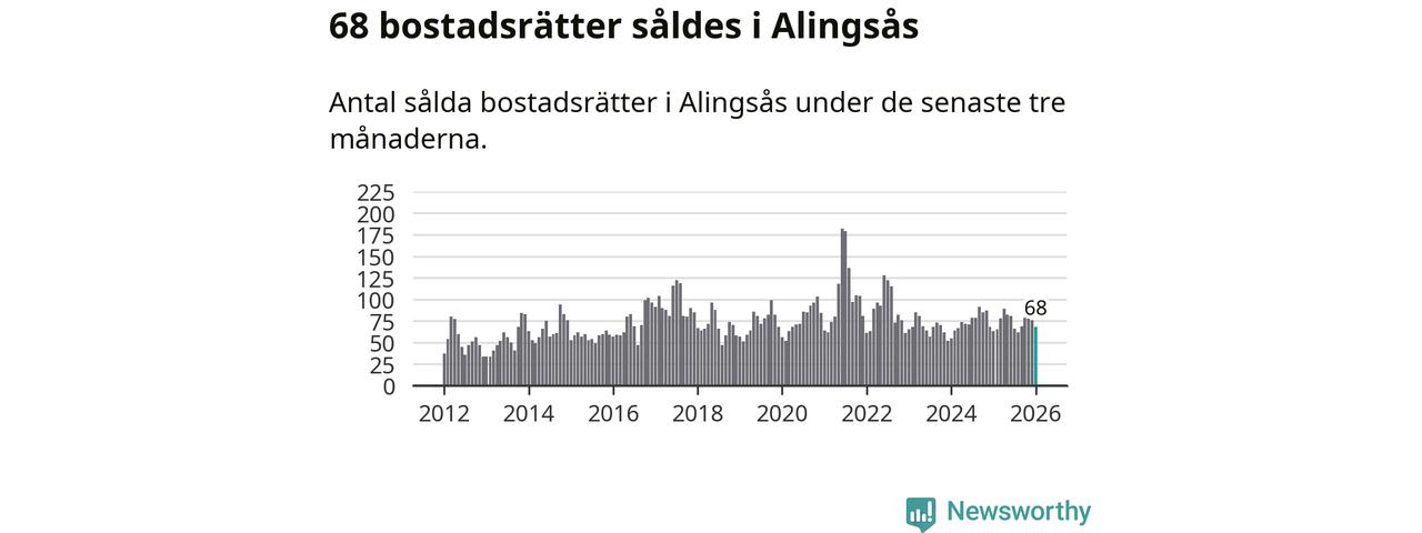 Sammanlagt såldes 68 bostadsrätter i Alingsås kommun mellan november och januari till ett genomsnittligt pris på 2,6 miljoner kronor. I fjol gjordes 63 affärer vid den här tiden på året.