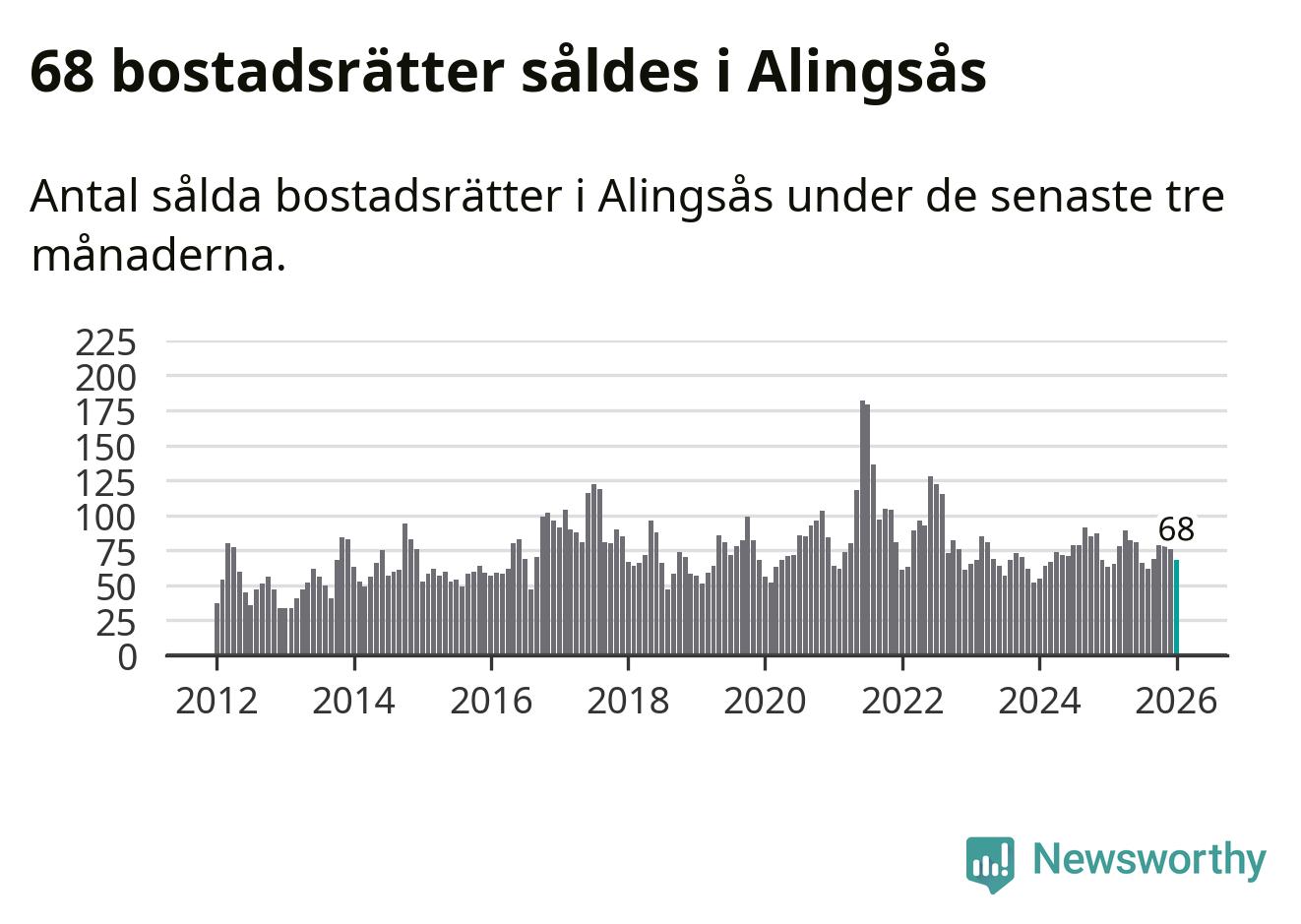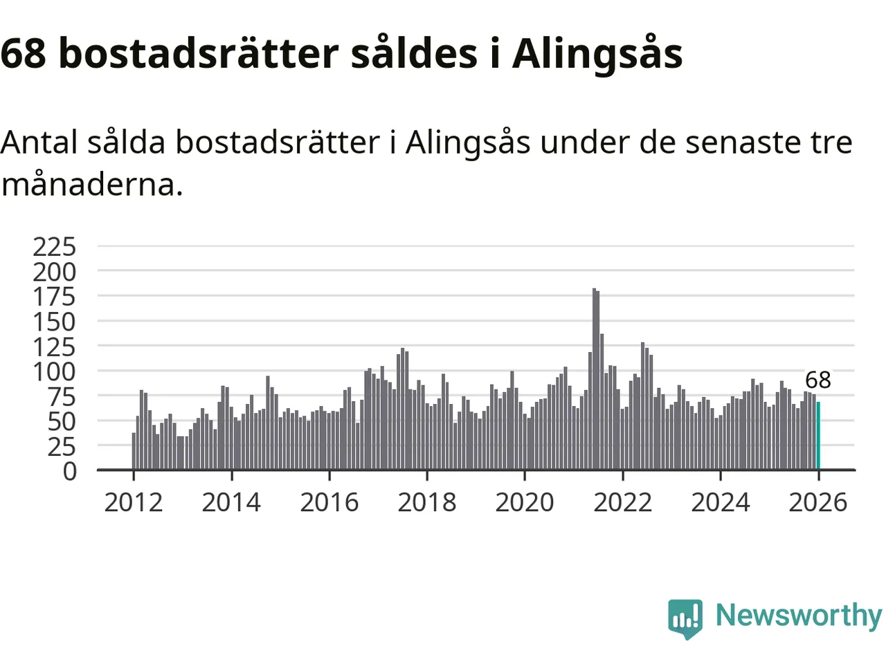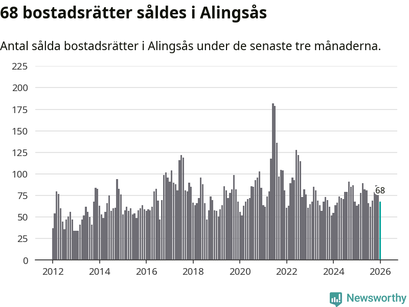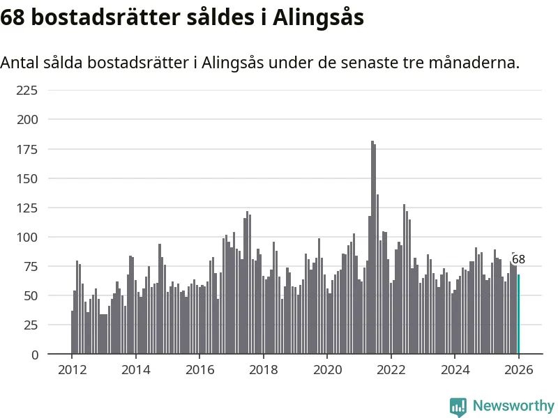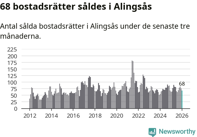 Sammanlagt såldes 68 bostadsrätter i Alingsås kommun mellan november och januari till ett genomsnittligt pris på 2,6 miljoner kronor. I fjol gjordes 63 affärer vid den här tiden på året.