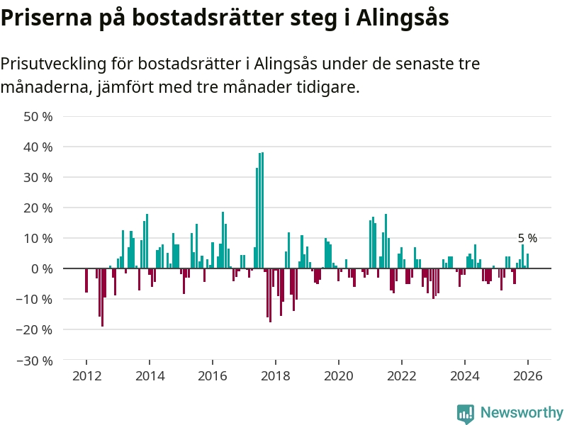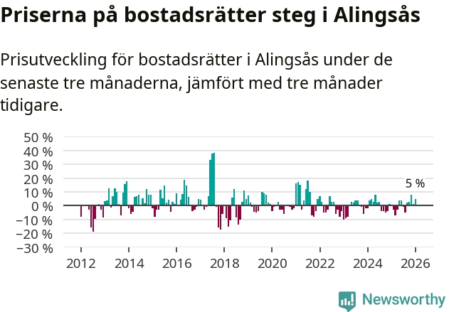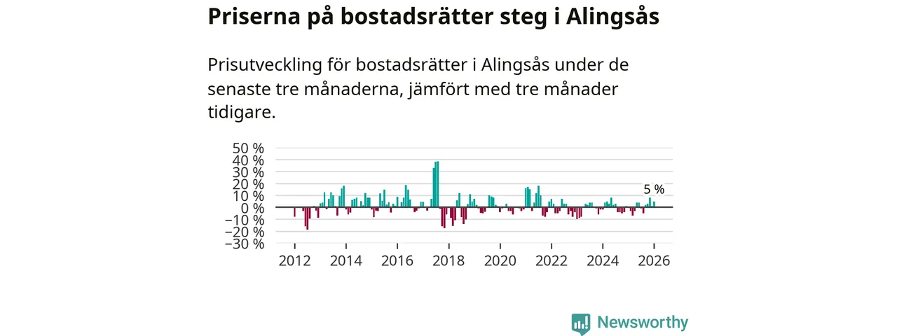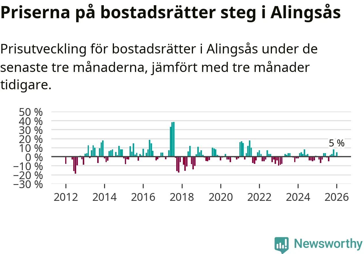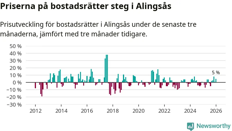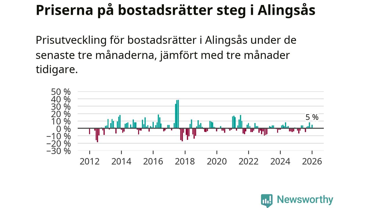 Priserna på bostadsrätter har gått upp i Alingsås kommun. Medelpriset på försäljningarna under de senaste tre månaderna visar på en uppgång med 5 procent.
