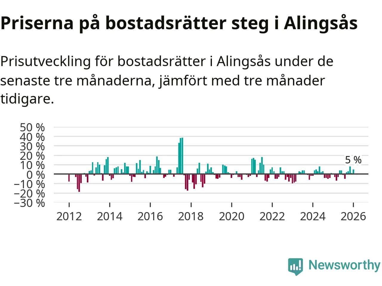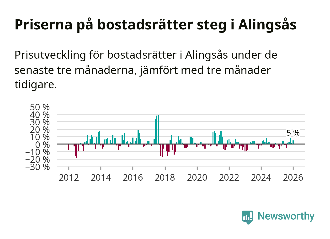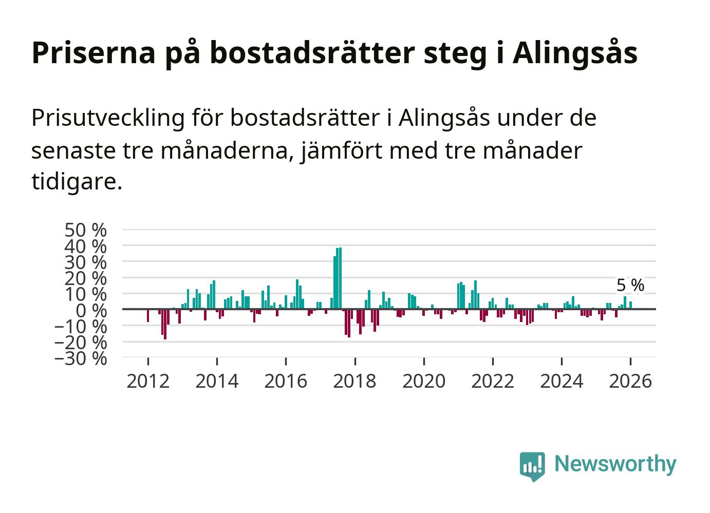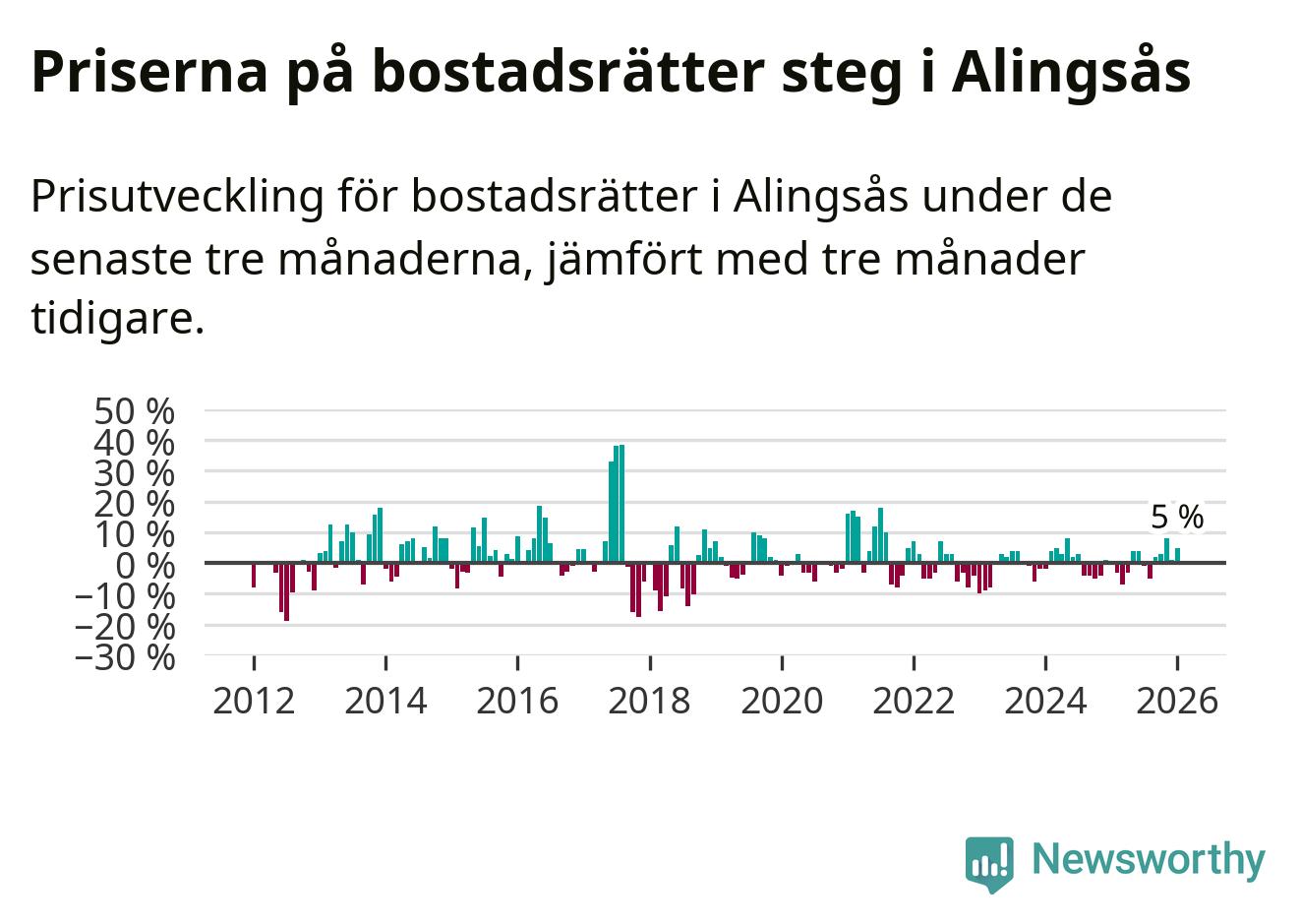 Priserna på bostadsrätter har gått upp i Alingsås kommun. Medelpriset på försäljningarna under de senaste tre månaderna visar på en uppgång med 5 procent.