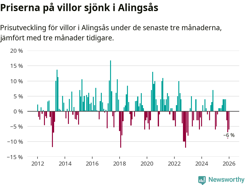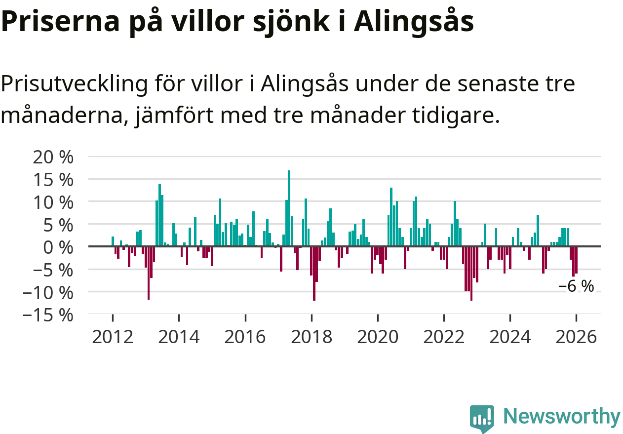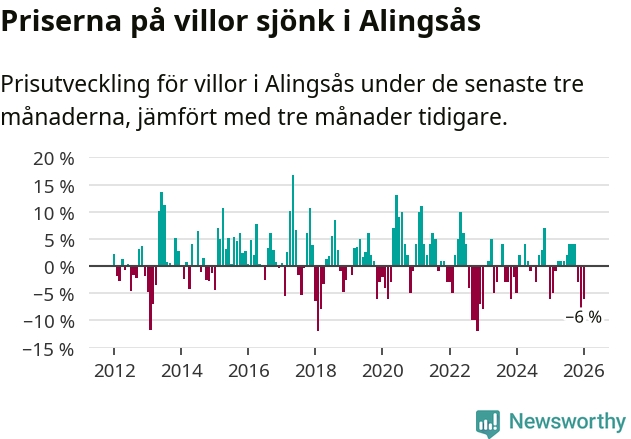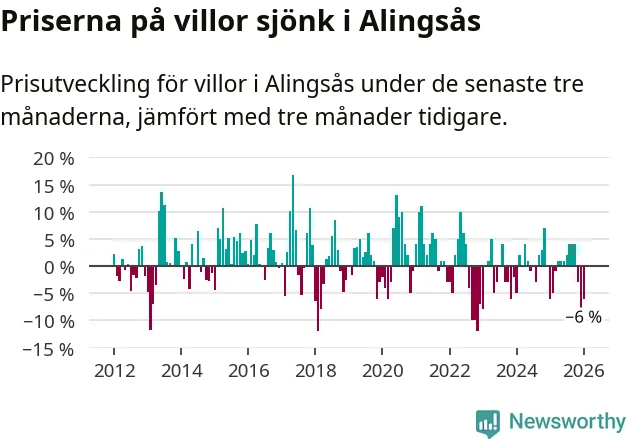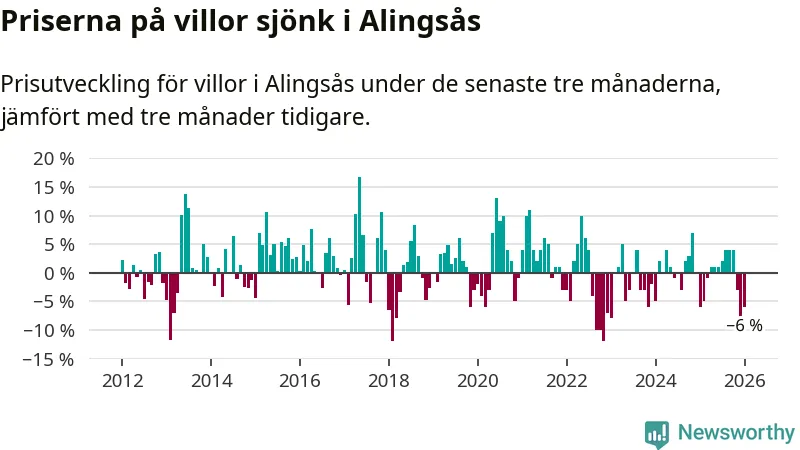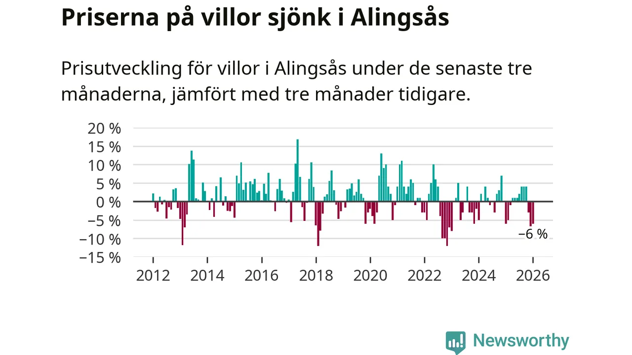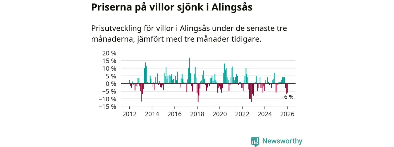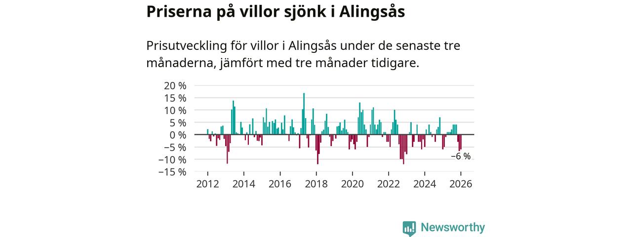 Villapriserna har gått ner i Alingsås kommun. Medelpriset på försäljningarna under de senaste tre månaderna visar på en nedgång med 6 procent.