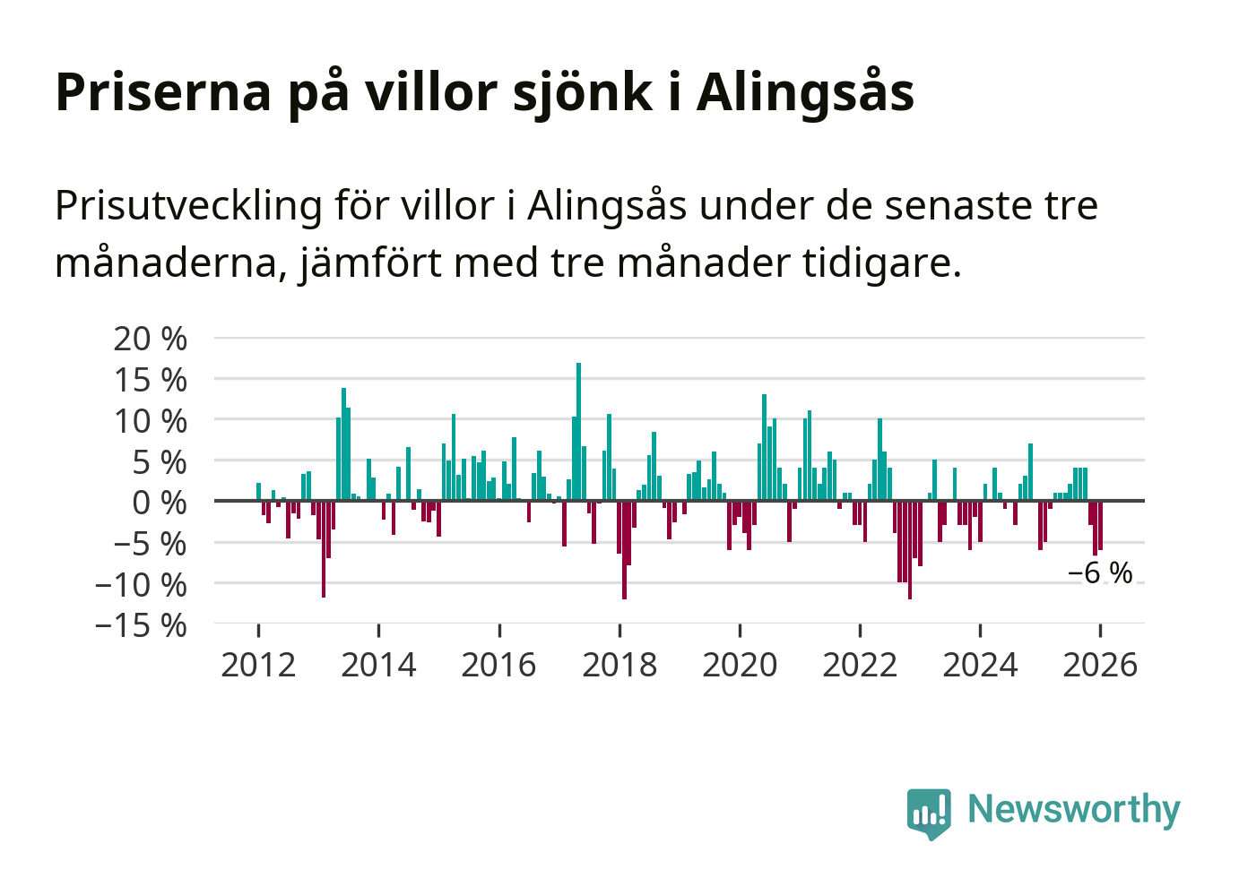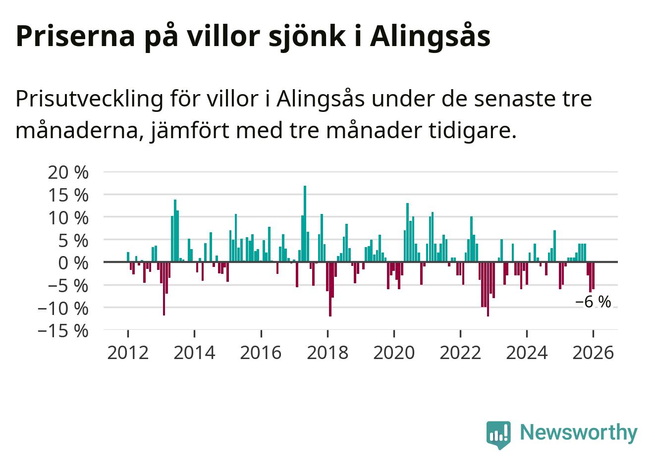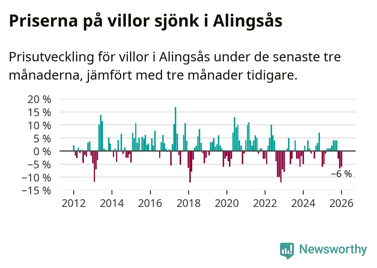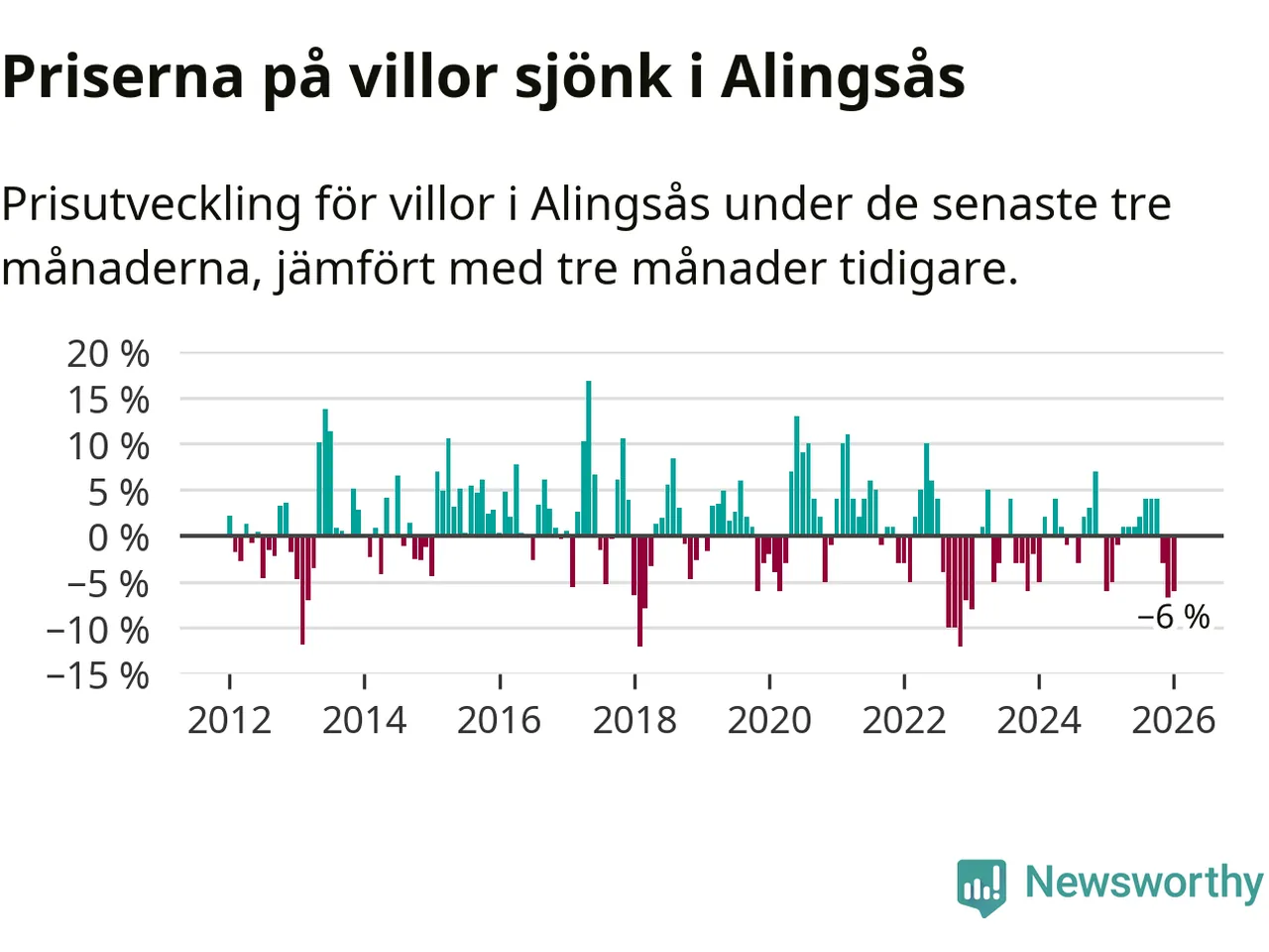 Villapriserna har gått ner i Alingsås kommun. Medelpriset på försäljningarna under de senaste tre månaderna visar på en nedgång med 6 procent.