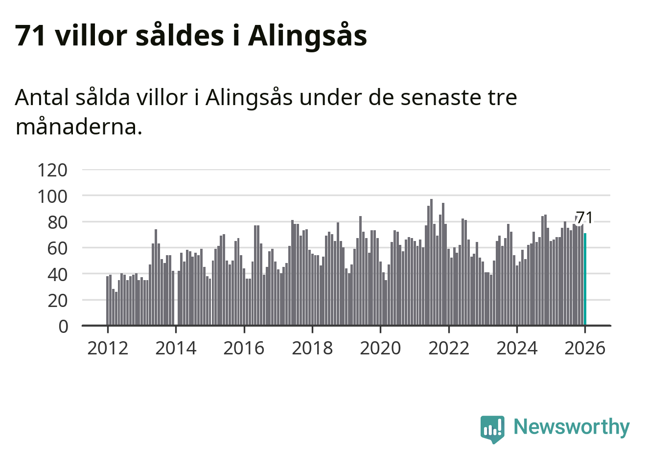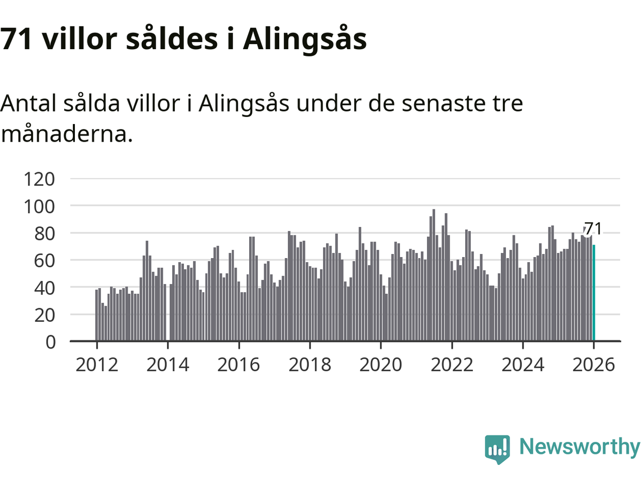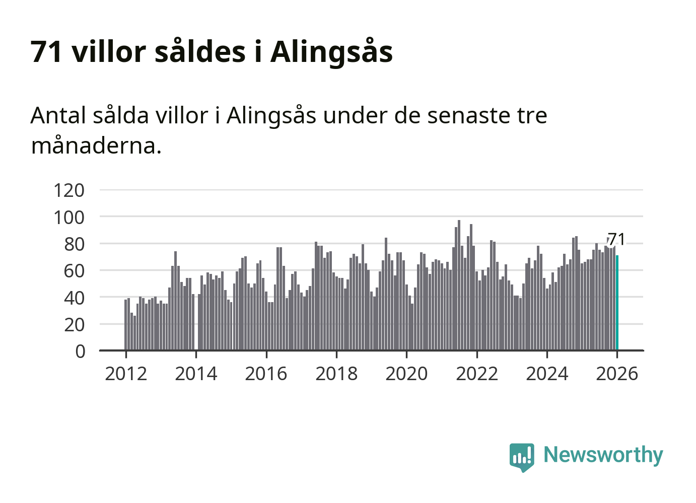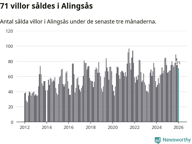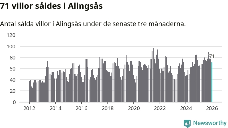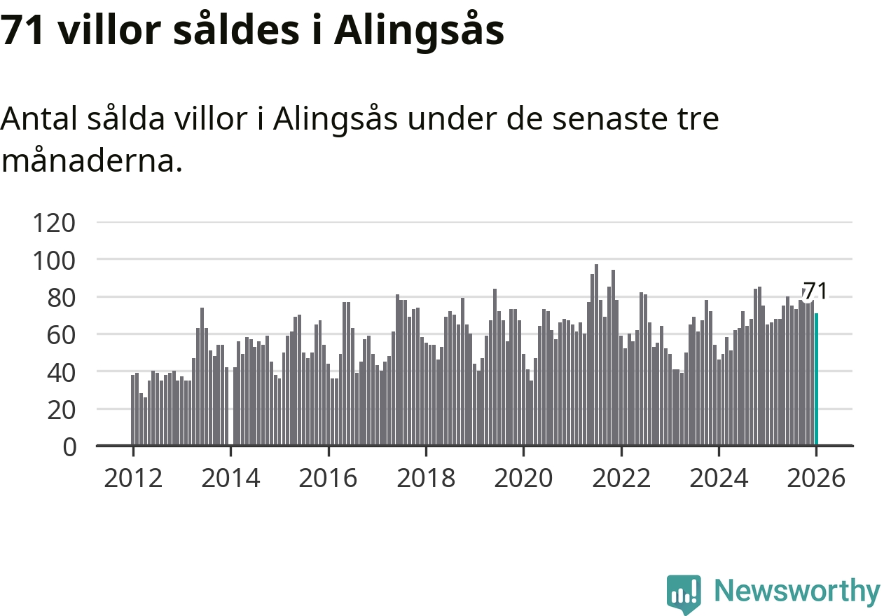Sammanlagt såldes 71 villor i Alingsås kommun mellan november och januari till ett genomsnittligt pris på 4,5 miljoner kronor. I fjol gjordes 65 affärer vid den här tiden på året.