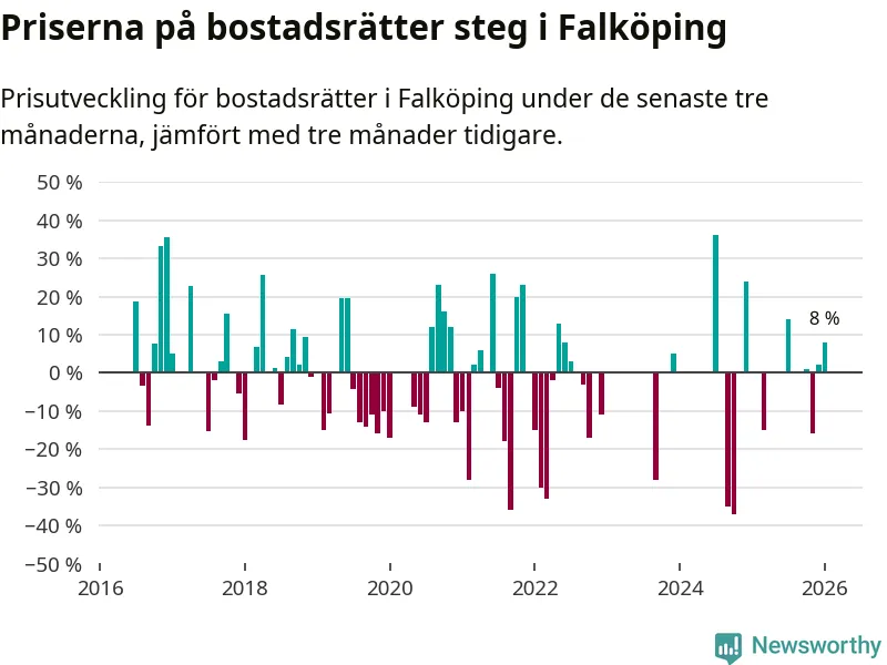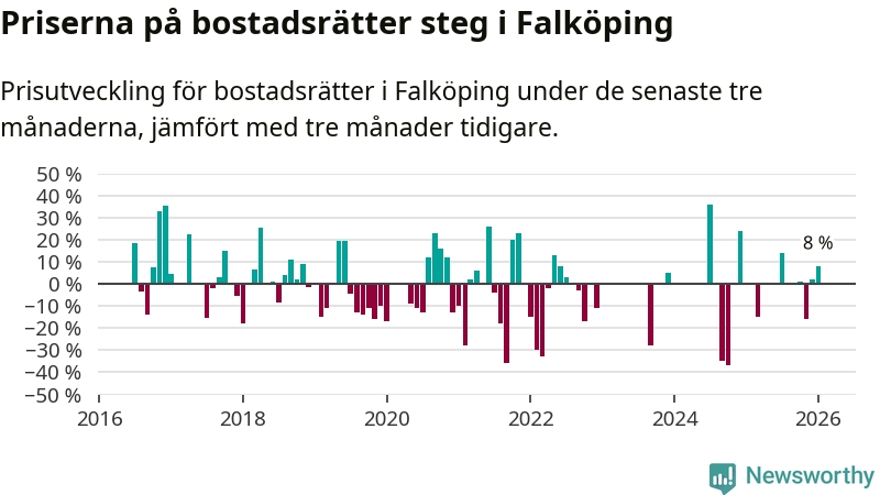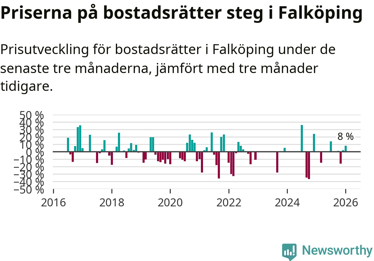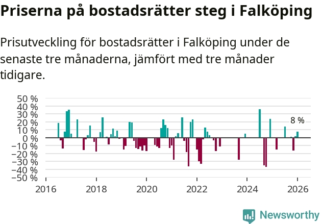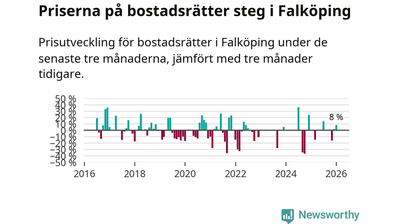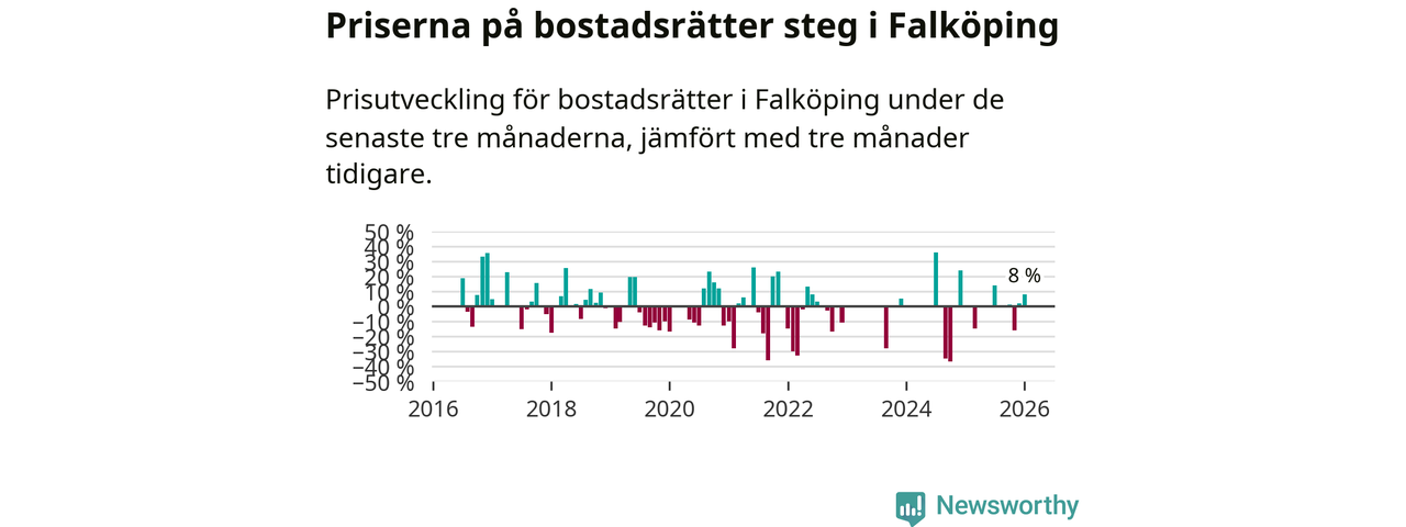Priserna på bostadsrätter har gått upp i Falköpings kommun. Medelpriset på försäljningarna under de senaste tre månaderna visar på en uppgång med 8 procent.
