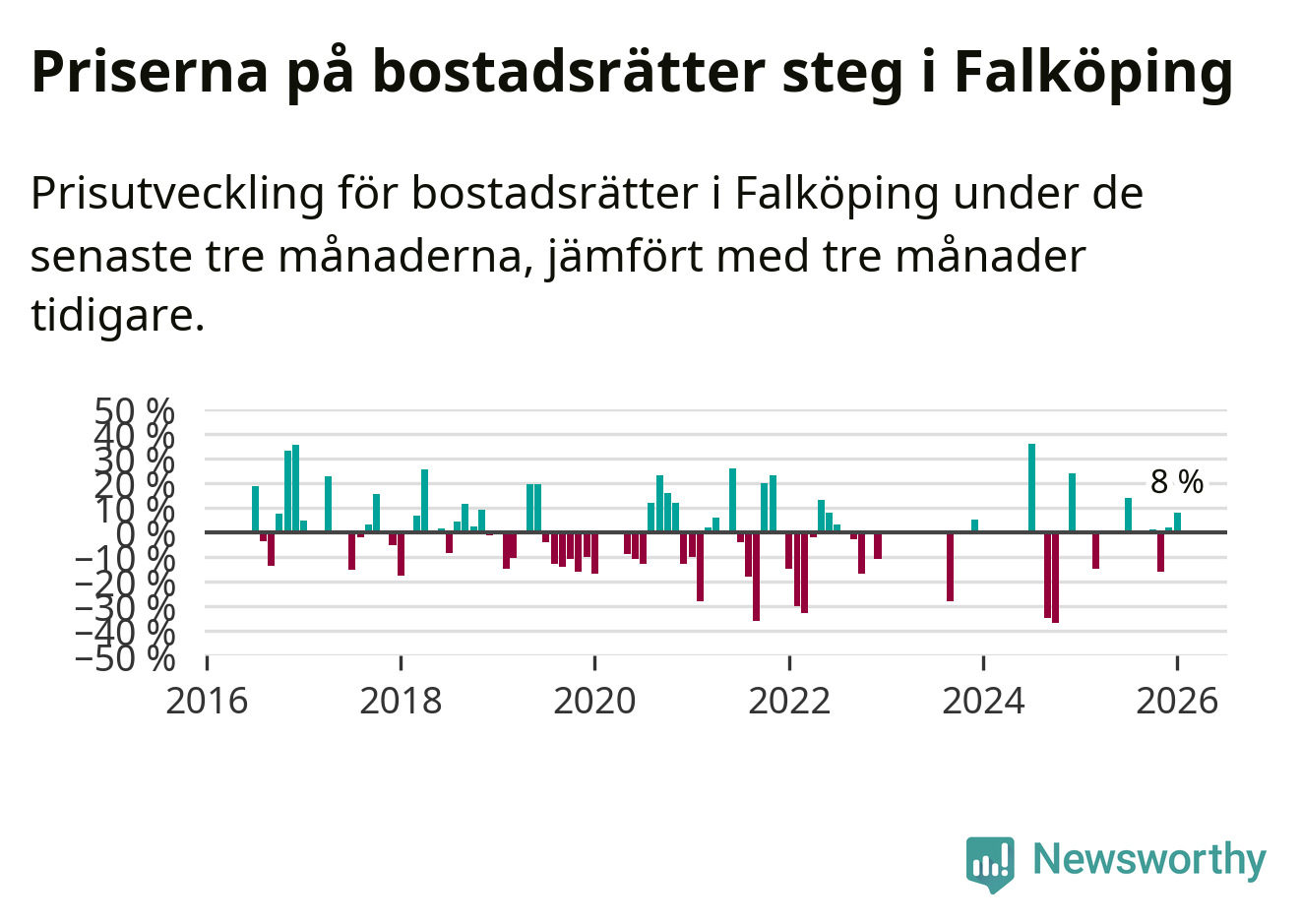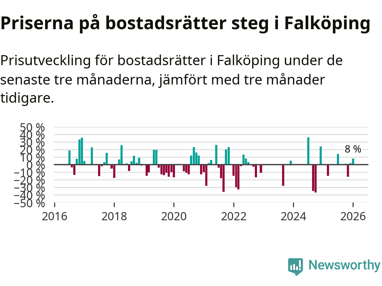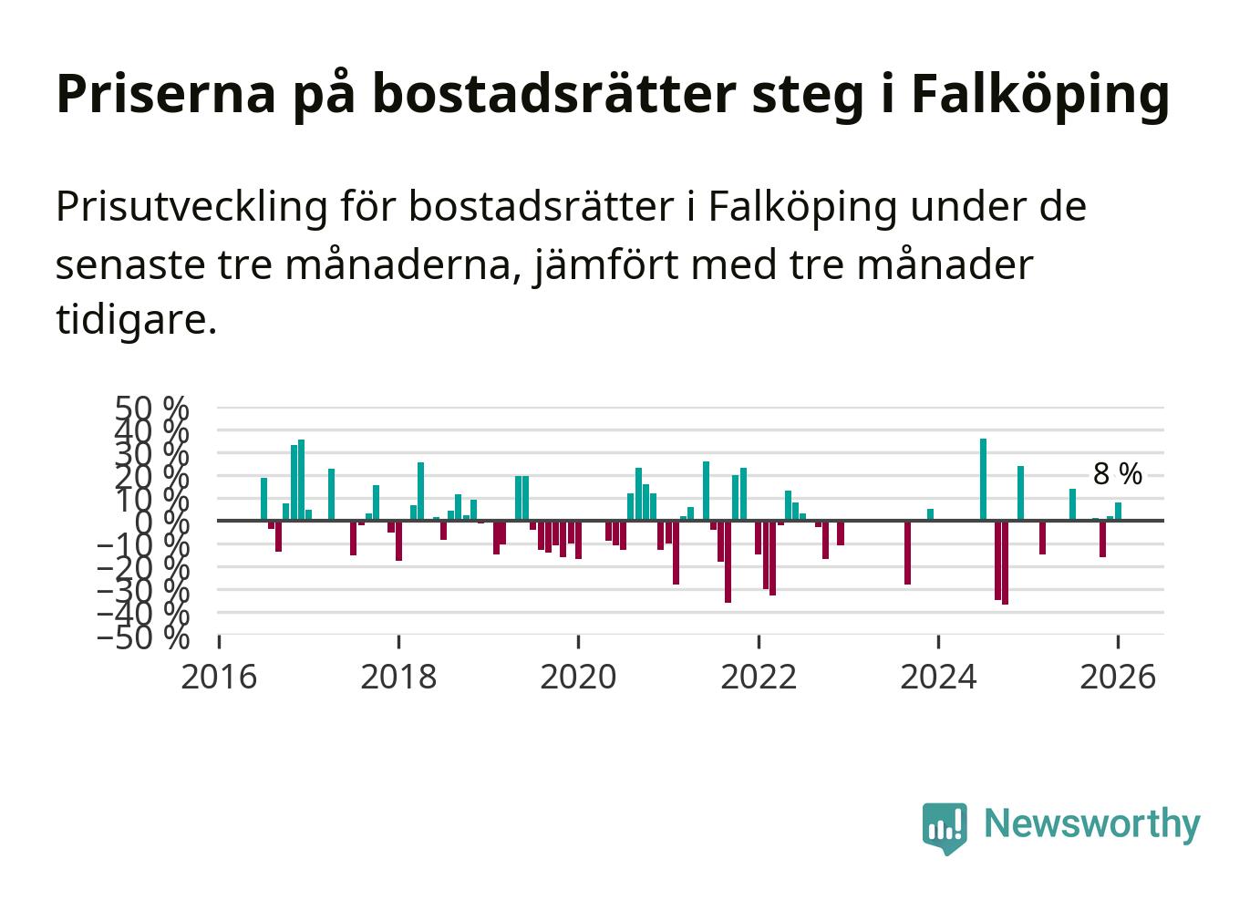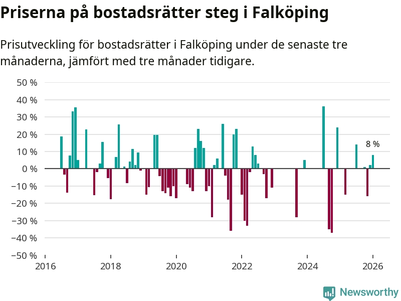 Priserna på bostadsrätter har gått upp i Falköpings kommun. Medelpriset på försäljningarna under de senaste tre månaderna visar på en uppgång med 8 procent.