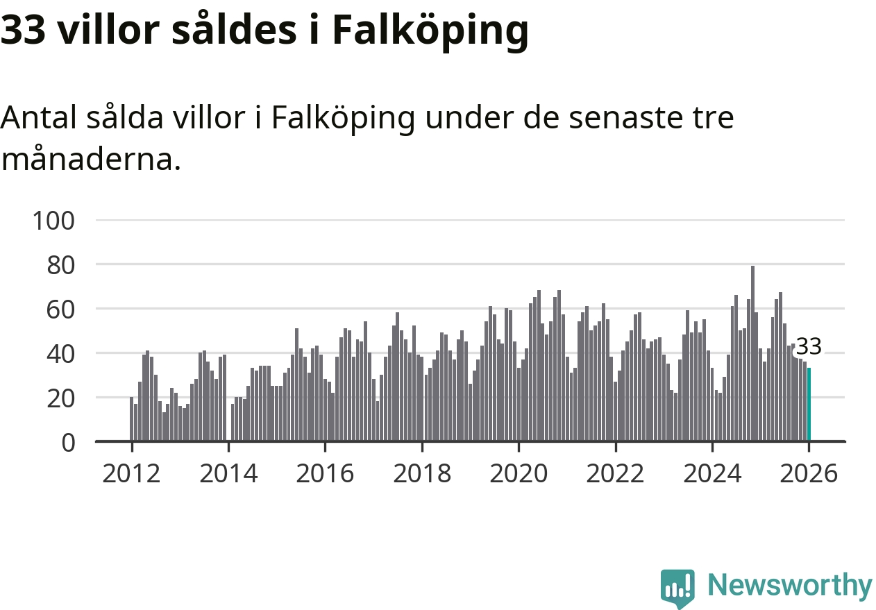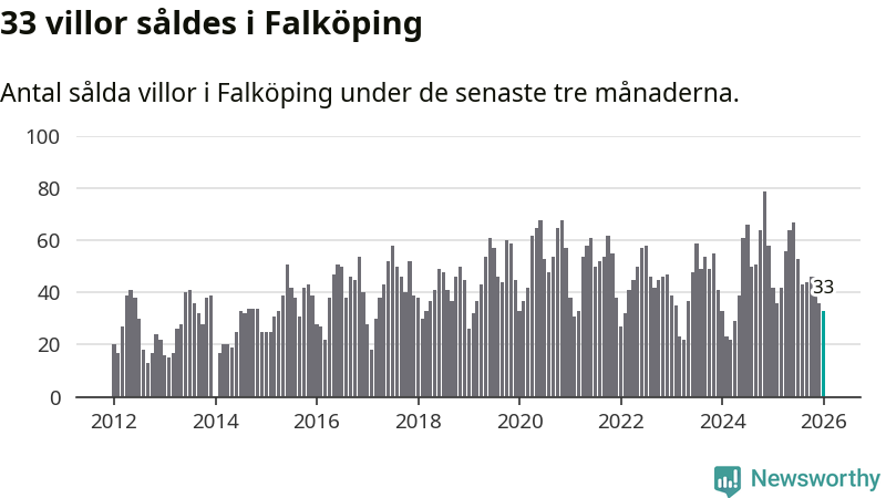 Sammanlagt såldes 33 villor i Falköpings kommun mellan november och januari till ett genomsnittligt pris på 1,8 miljoner kronor. I fjol gjordes 42 affärer vid den här tiden på året.