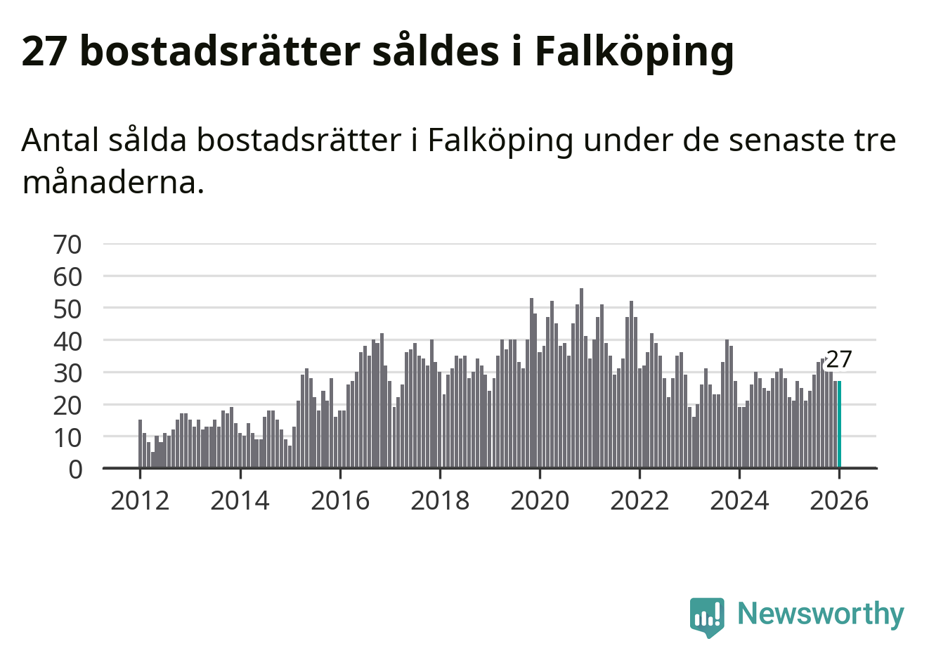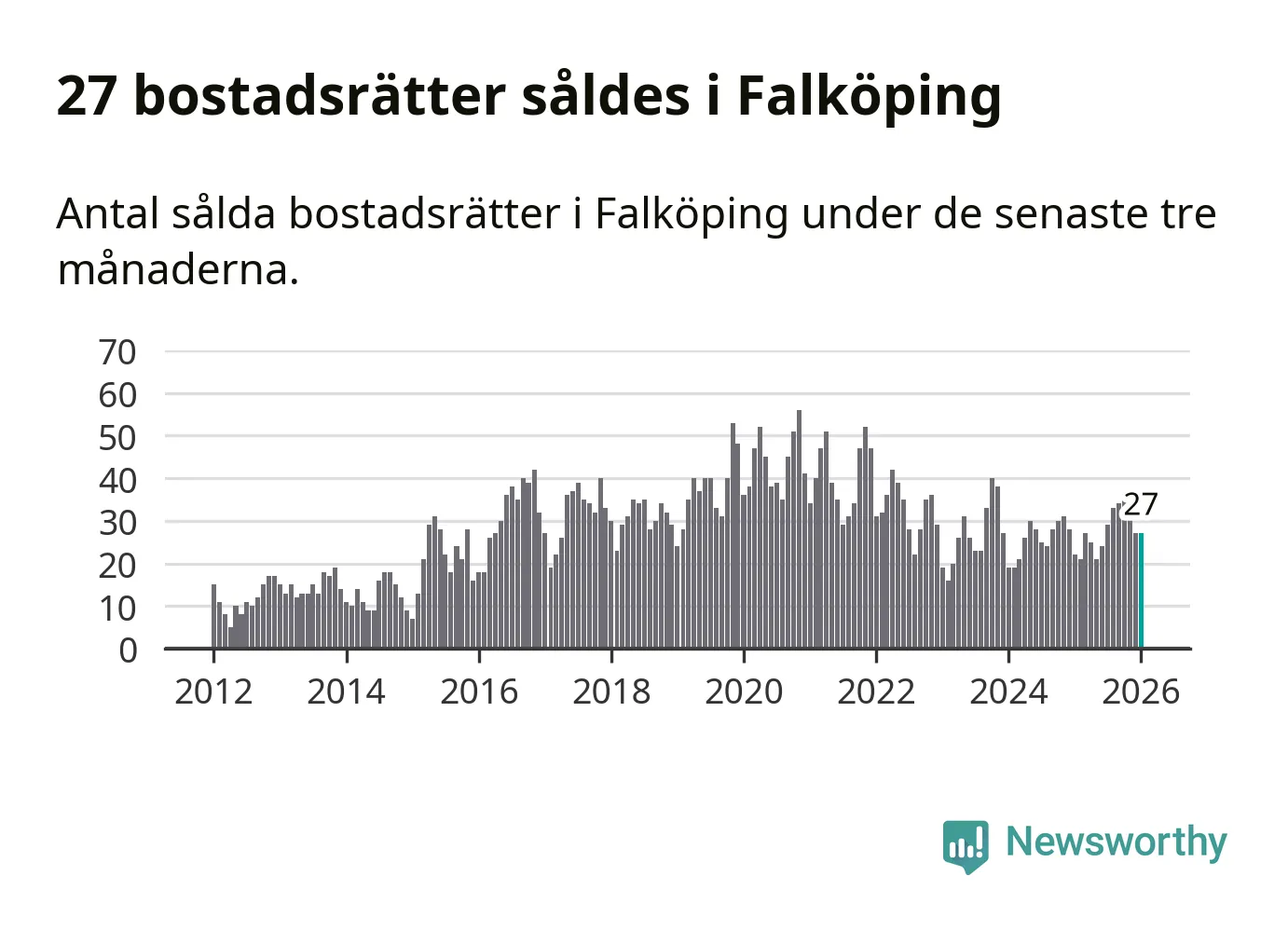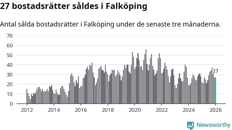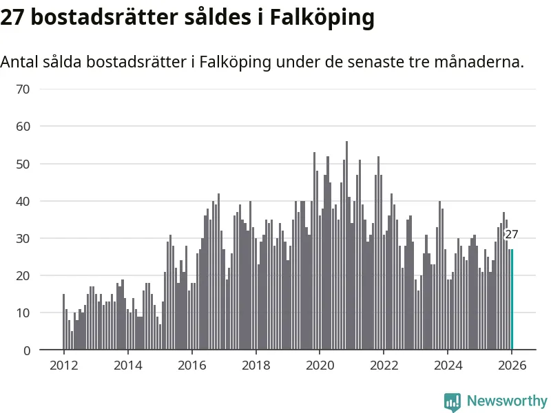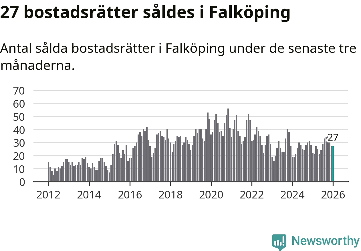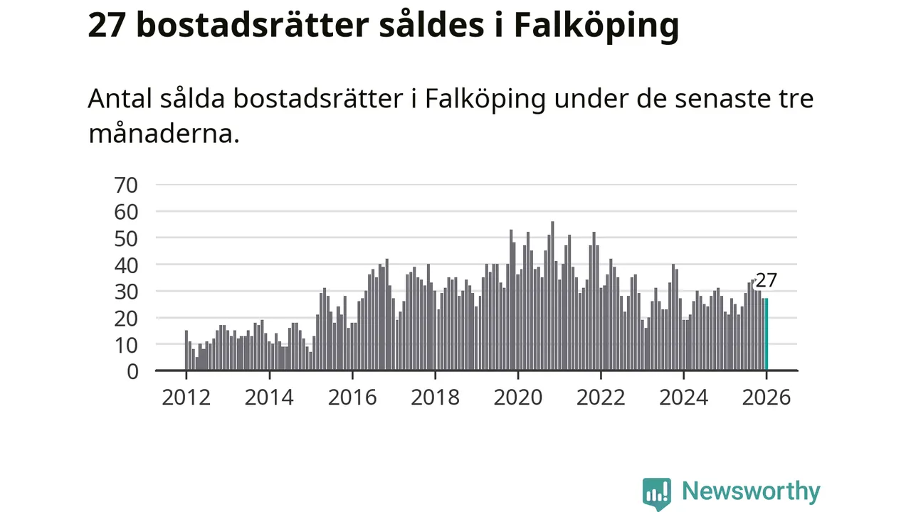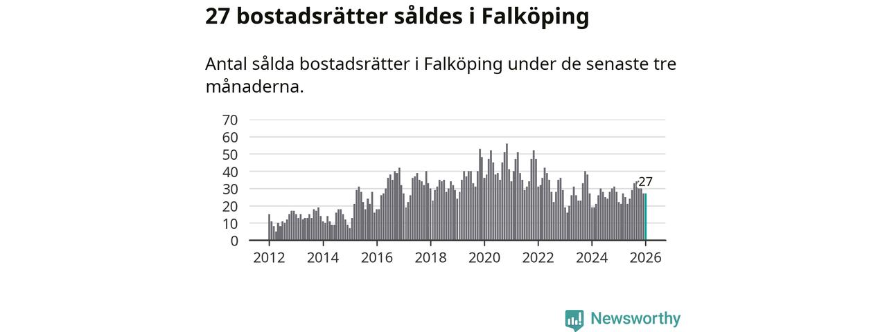 Sammanlagt såldes 27 bostadsrätter i Falköpings kommun mellan november och januari till ett genomsnittligt pris på 0,7 miljoner kronor. I fjol gjordes 22 affärer vid den här tiden på året.