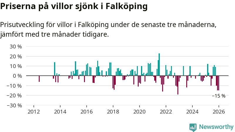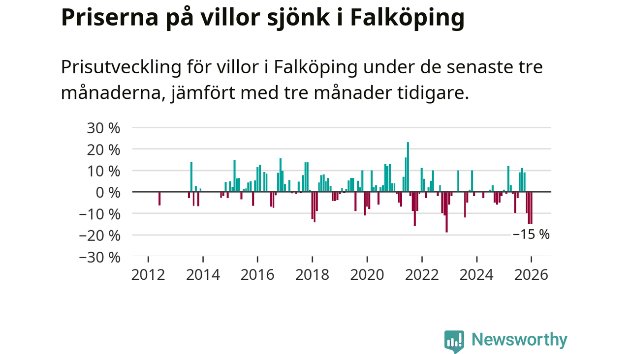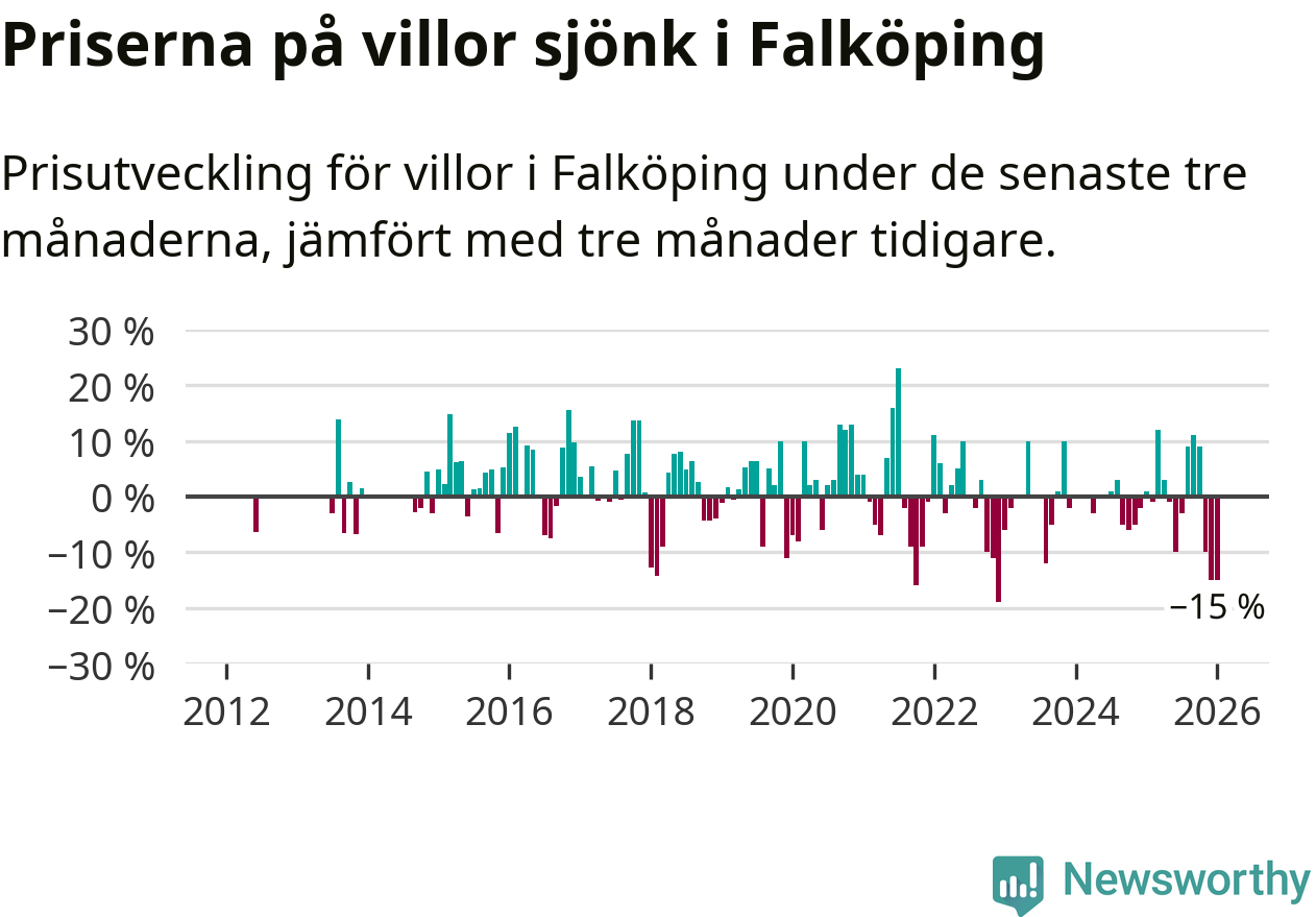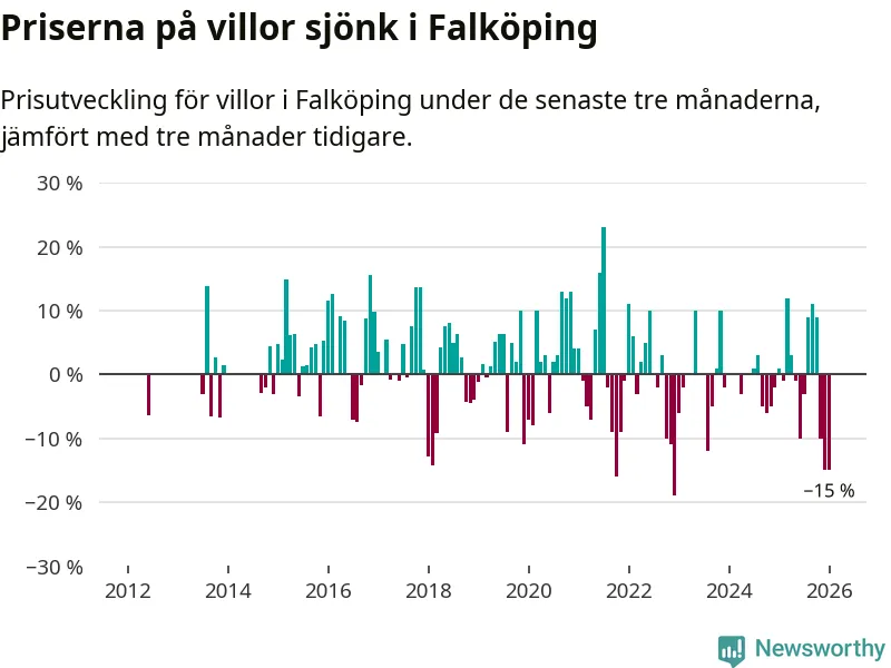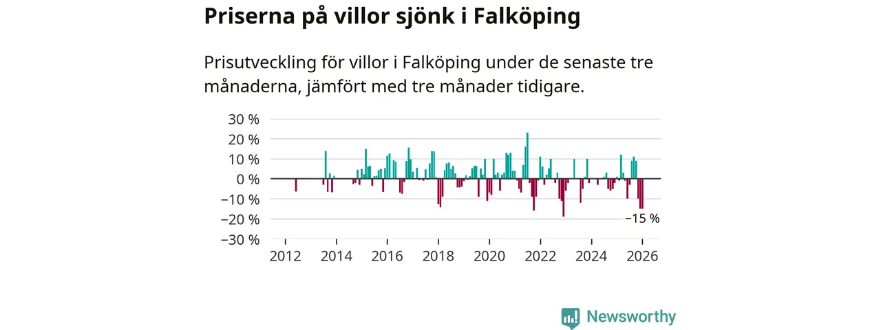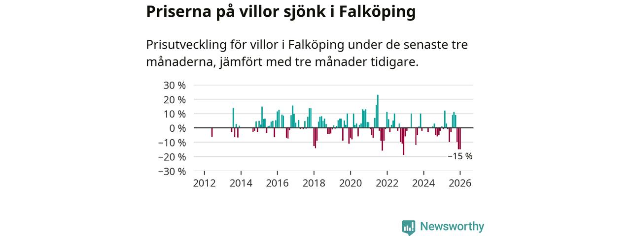 Villapriserna sjönk mellan november och januari med 15 procent i Falköpings kommun. Det är en betydande nedgång jämfört med det gångna året då priserna i snitt sjunkit med 1 procent.