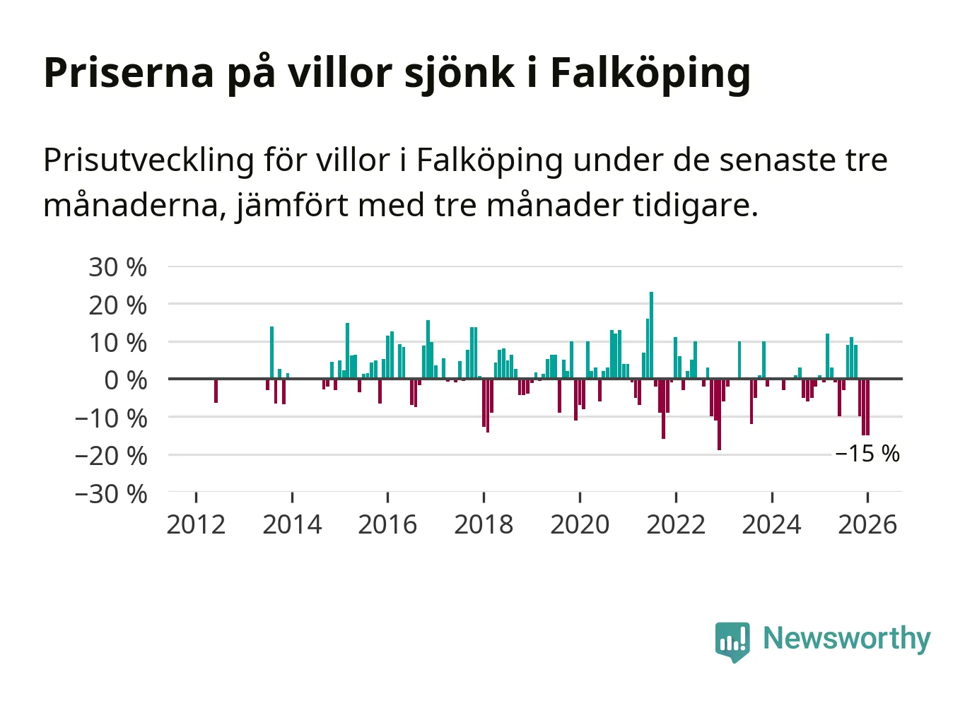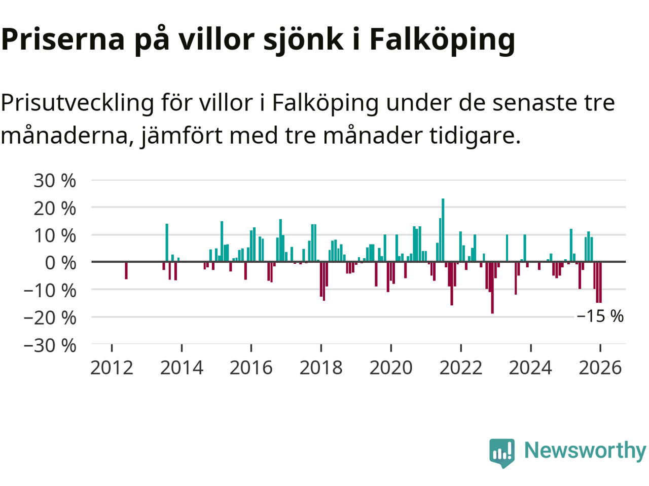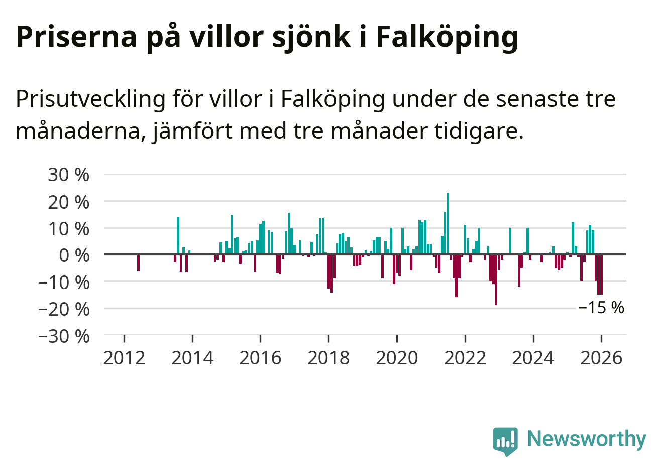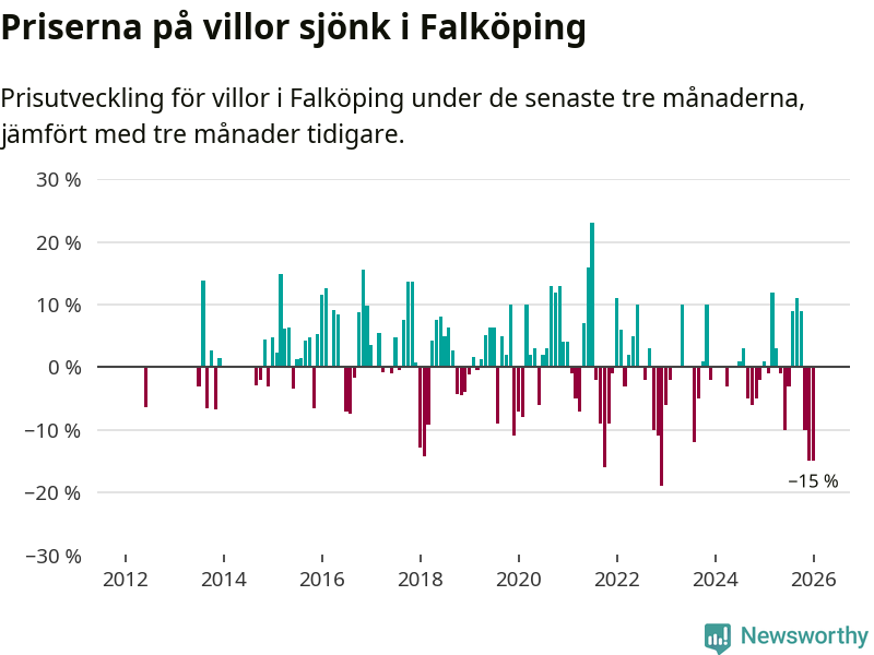 Villapriserna sjönk mellan november och januari med 15 procent i Falköpings kommun. Det är en betydande nedgång jämfört med det gångna året då priserna i snitt sjunkit med 1 procent.