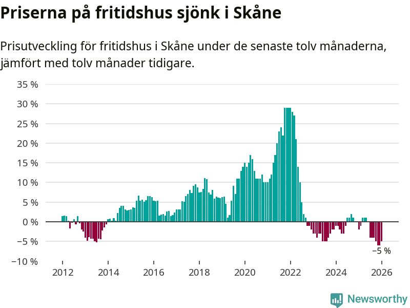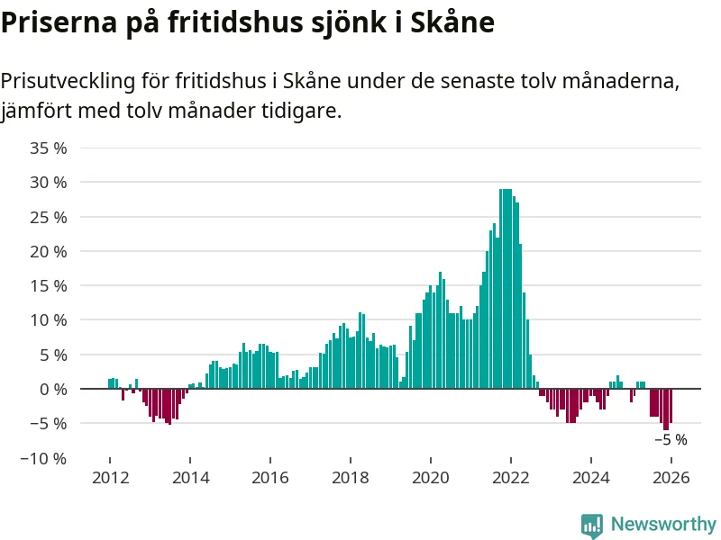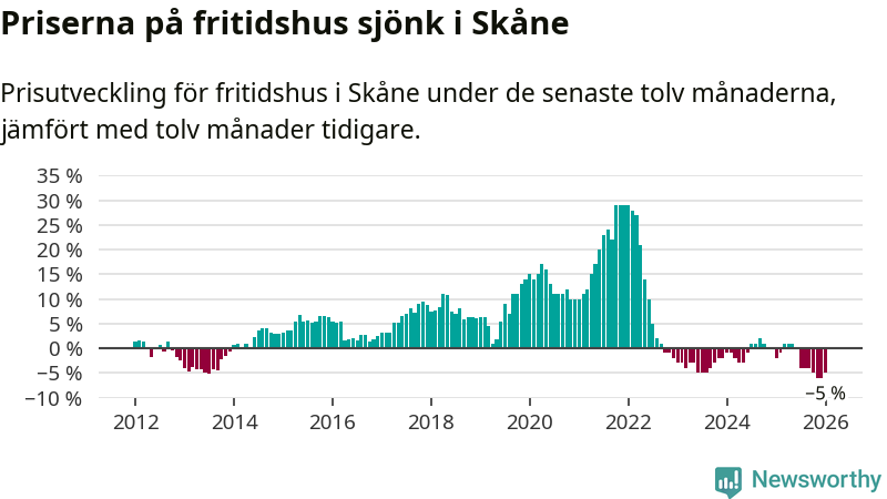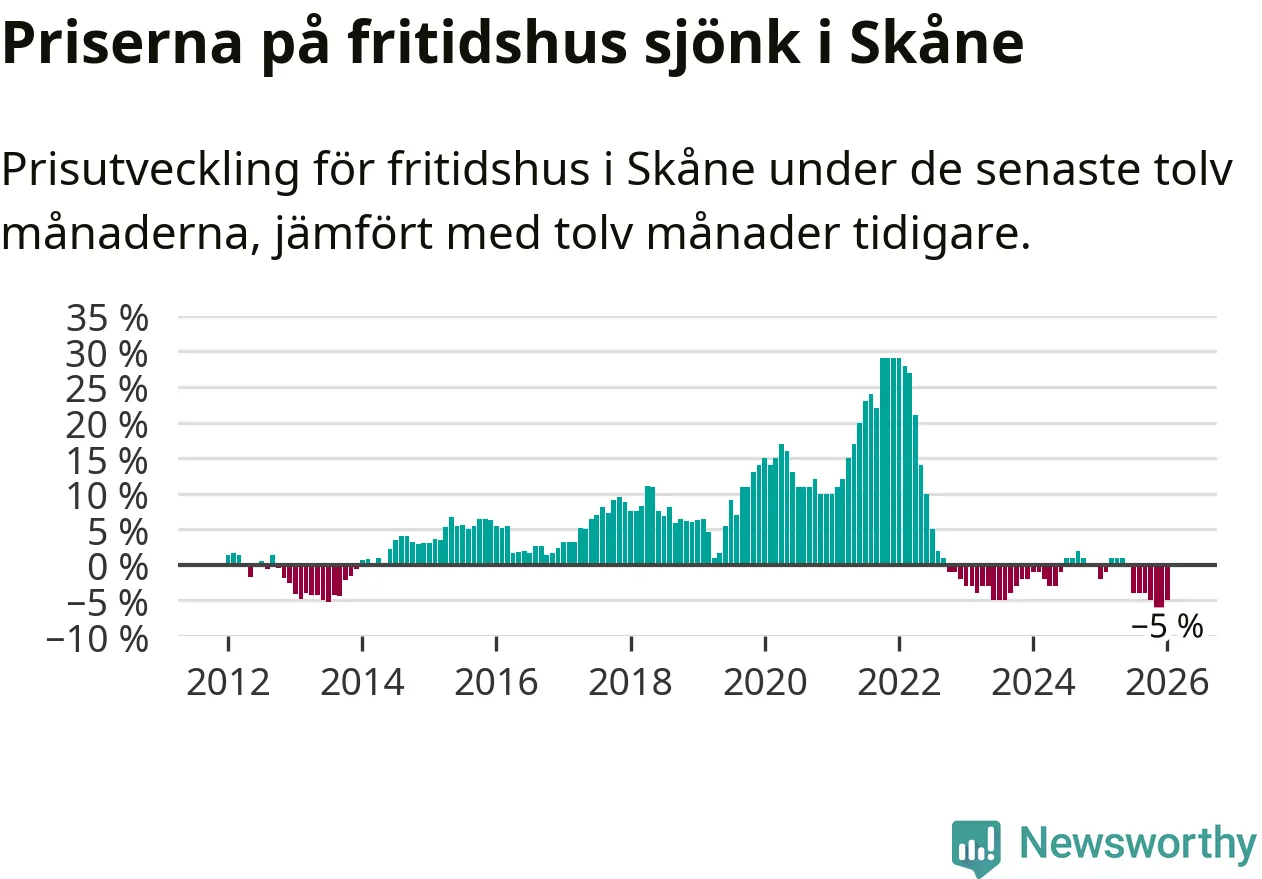 Priserna på fritidshus har gått ner i Skåne län. Medelpriset på försäljningarna under de senaste tolv månaderna visar på en nedgång med 5 procent.