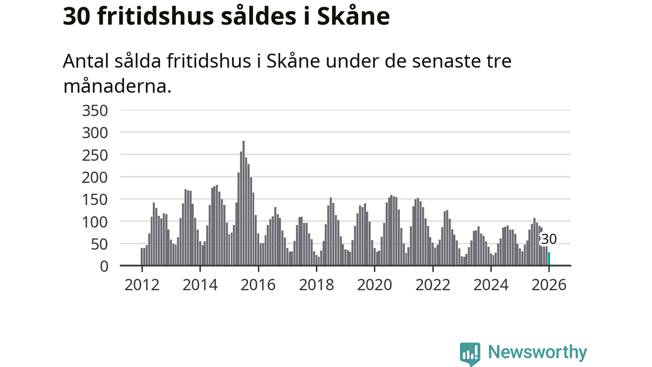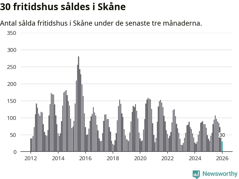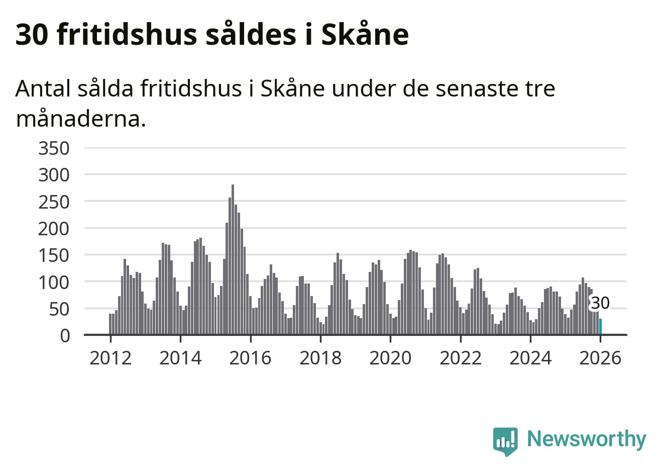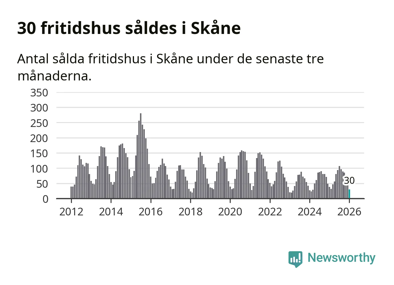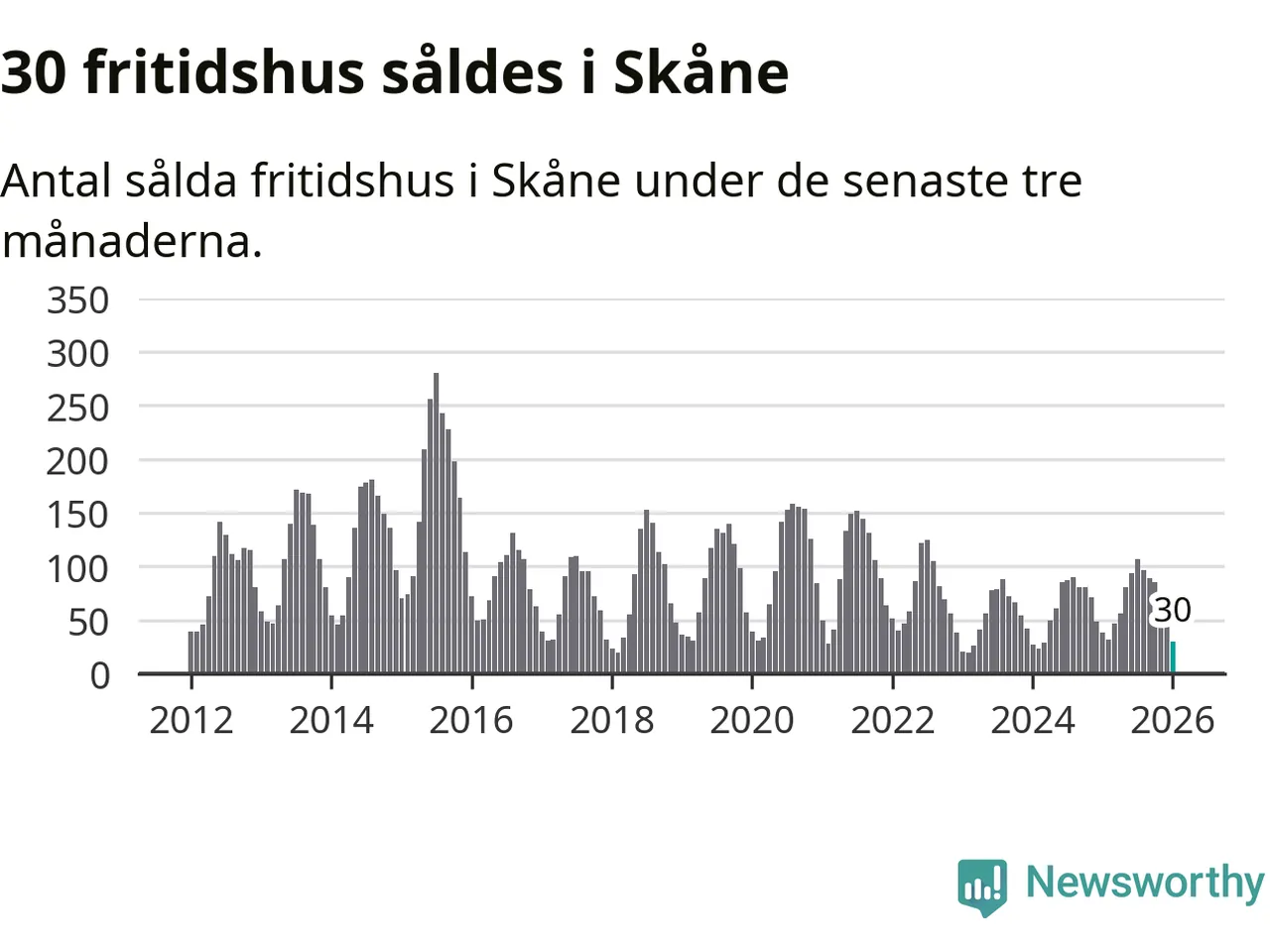 Sammanlagt såldes 30 fritidshus i Skåne län mellan november 2025 och januari till ett genomsnittligt pris på 1,8 miljoner kronor. I fjol gjordes 38 affärer vid den här tiden på året.