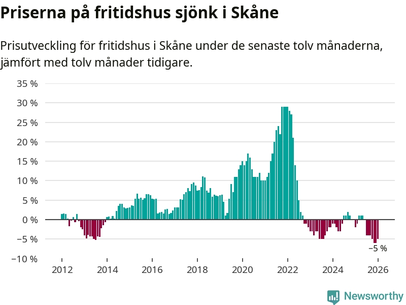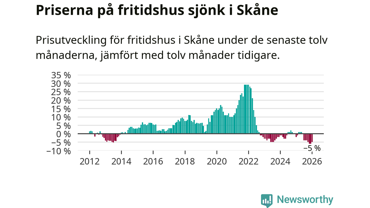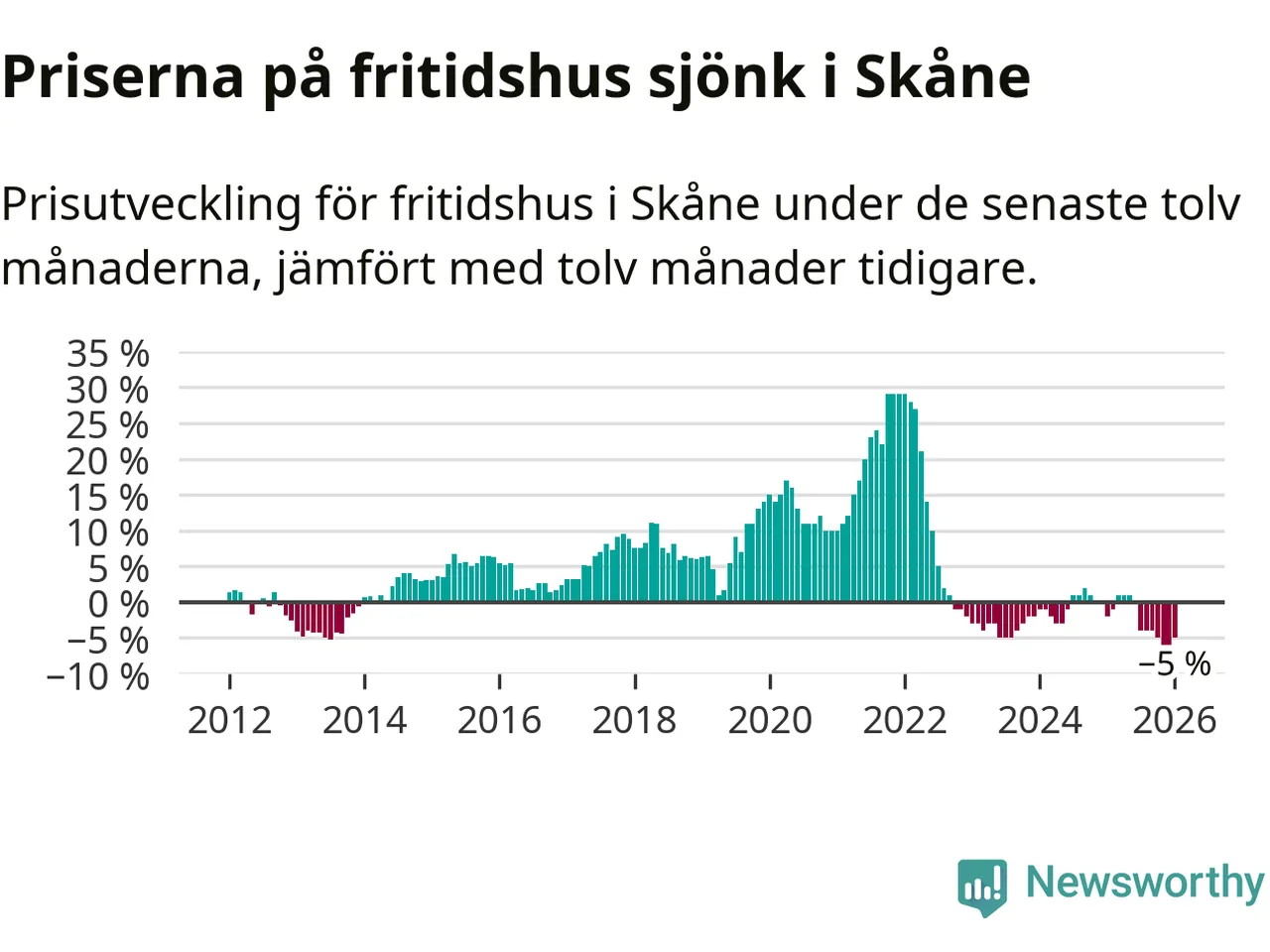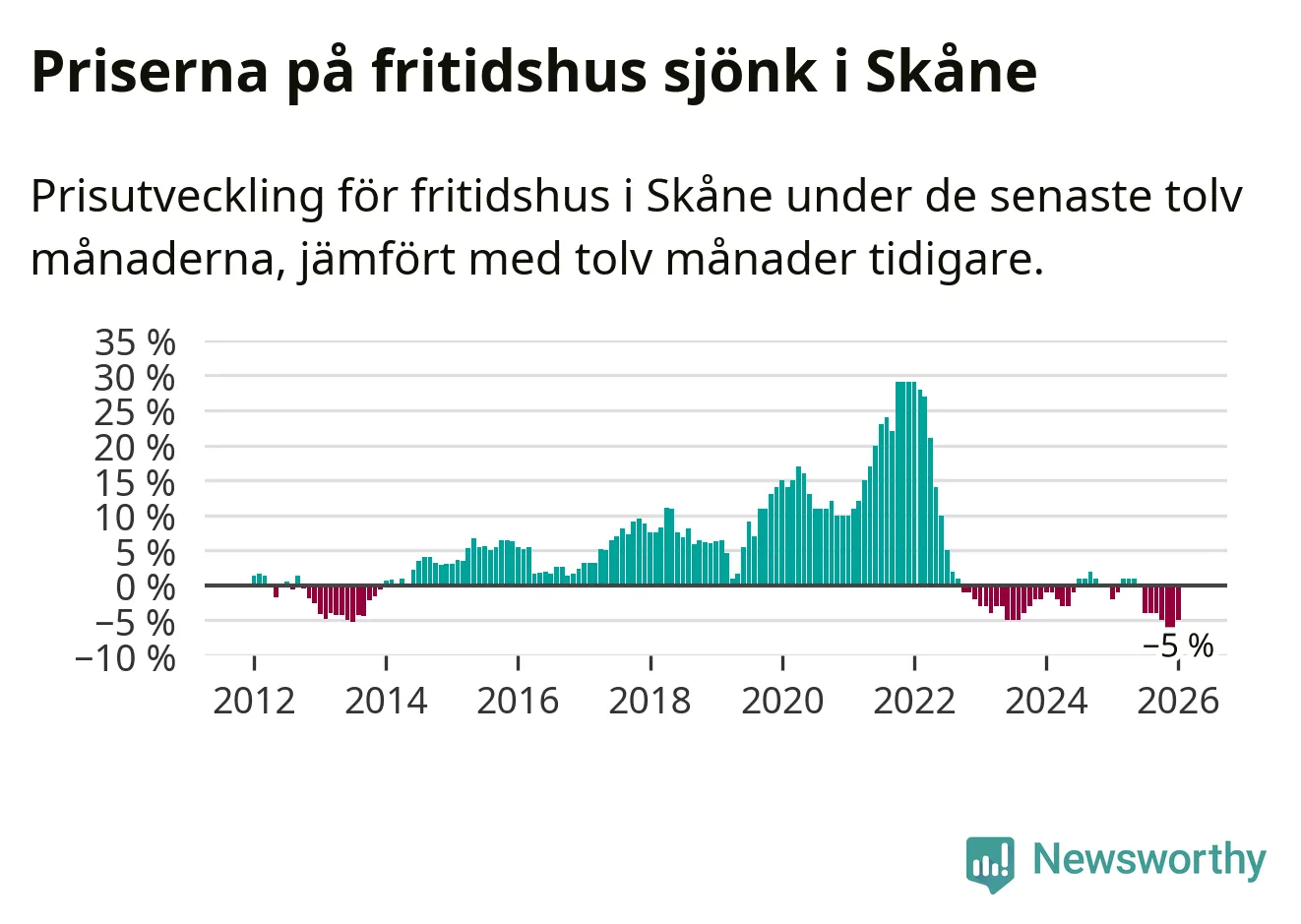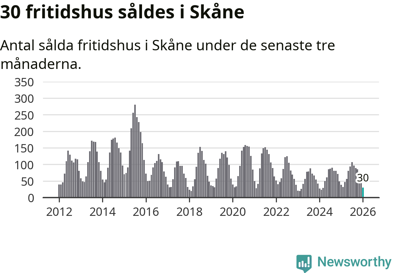 Sammanlagt såldes 30 fritidshus i Skåne län mellan november 2025 och januari till ett genomsnittligt pris på 1,8 miljoner kronor. I fjol gjordes 38 affärer vid den här tiden på året.