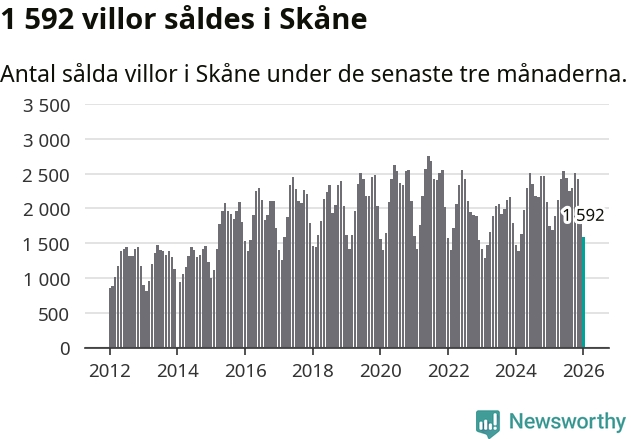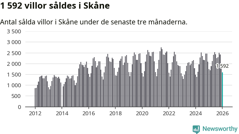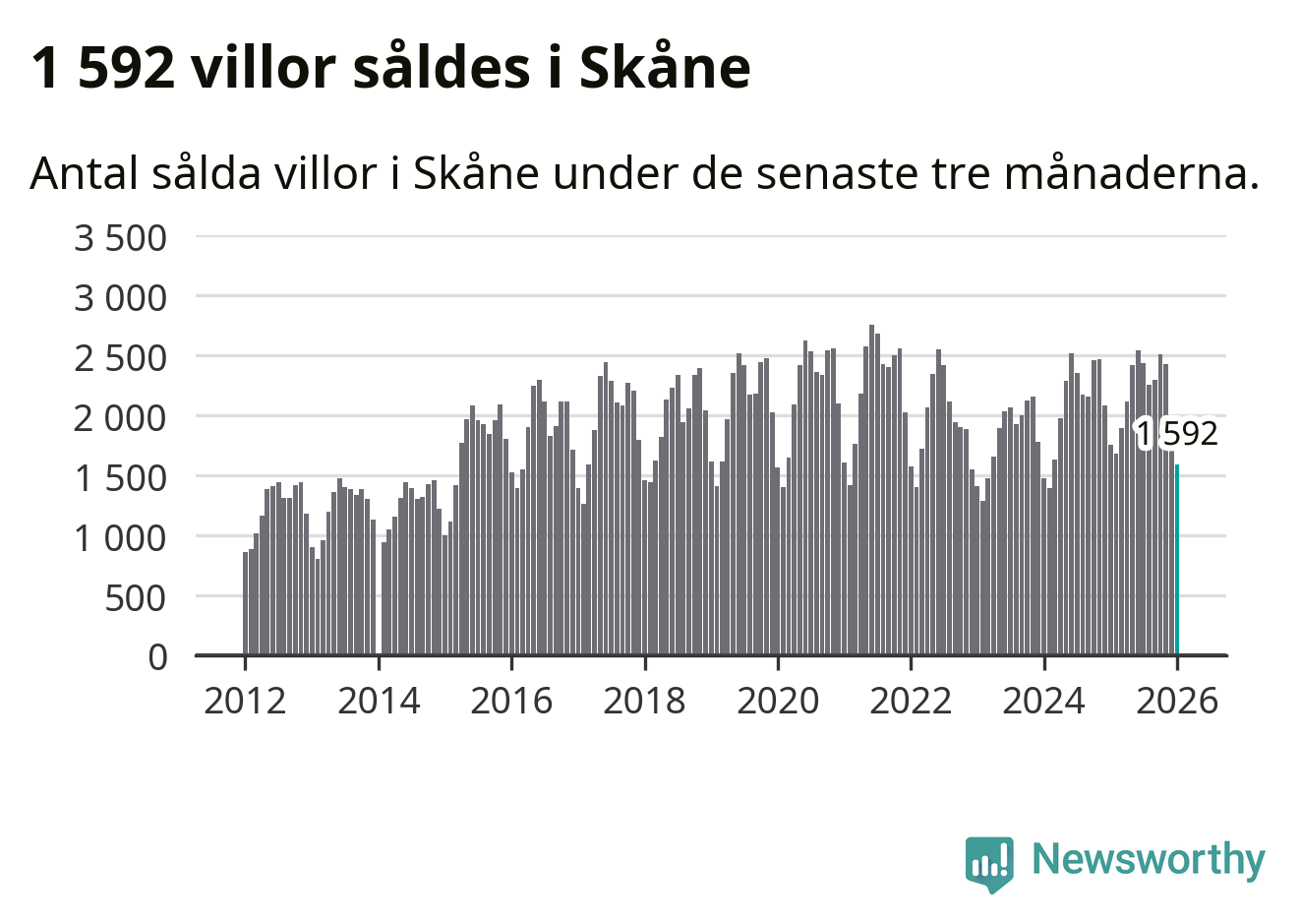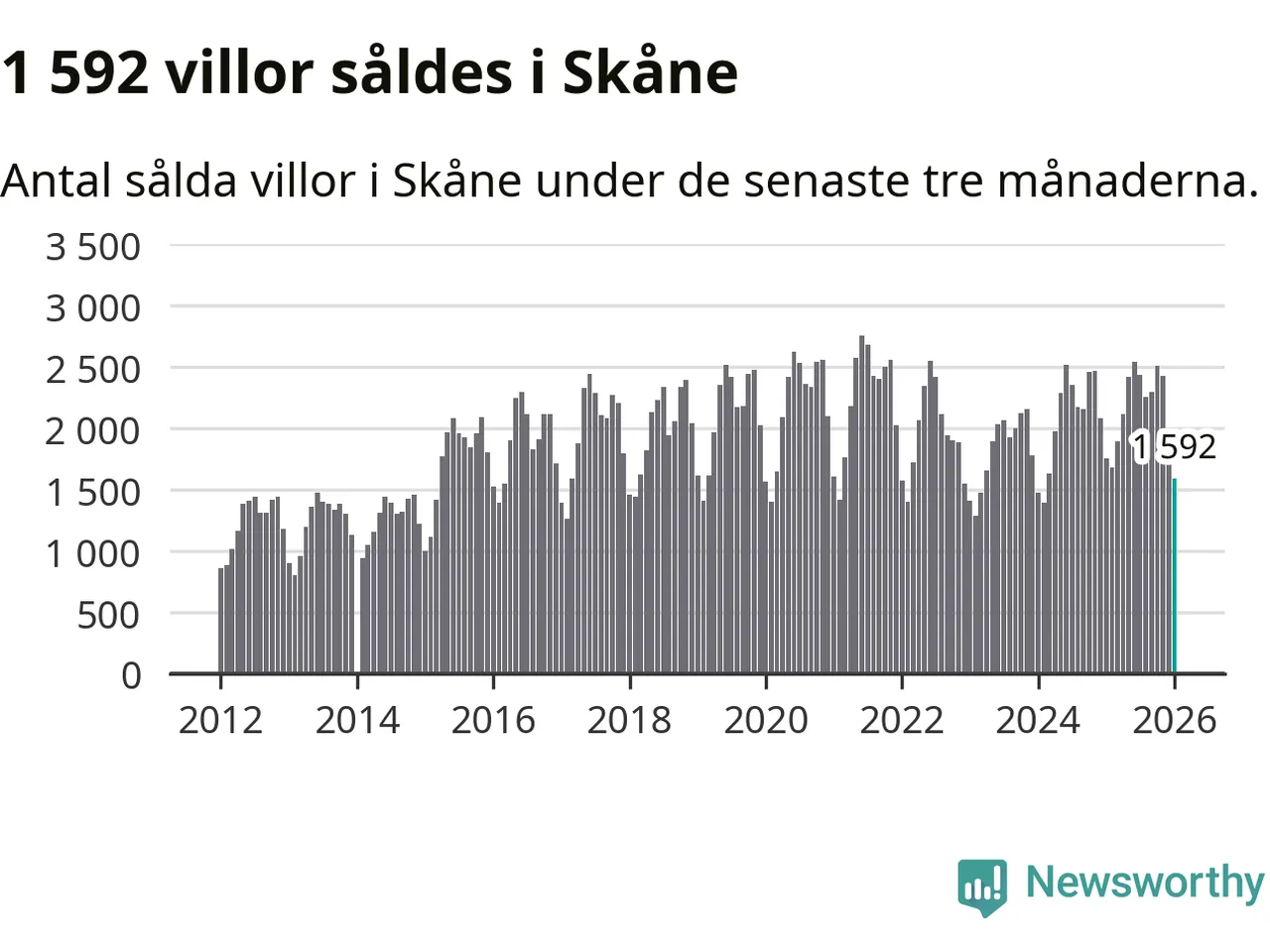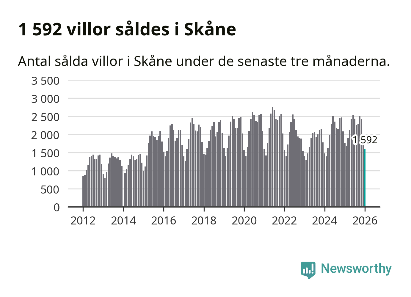 Sammanlagt såldes 1 592 villor i Skåne län mellan november och januari till ett genomsnittligt pris på 4,0 miljoner kronor. I fjol gjordes 1 753 affärer vid den här tiden på året.
