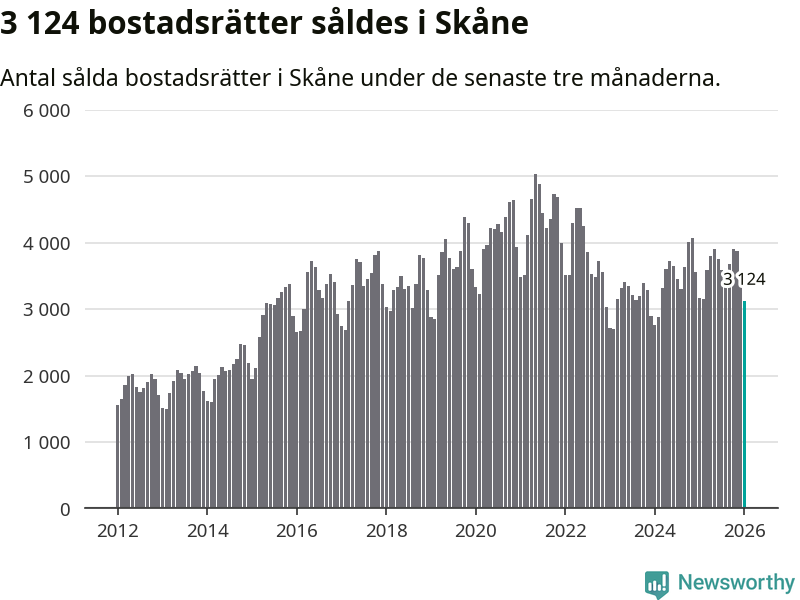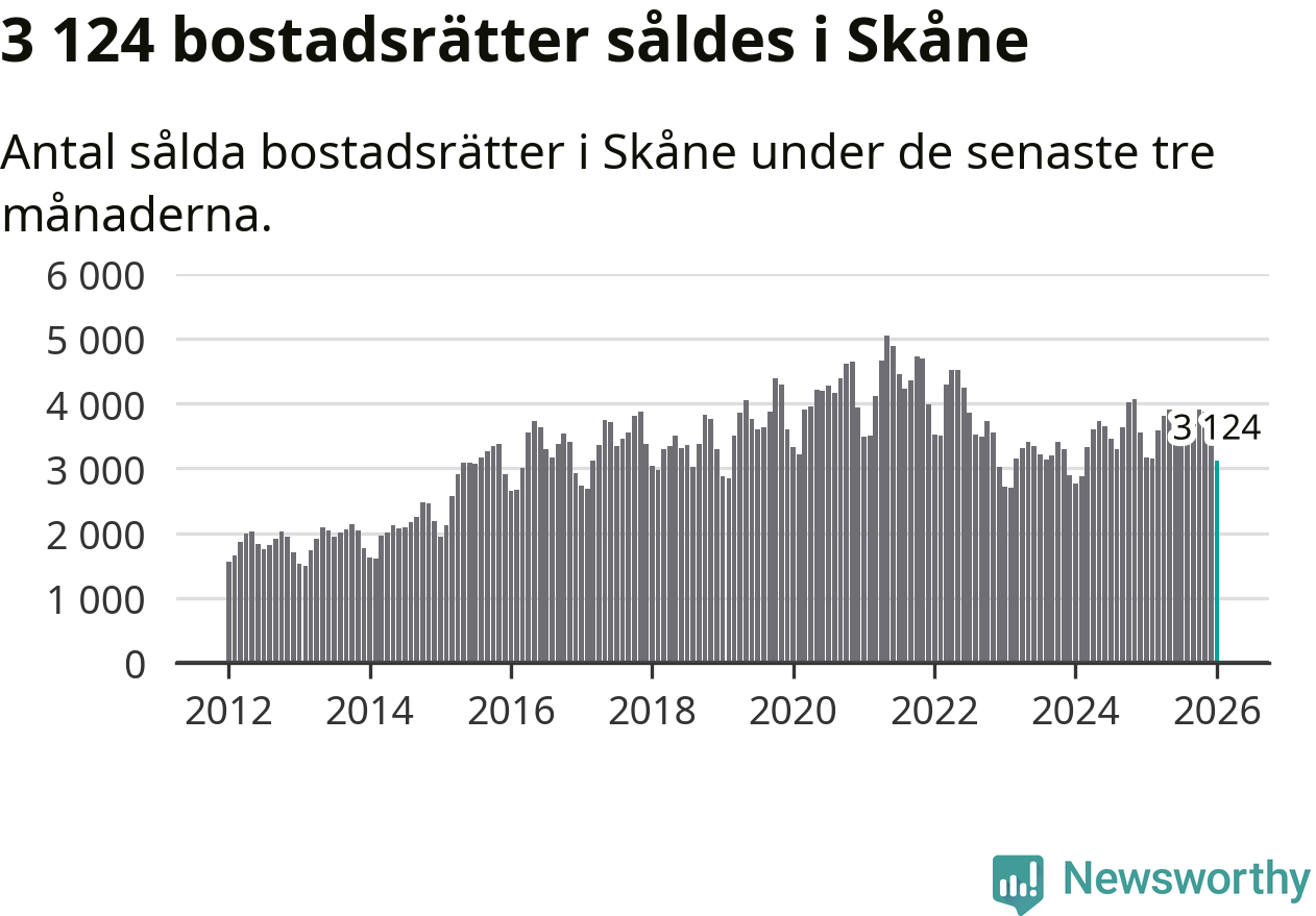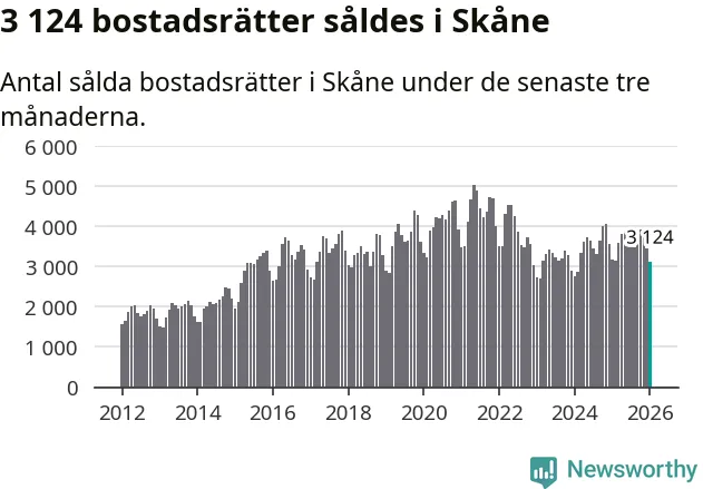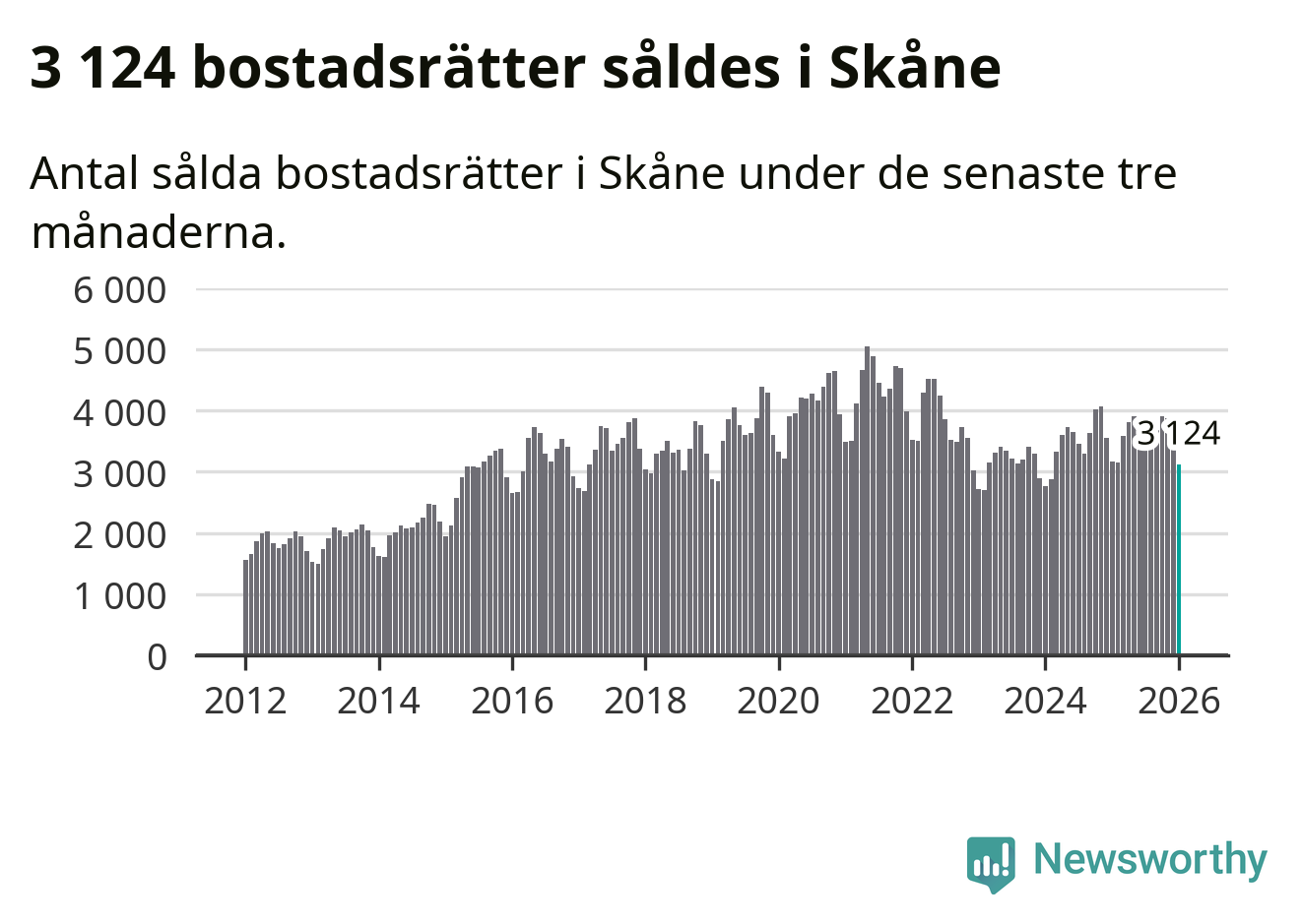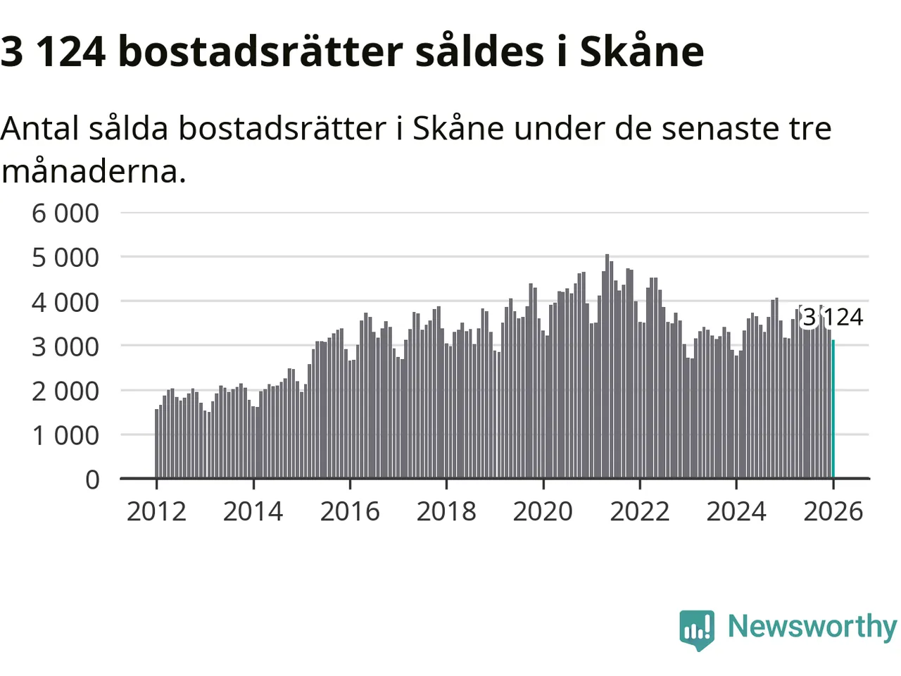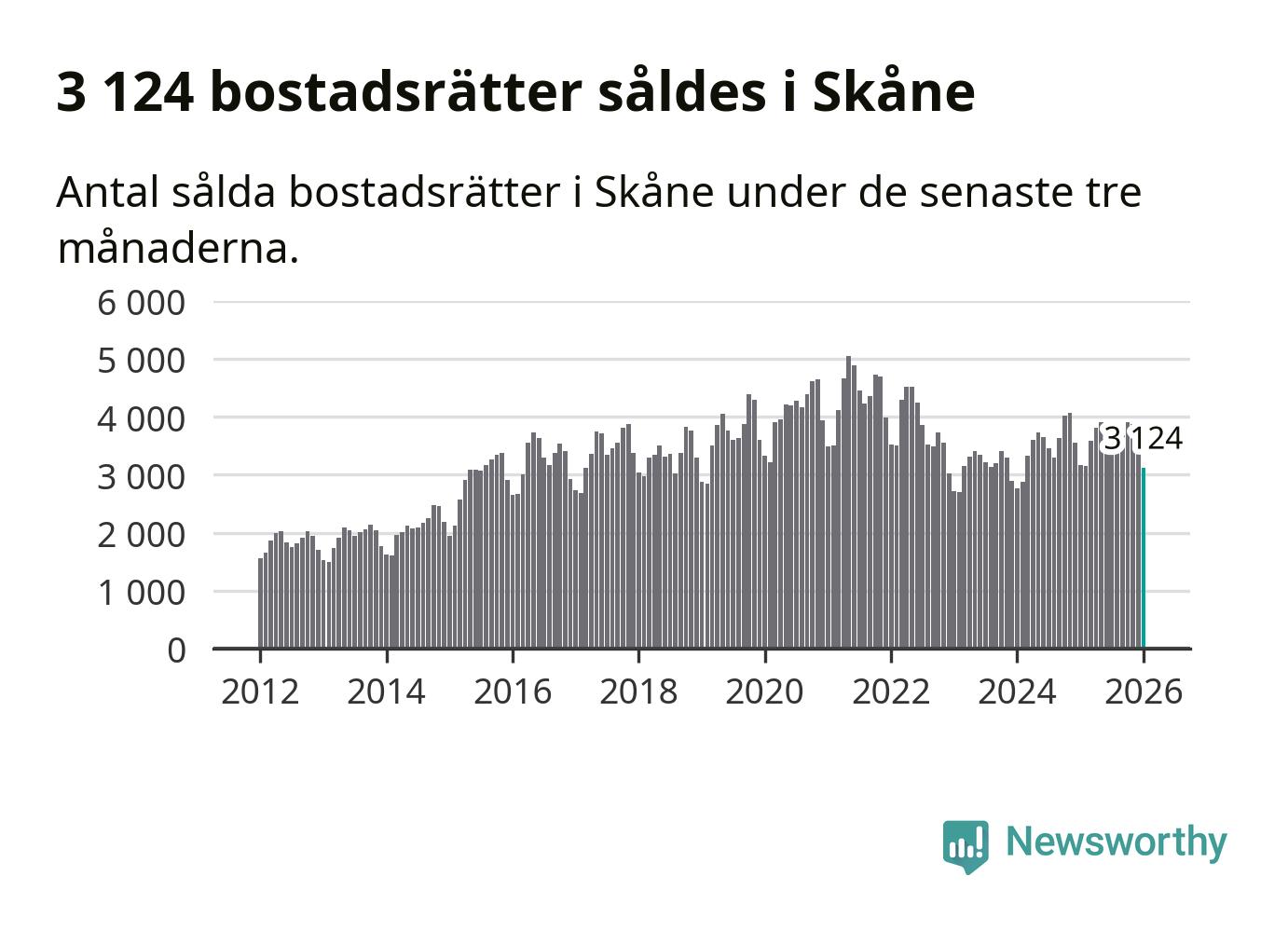 Sammanlagt såldes 3 124 bostadsrätter i Skåne län mellan november och januari till ett genomsnittligt pris på 2,3 miljoner kronor. I fjol gjordes 3 169 affärer vid den här tiden på året.