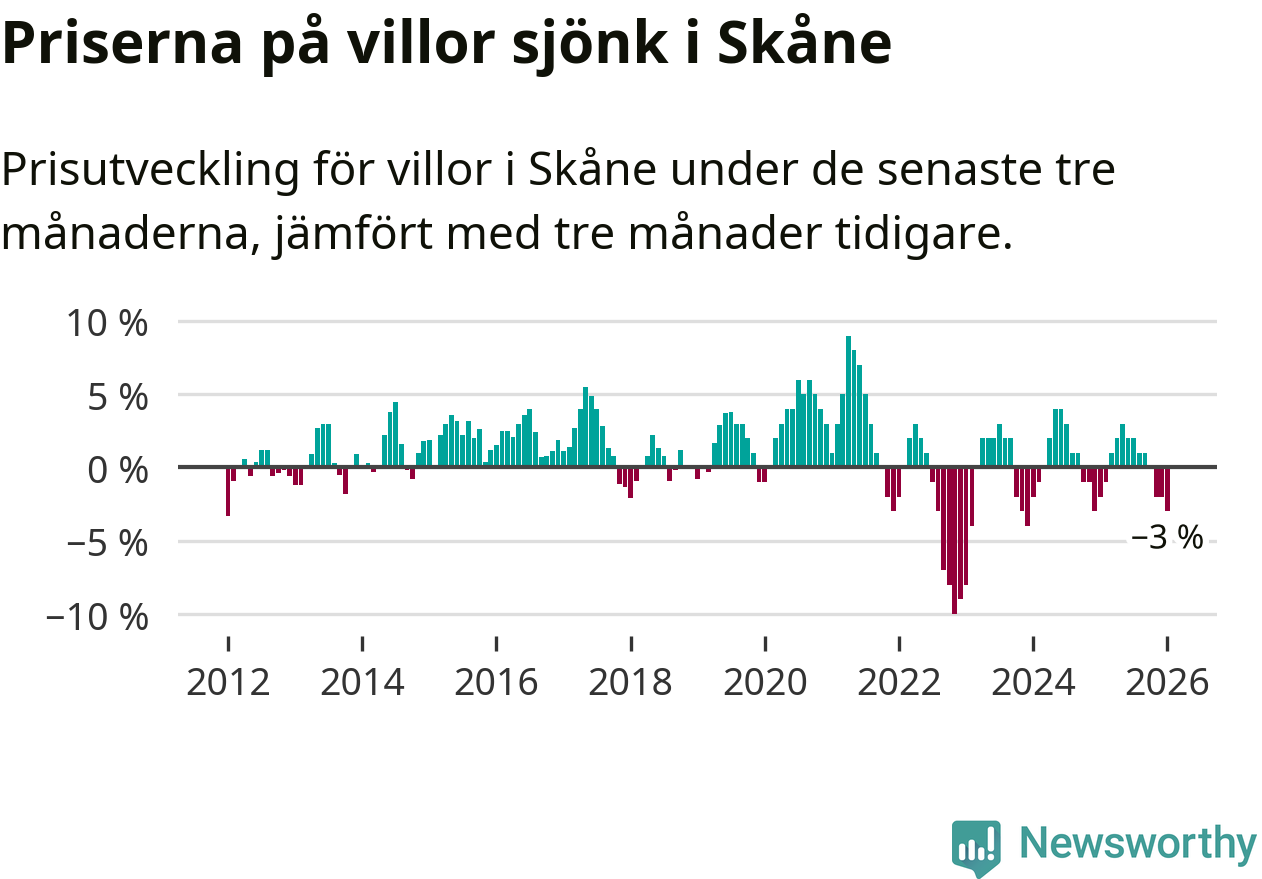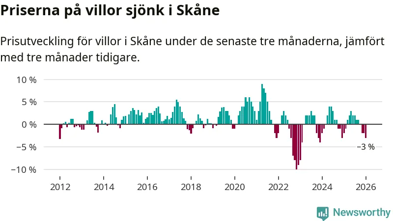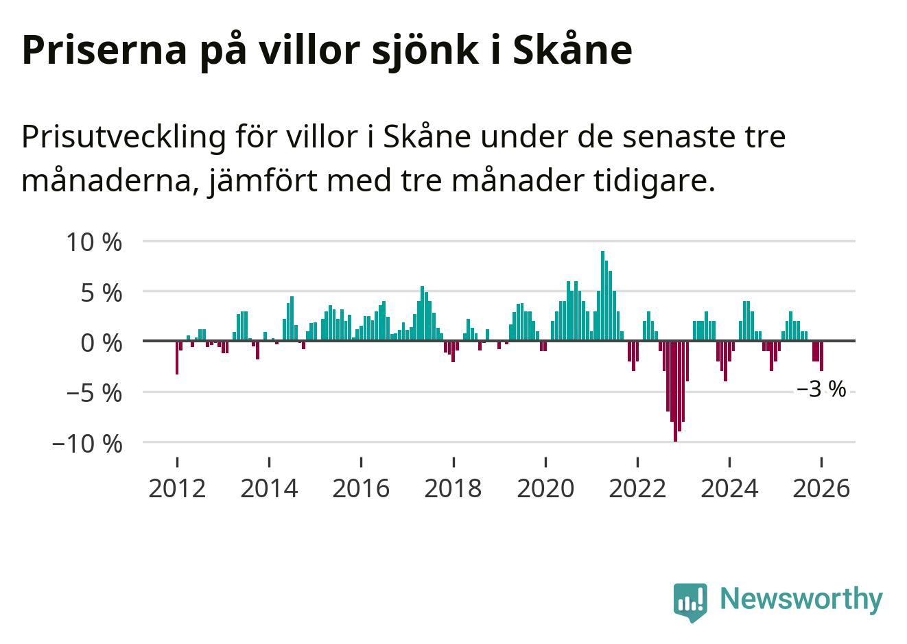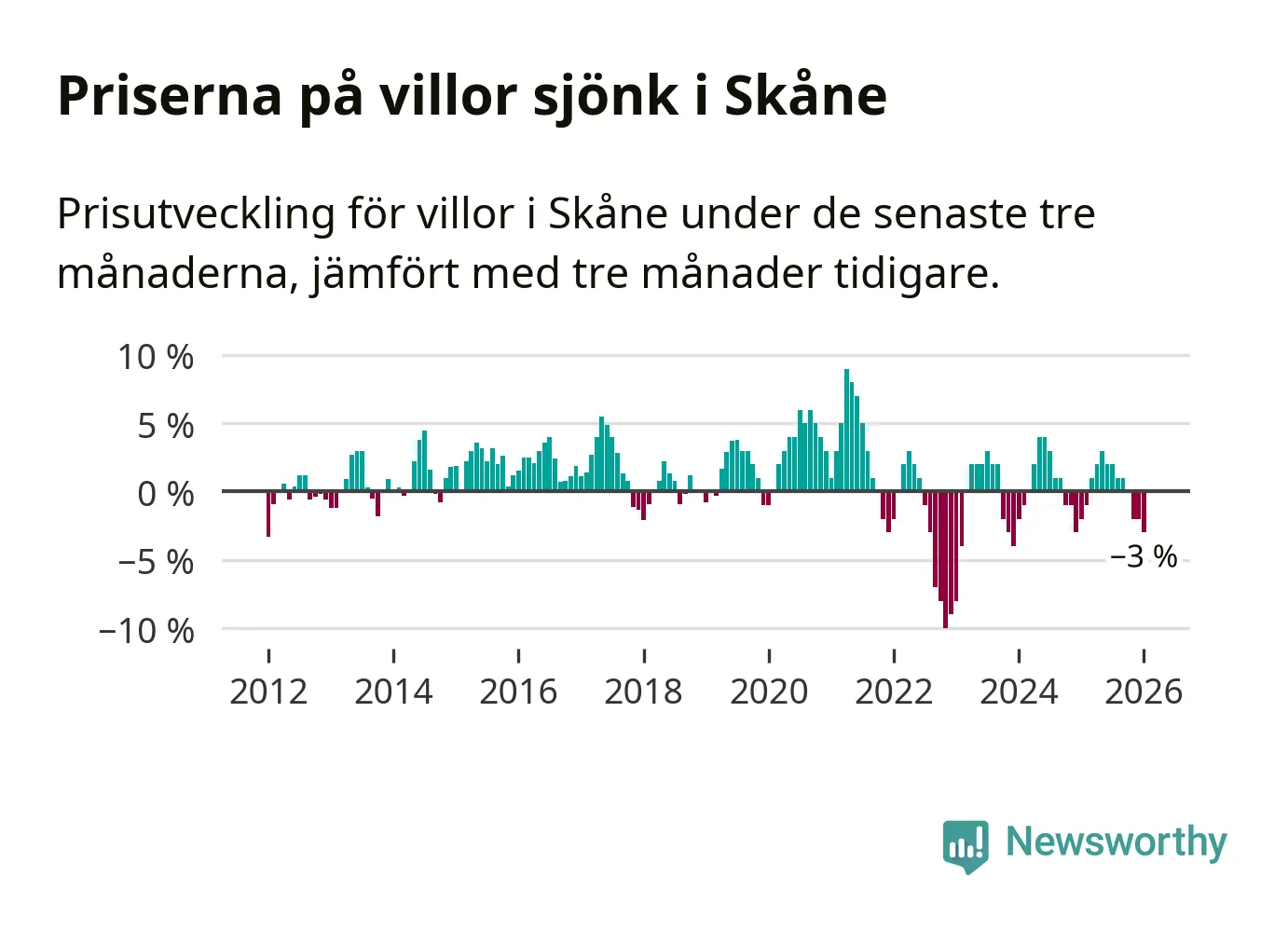 Villapriserna har gått ner i Skåne län. Medelpriset på försäljningarna under de senaste tre månaderna visar på en nedgång med 3 procent.