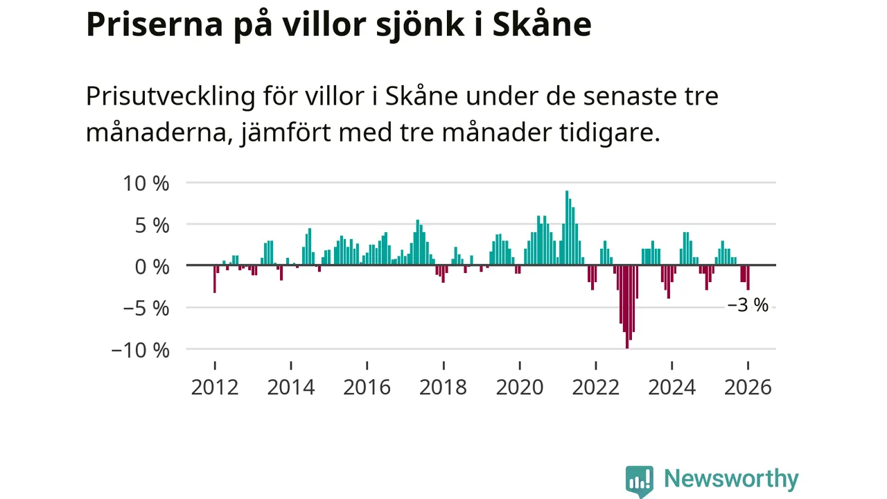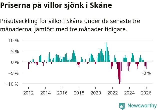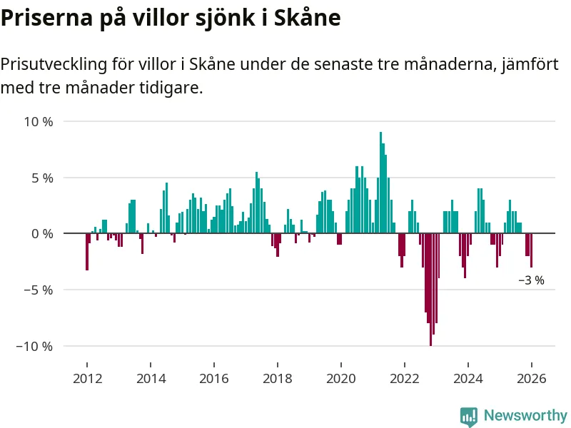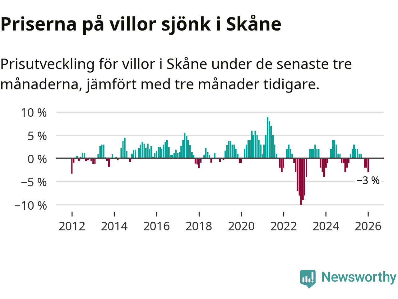 Villapriserna har gått ner i Skåne län. Medelpriset på försäljningarna under de senaste tre månaderna visar på en nedgång med 3 procent.