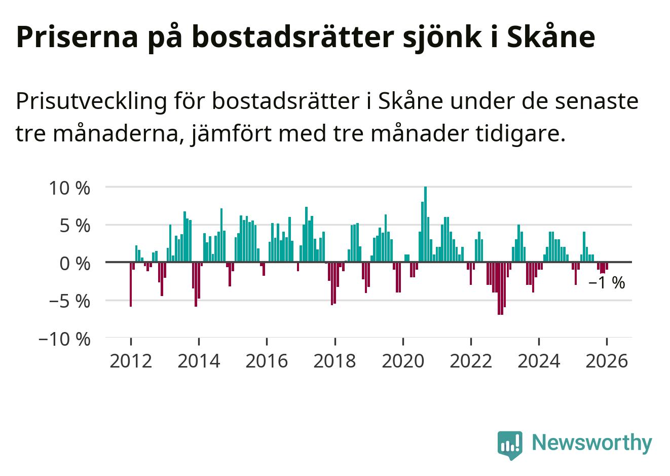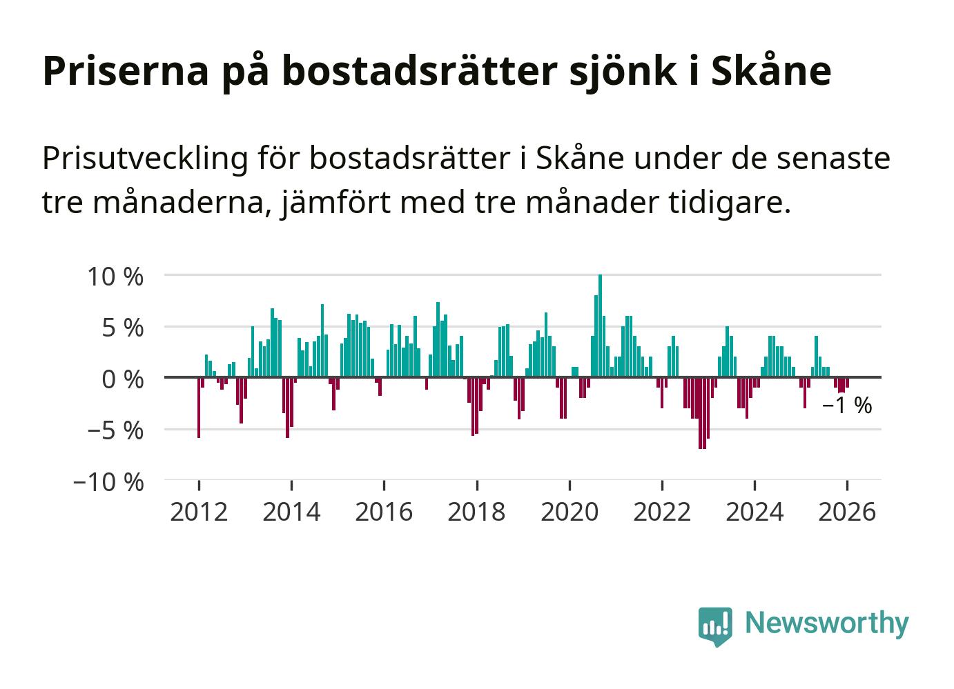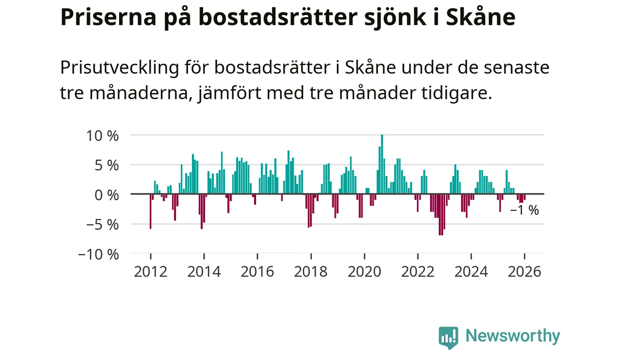 Priserna på bostadsrätter har gått ner i Skåne län. Medelpriset på försäljningarna under de senaste tre månaderna visar på en nedgång med 1 procent.