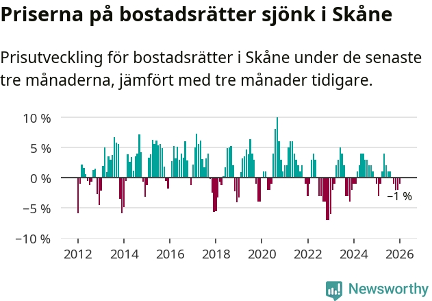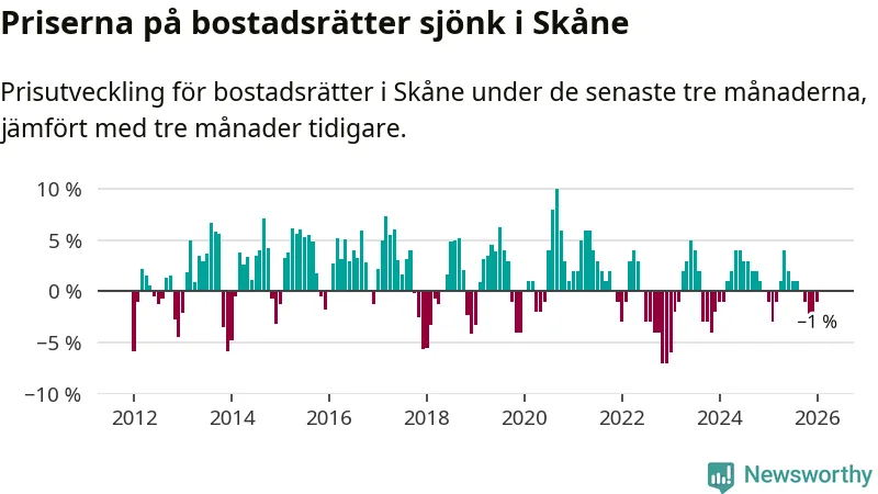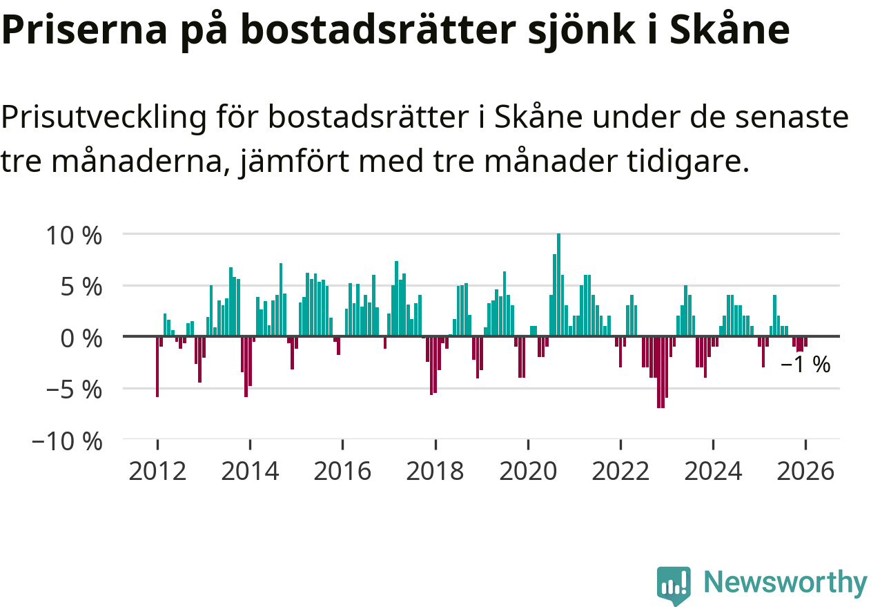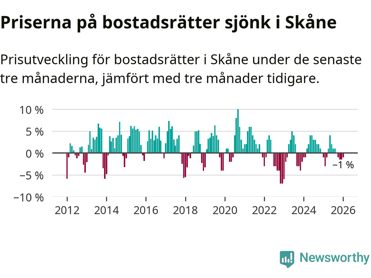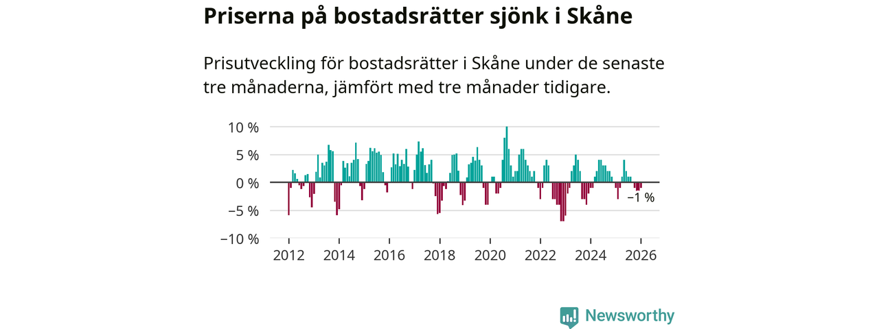 Priserna på bostadsrätter har gått ner i Skåne län. Medelpriset på försäljningarna under de senaste tre månaderna visar på en nedgång med 1 procent.