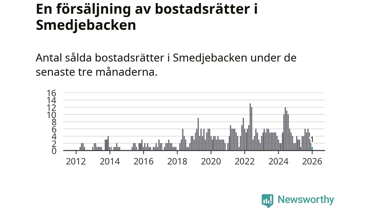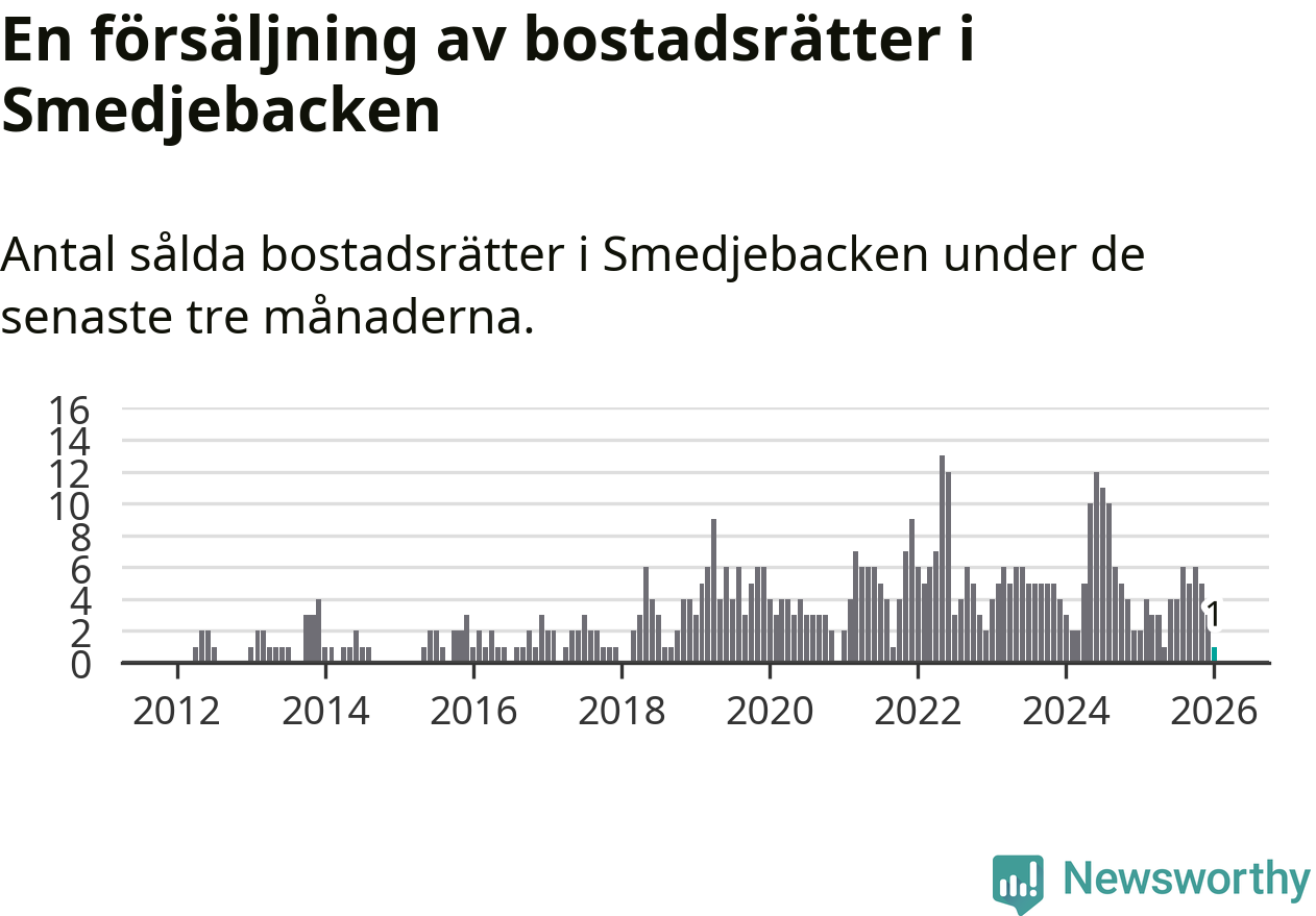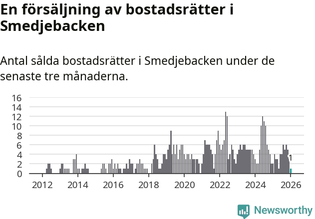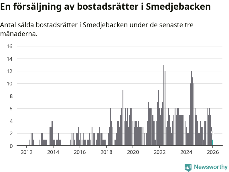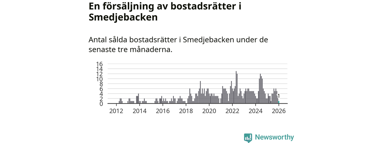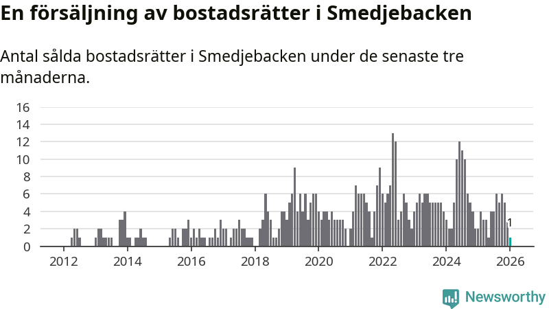 Mellan november och januari gjordes sammanlagt en affär med bostadsrätter i Smedjebackens kommun. Det kan jämföras med två vid motsvarande tid i fjol.