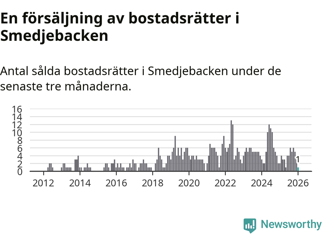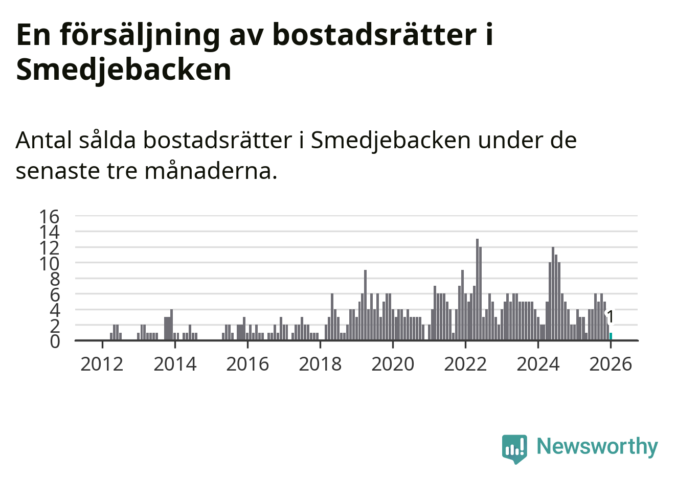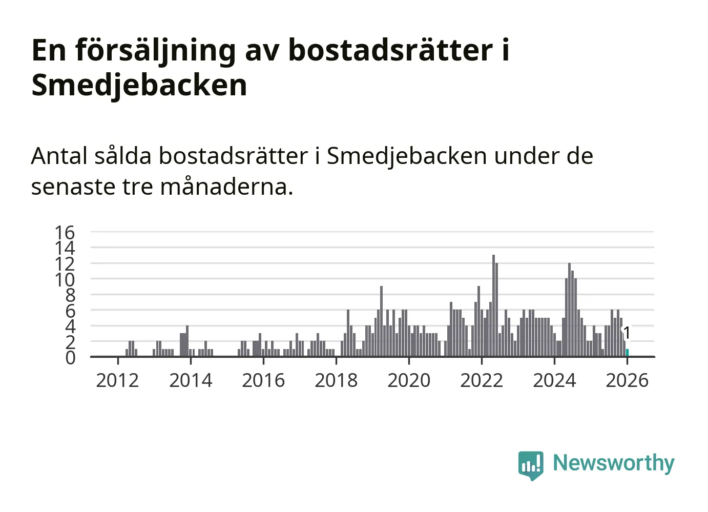 Mellan november och januari gjordes sammanlagt en affär med bostadsrätter i Smedjebackens kommun. Det kan jämföras med två vid motsvarande tid i fjol.