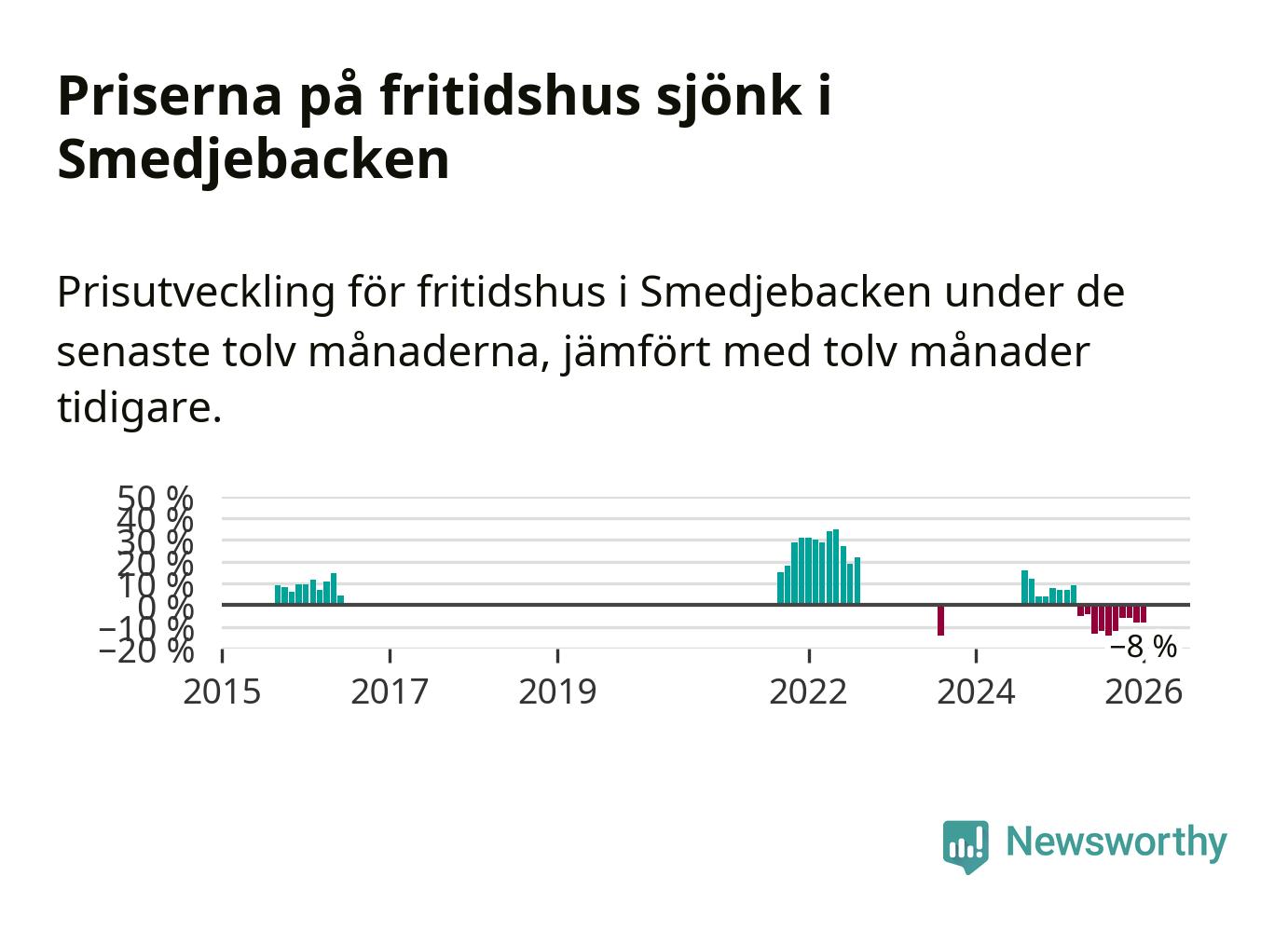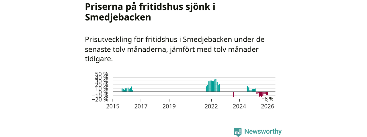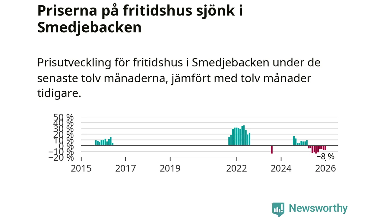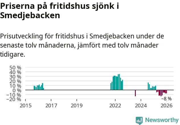 Statistiken visar även på en stor prisnedgång i Smedjebackens kommun. Medelpriset på försäljningarna av fritidshus i kommunen var 8 procent lägre än för ett år sedan. Även i hela Dalarna sjunker priserna på fritidshus. I hela länet noterades en prisnedgång på 5 procent.