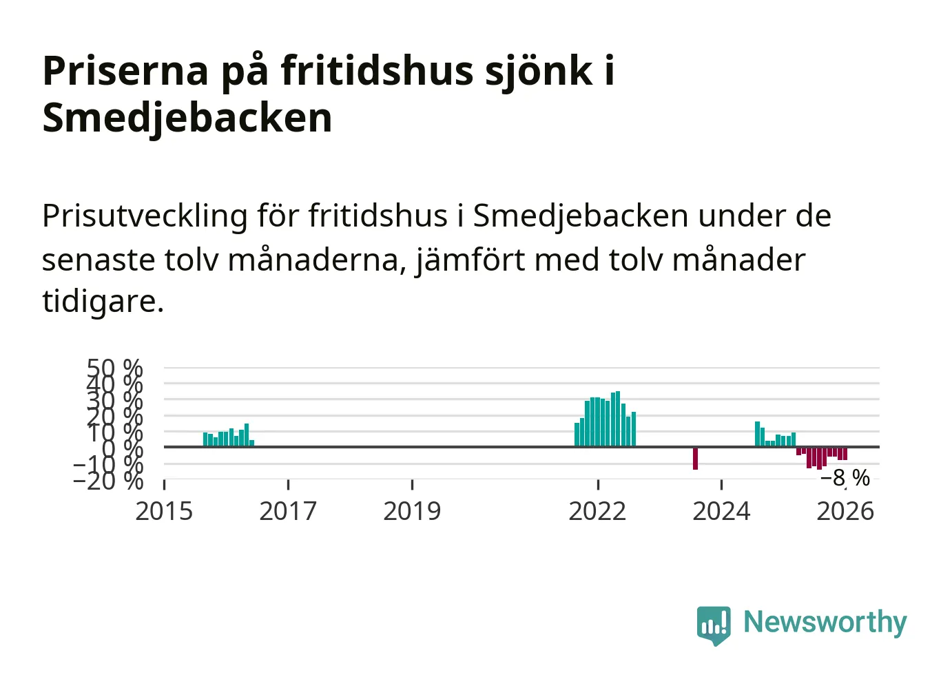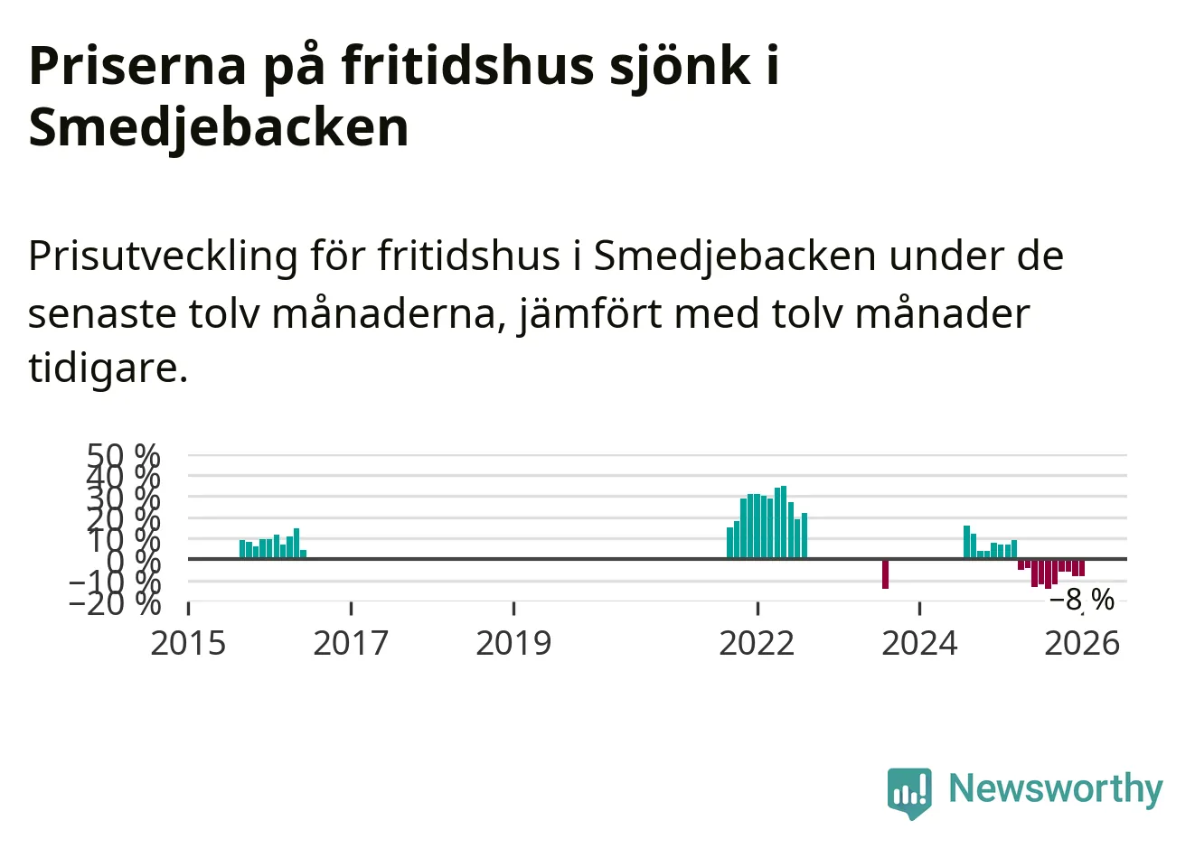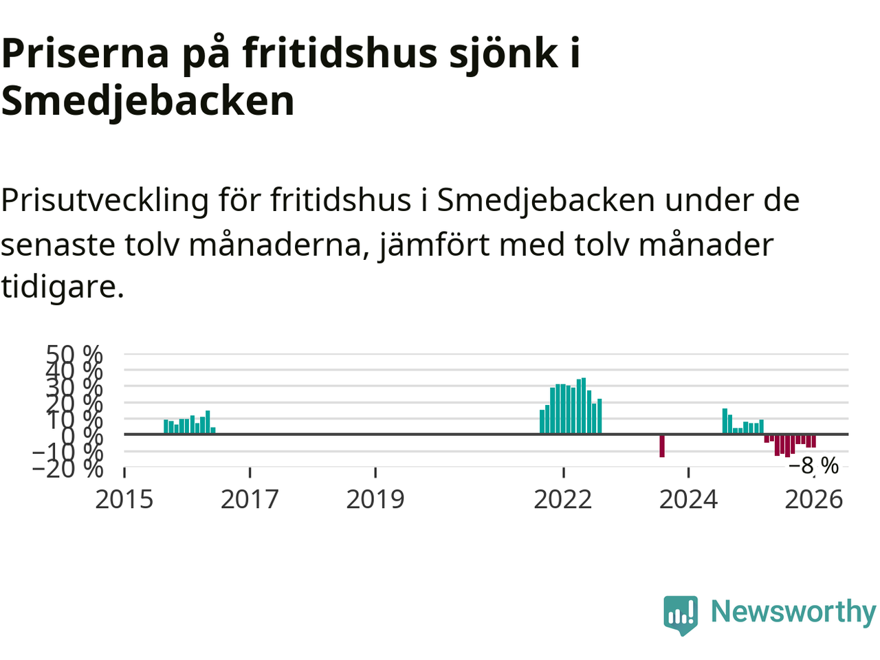 Statistiken visar även på en stor prisnedgång i Smedjebackens kommun. Medelpriset på försäljningarna av fritidshus i kommunen var 8 procent lägre än för ett år sedan. Även i hela Dalarna sjunker priserna på fritidshus. I hela länet noterades en prisnedgång på 5 procent.