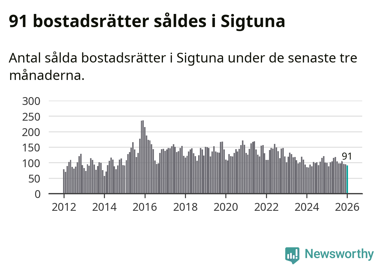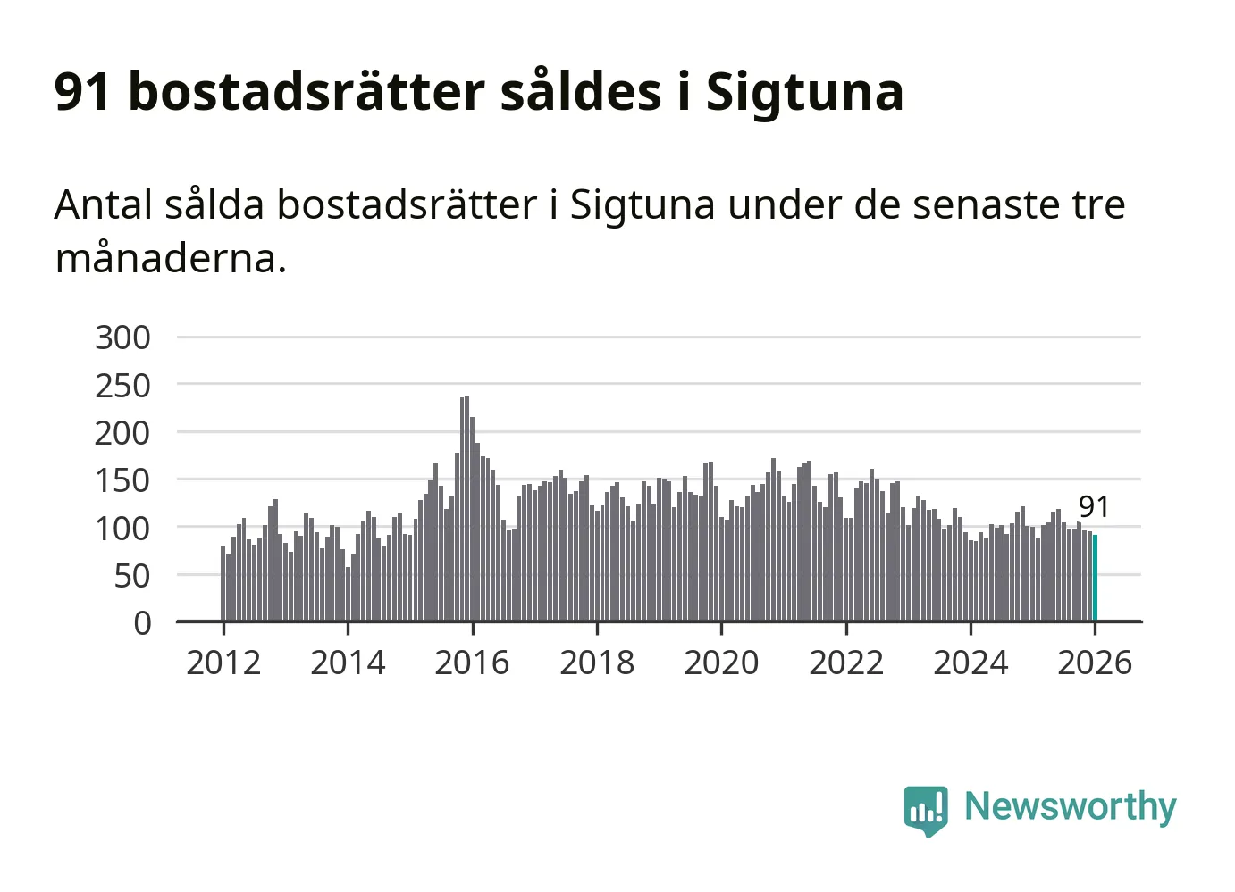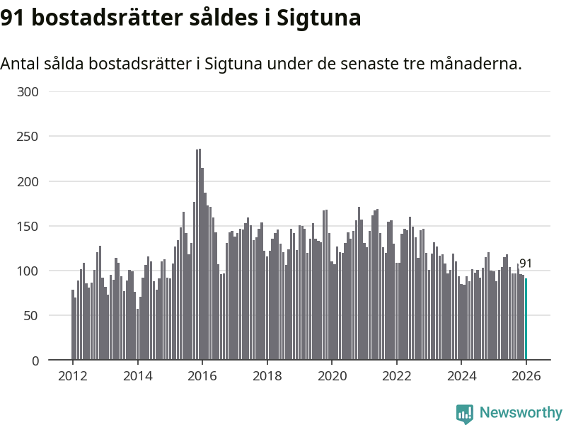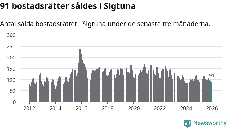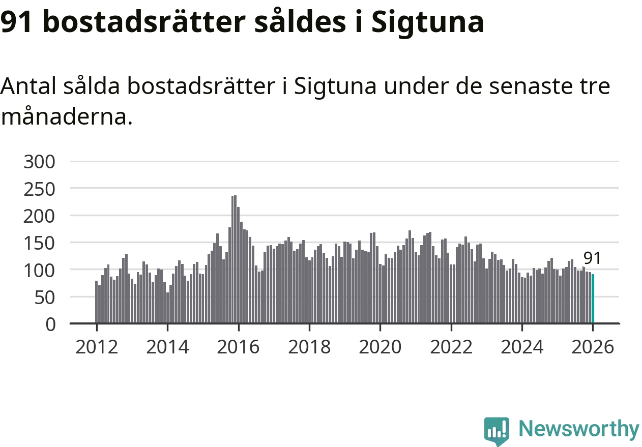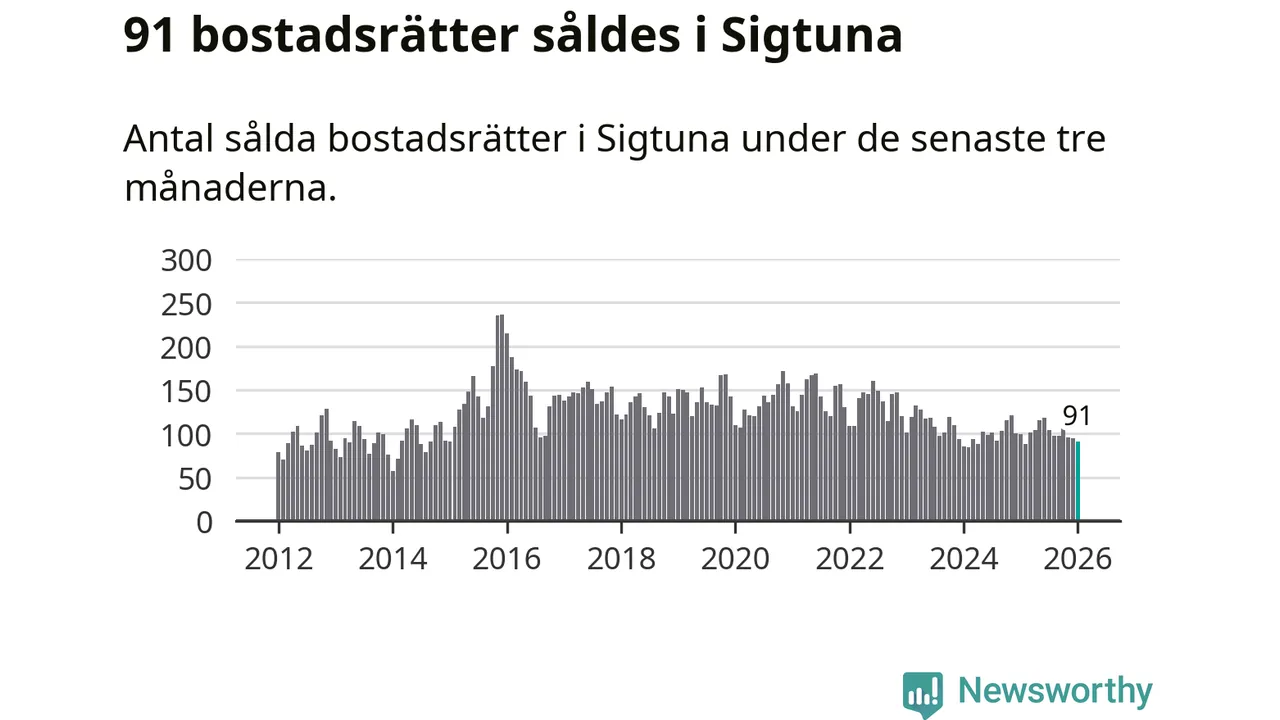 Sammanlagt såldes 91 bostadsrätter i Sigtuna kommun mellan november och januari till ett genomsnittligt pris på 2,1 miljoner kronor. I fjol gjordes 99 affärer vid den här tiden på året.