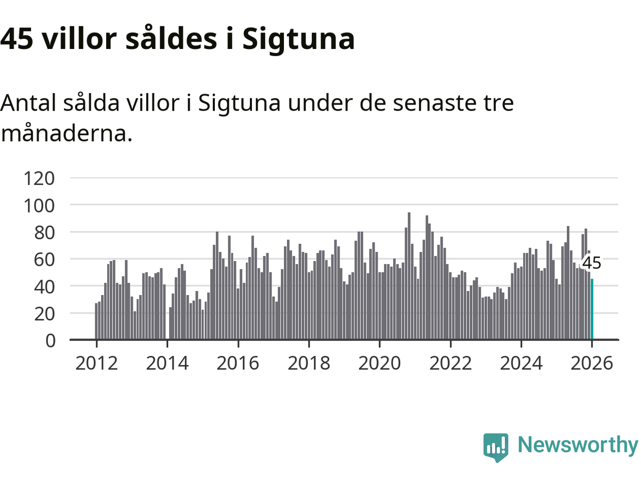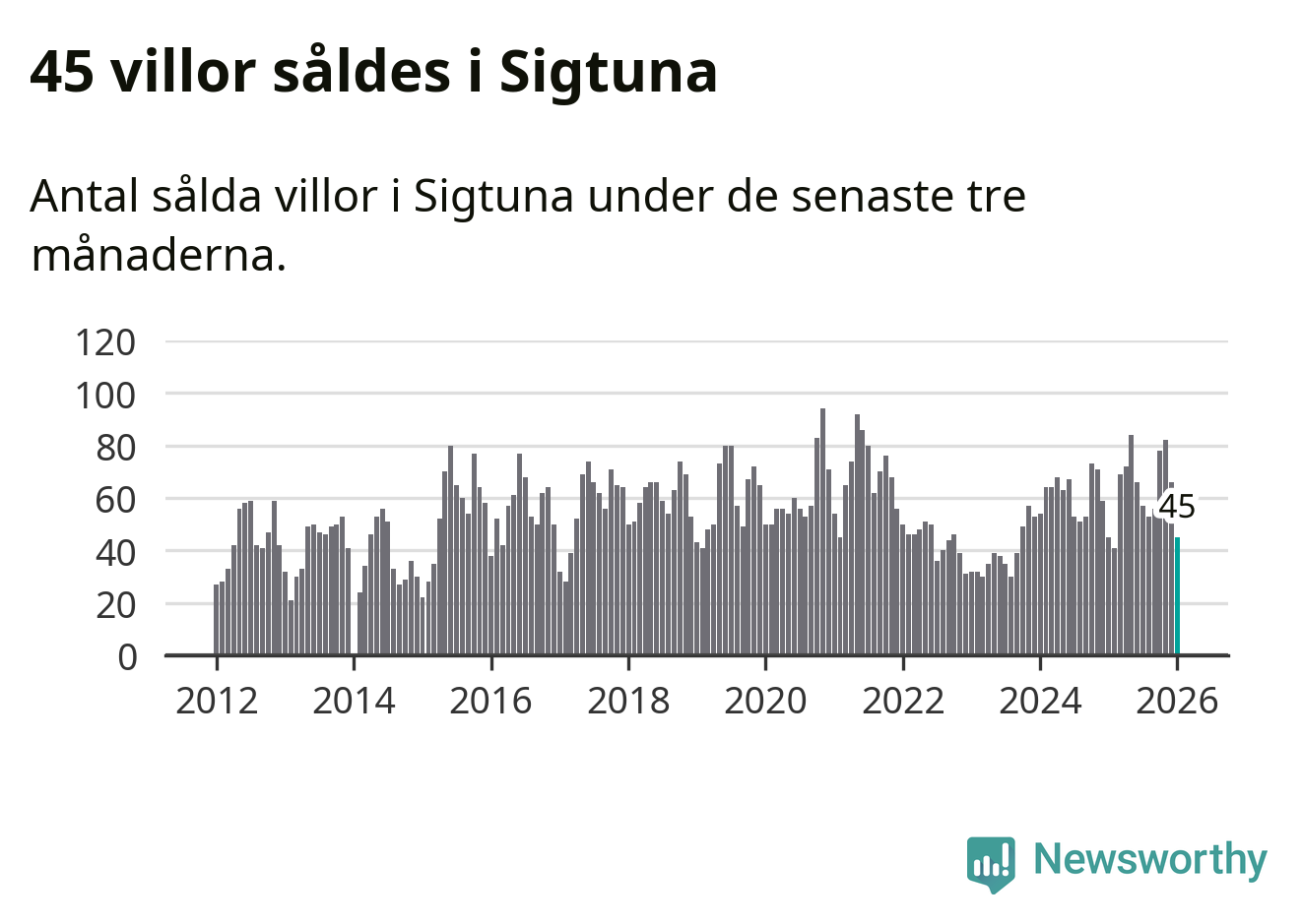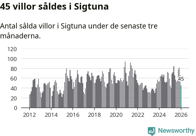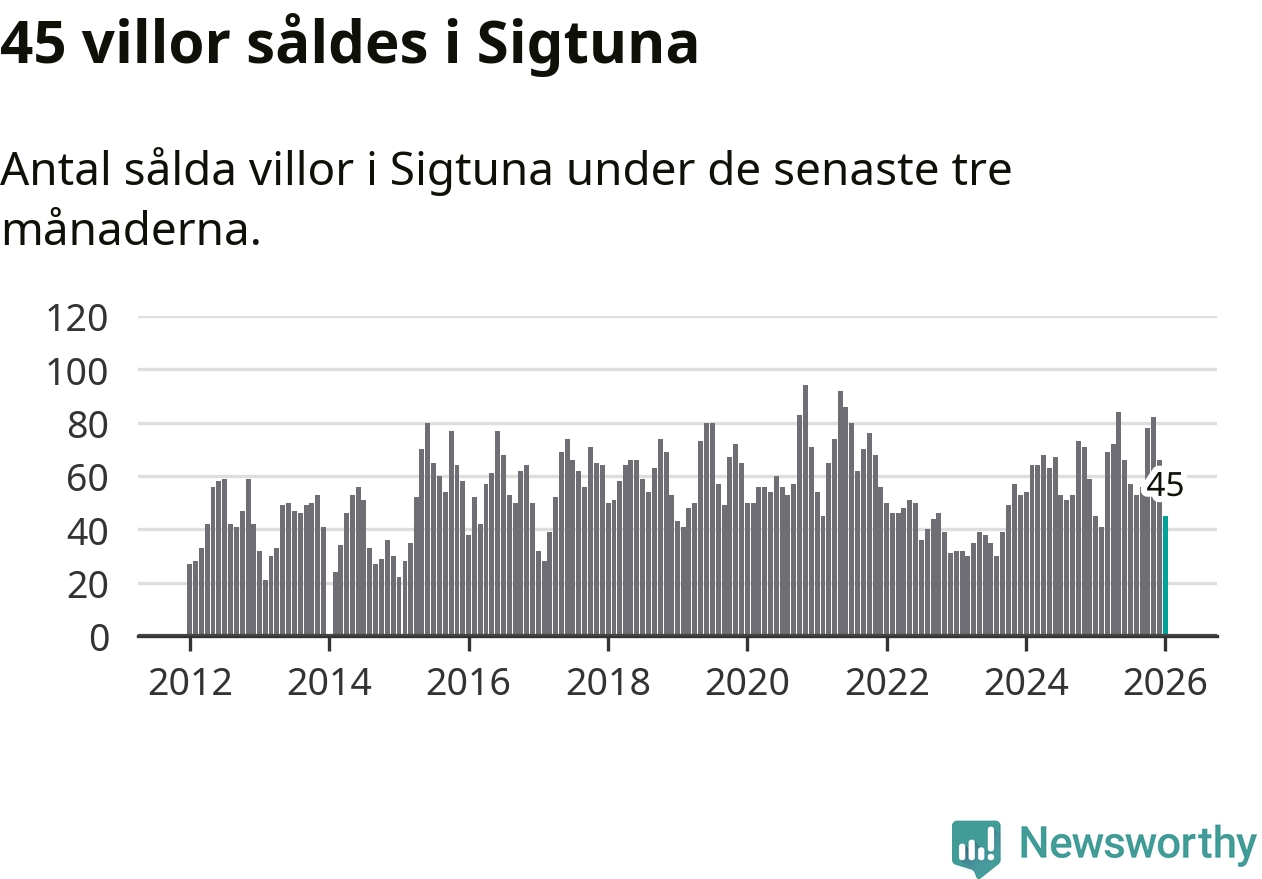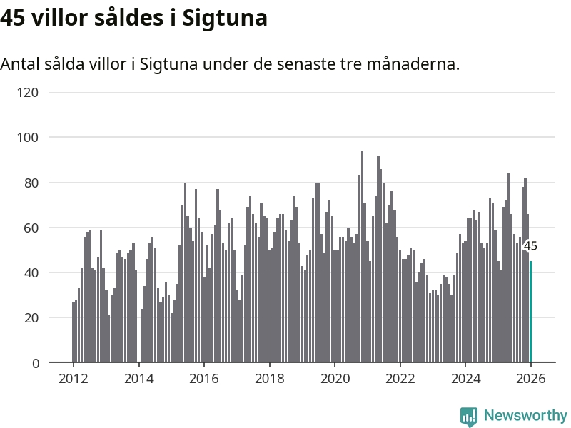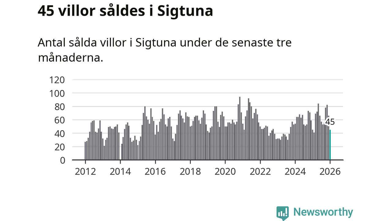 Sammanlagt såldes 45 villor i Sigtuna kommun mellan november och januari till ett genomsnittligt pris på 5,5 miljoner kronor. I fjol gjordes 45 affärer vid den här tiden på året.