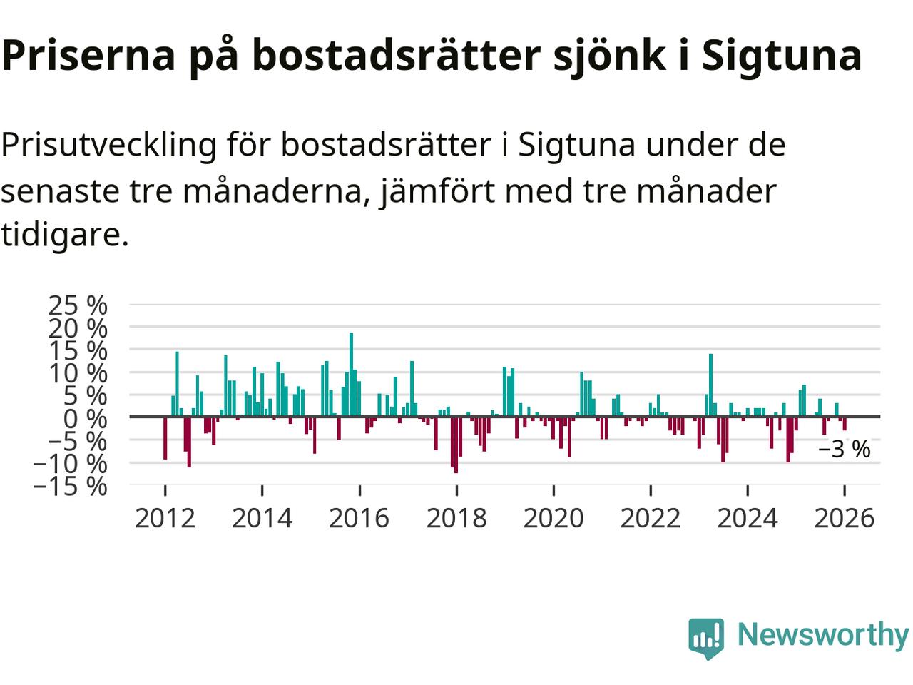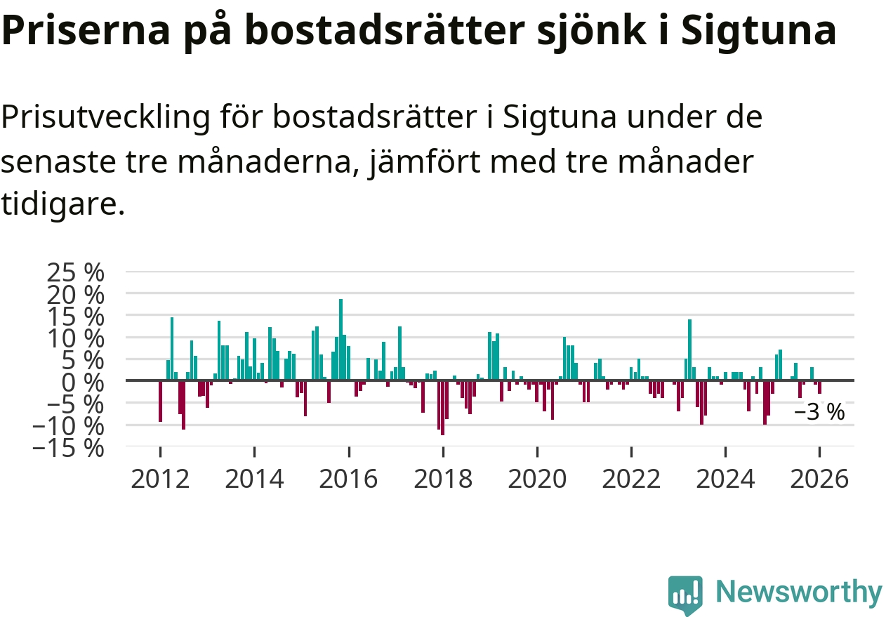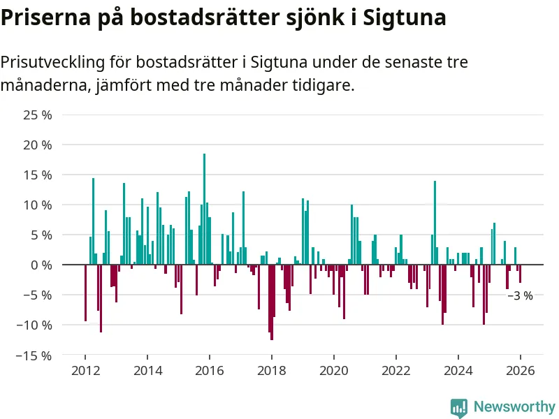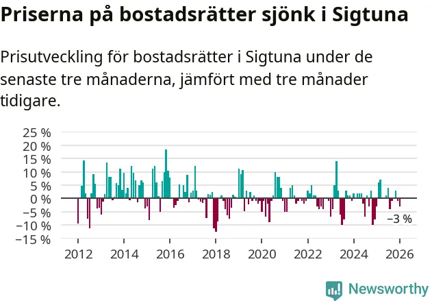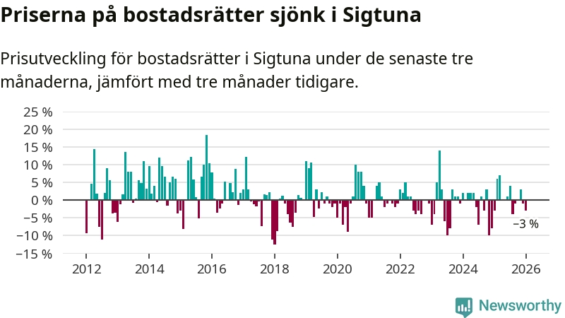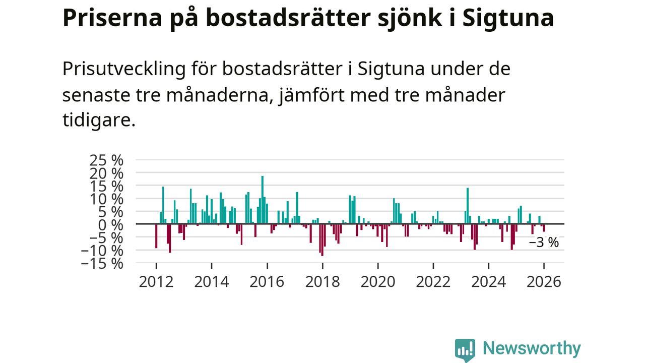 Priserna på bostadsrätter har gått ner i Sigtuna kommun. Medelpriset på försäljningarna under de senaste tre månaderna visar på en nedgång med 3 procent.