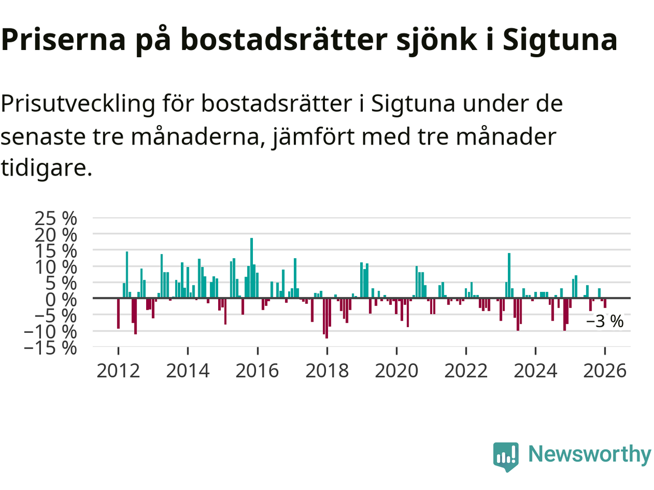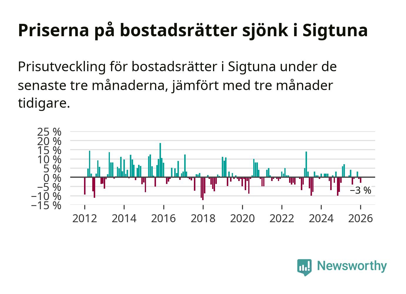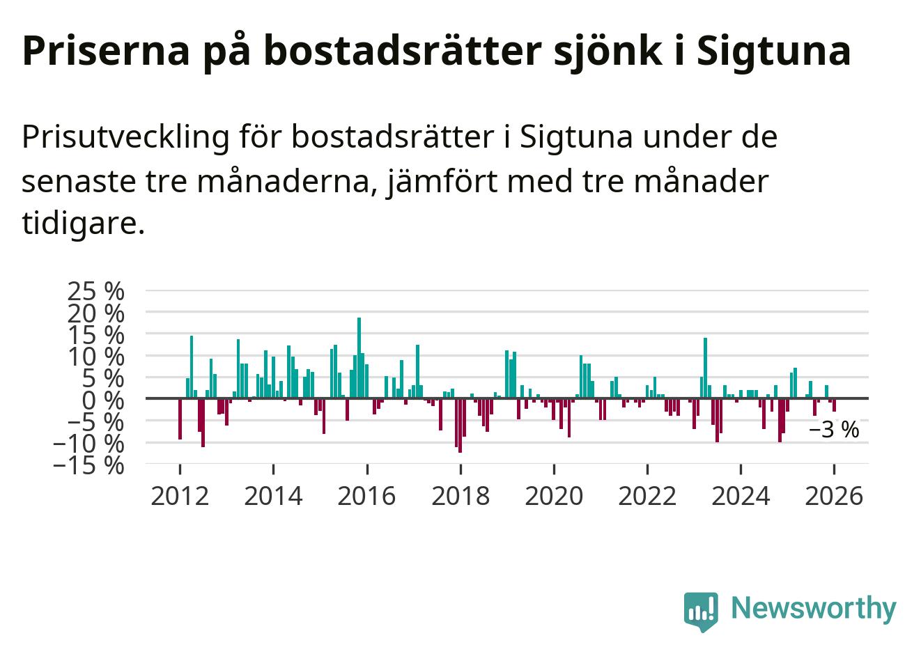 Priserna på bostadsrätter har gått ner i Sigtuna kommun. Medelpriset på försäljningarna under de senaste tre månaderna visar på en nedgång med 3 procent.