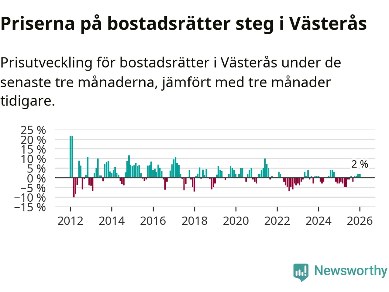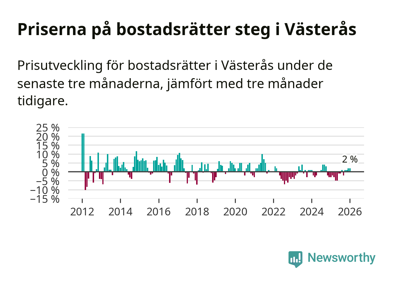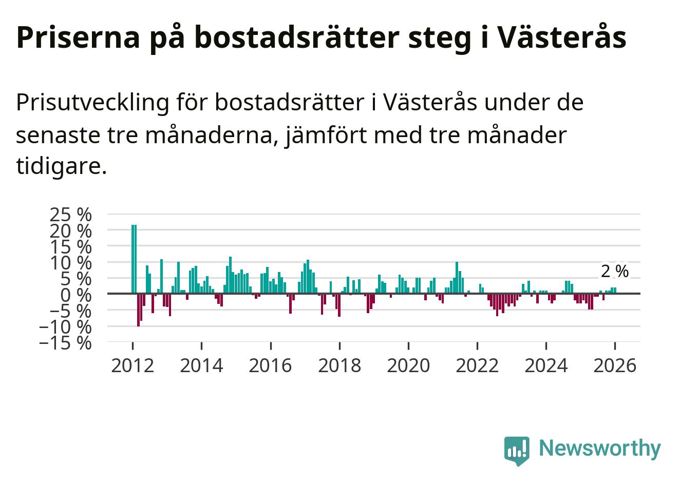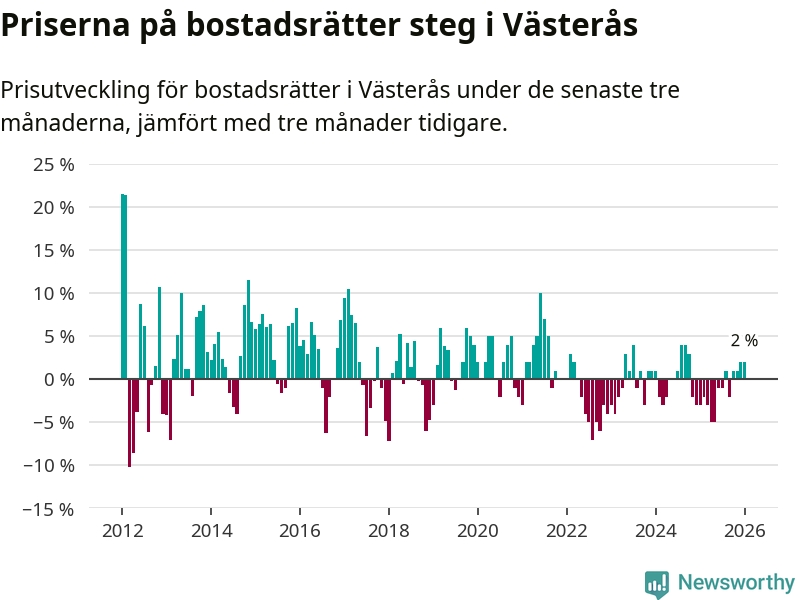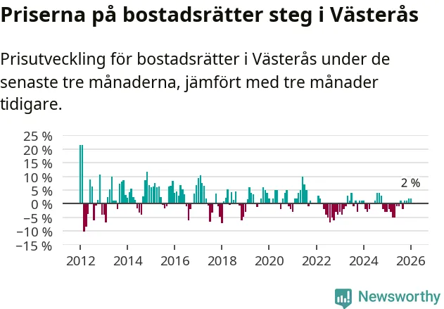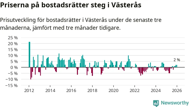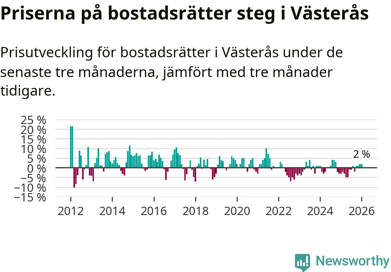 Priserna på bostadsrätter har gått upp i Västerås kommun. Medelpriset på försäljningarna under de senaste tre månaderna visar på en uppgång med 2 procent.