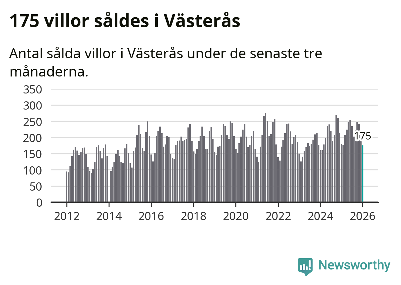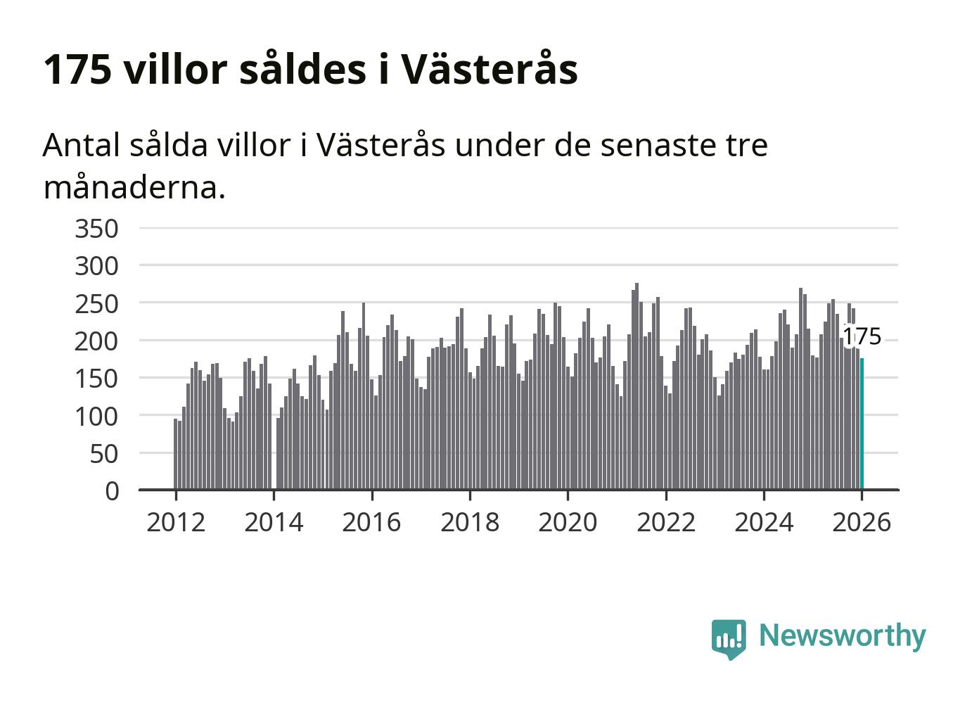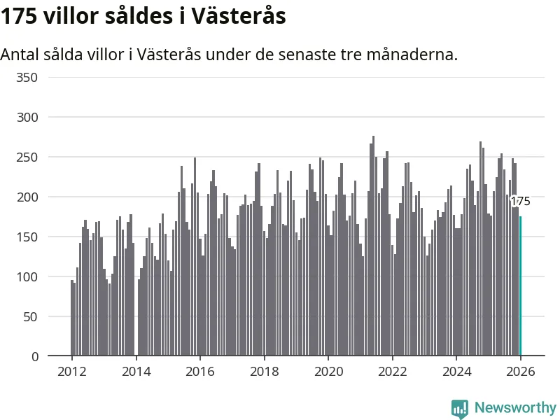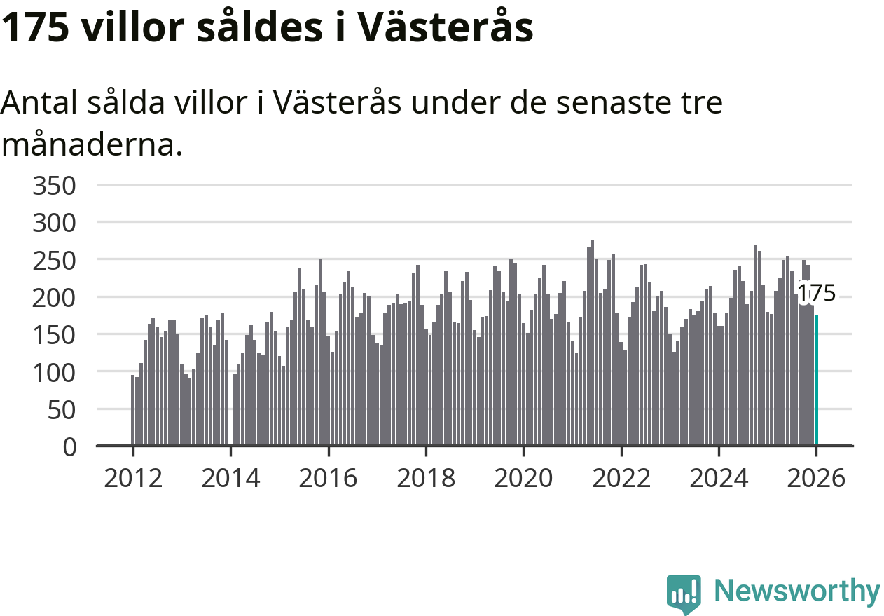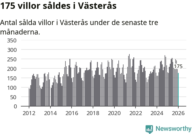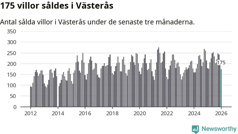 Sammanlagt såldes 175 villor i Västerås kommun mellan november och januari till ett genomsnittligt pris på 4,1 miljoner kronor. I fjol gjordes 179 affärer vid den här tiden på året.