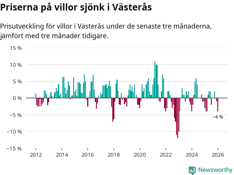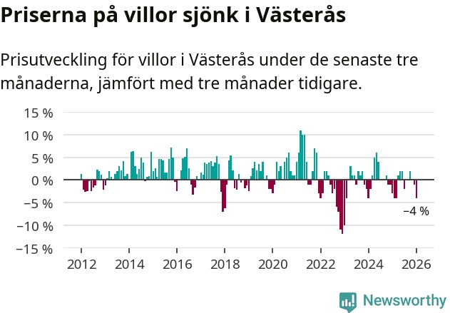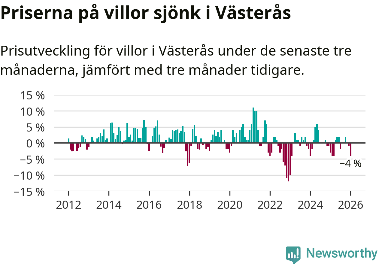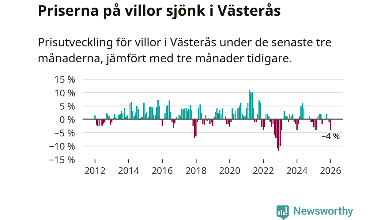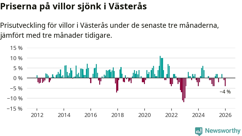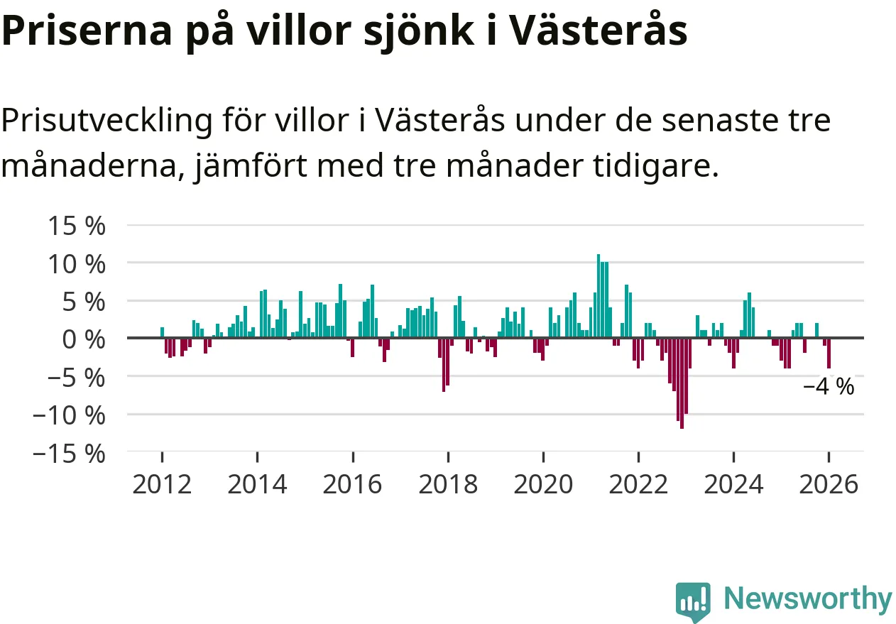 Villapriserna har gått ner i Västerås kommun. Medelpriset på försäljningarna under de senaste tre månaderna visar på en nedgång med 4 procent.