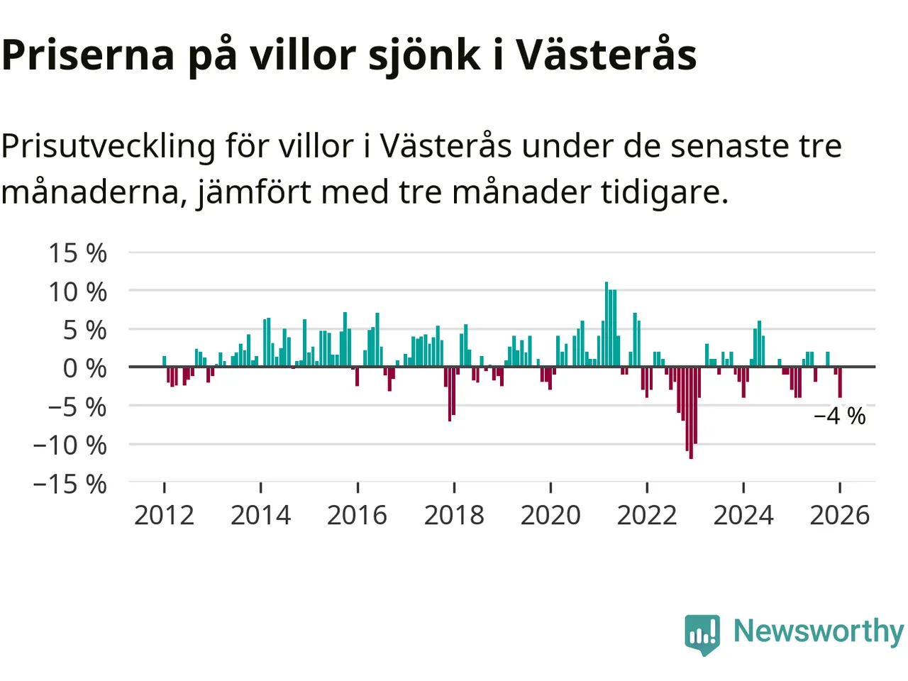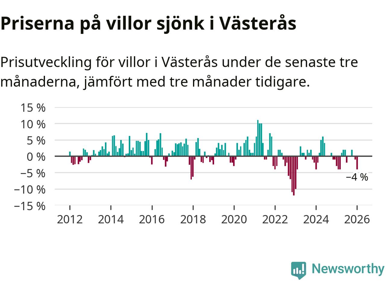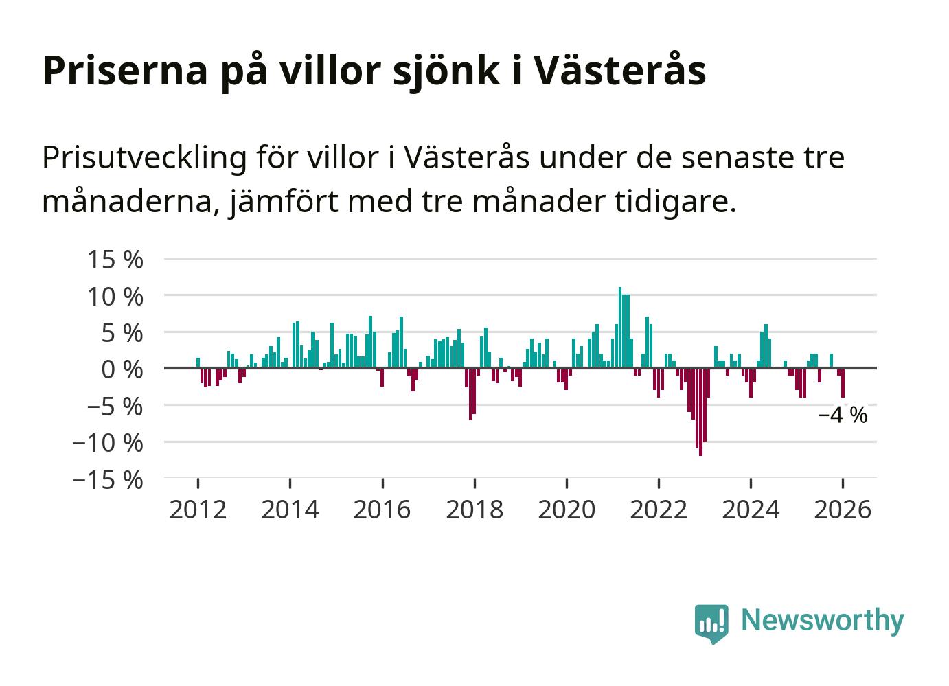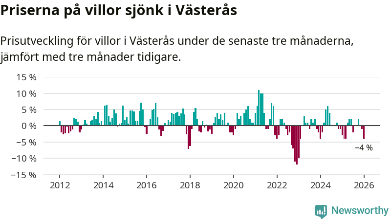 Villapriserna har gått ner i Västerås kommun. Medelpriset på försäljningarna under de senaste tre månaderna visar på en nedgång med 4 procent.